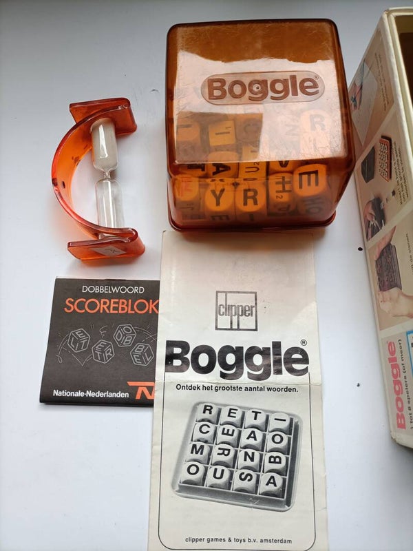 Familiespel Boggle. Schud de letters draai de zandloper om en probeer binnen de tijd zoveel mogelijk woorden te vinden.