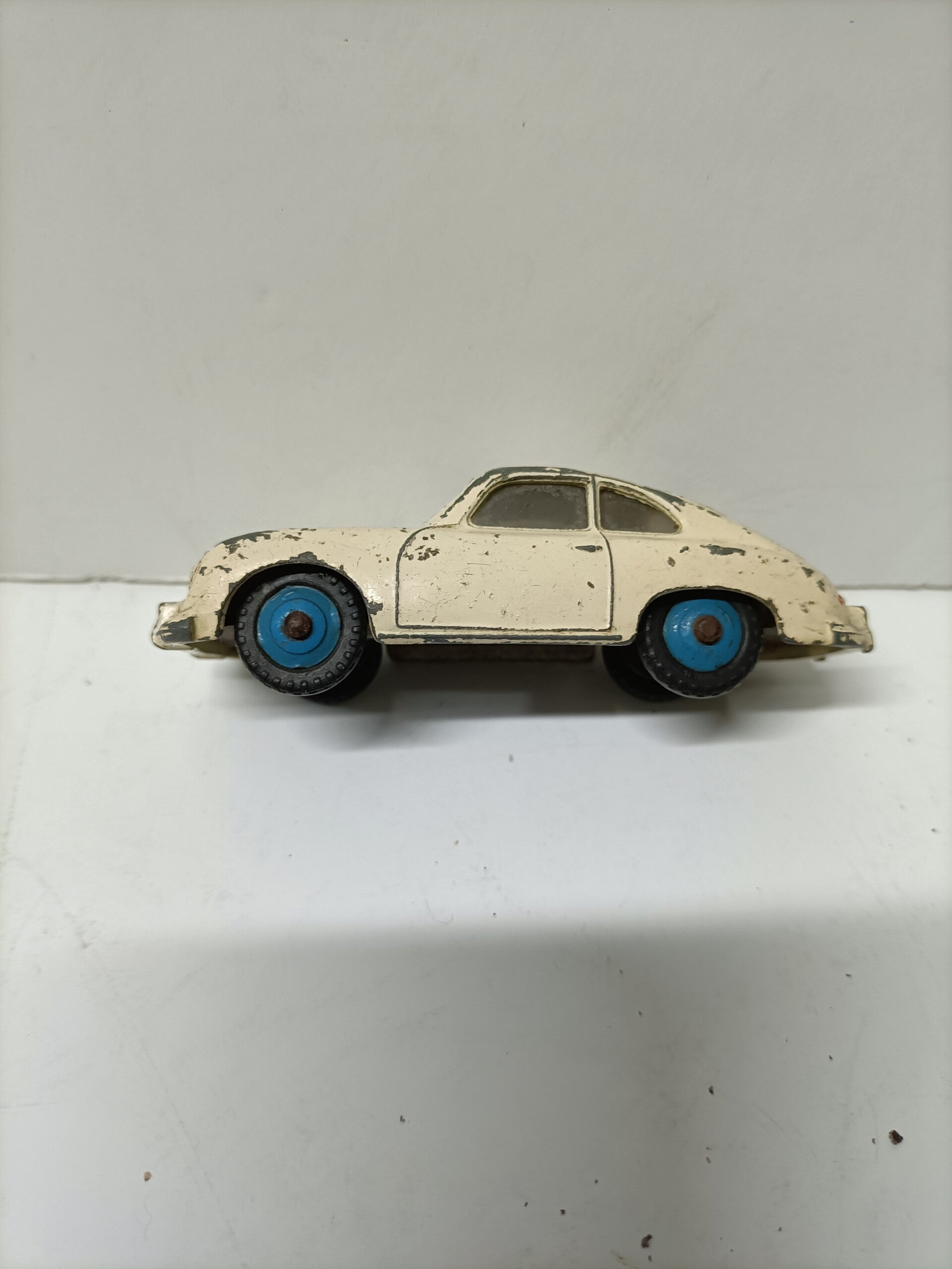 Witte Porsche 356 met blauwe velgen en de originele banden. Originele verf, in bespeelde staat.