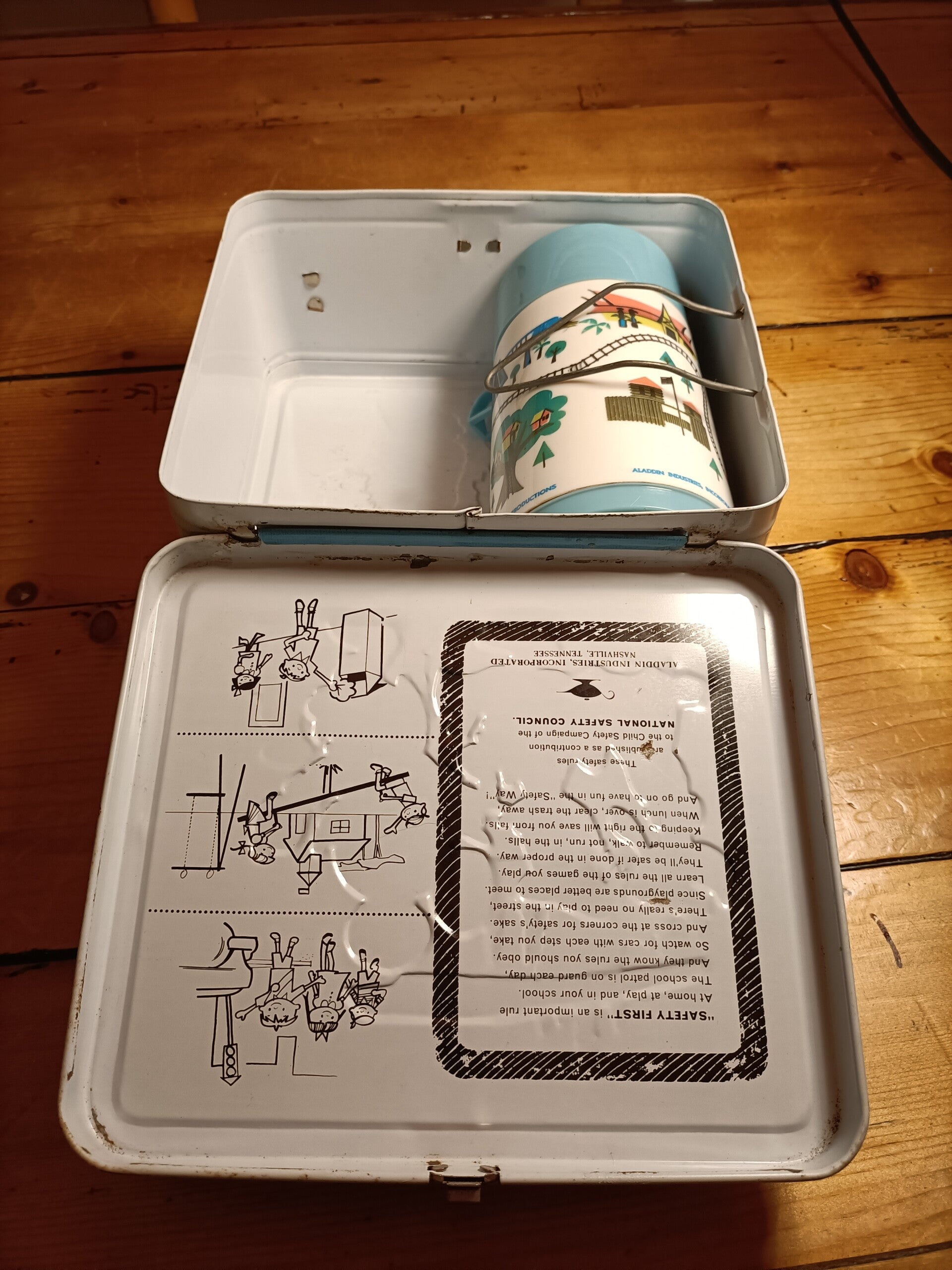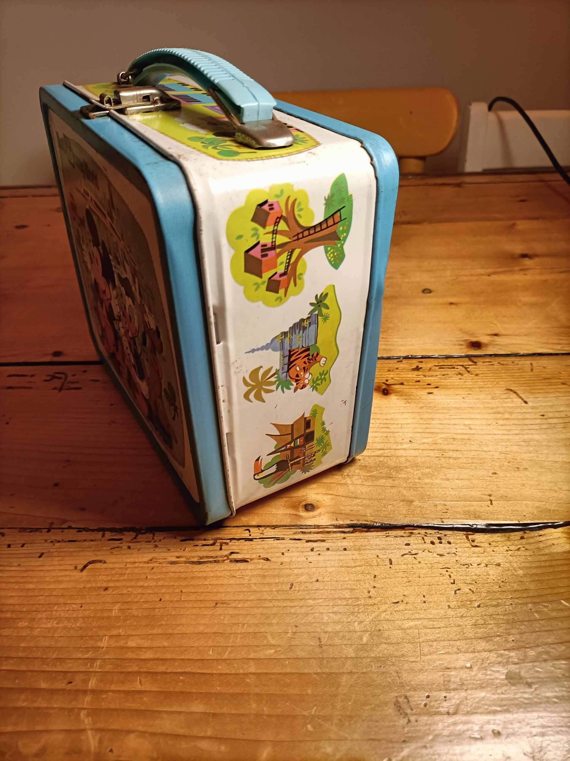 Deze vintage metalen lunchbox uit 1973 is in goede staat.