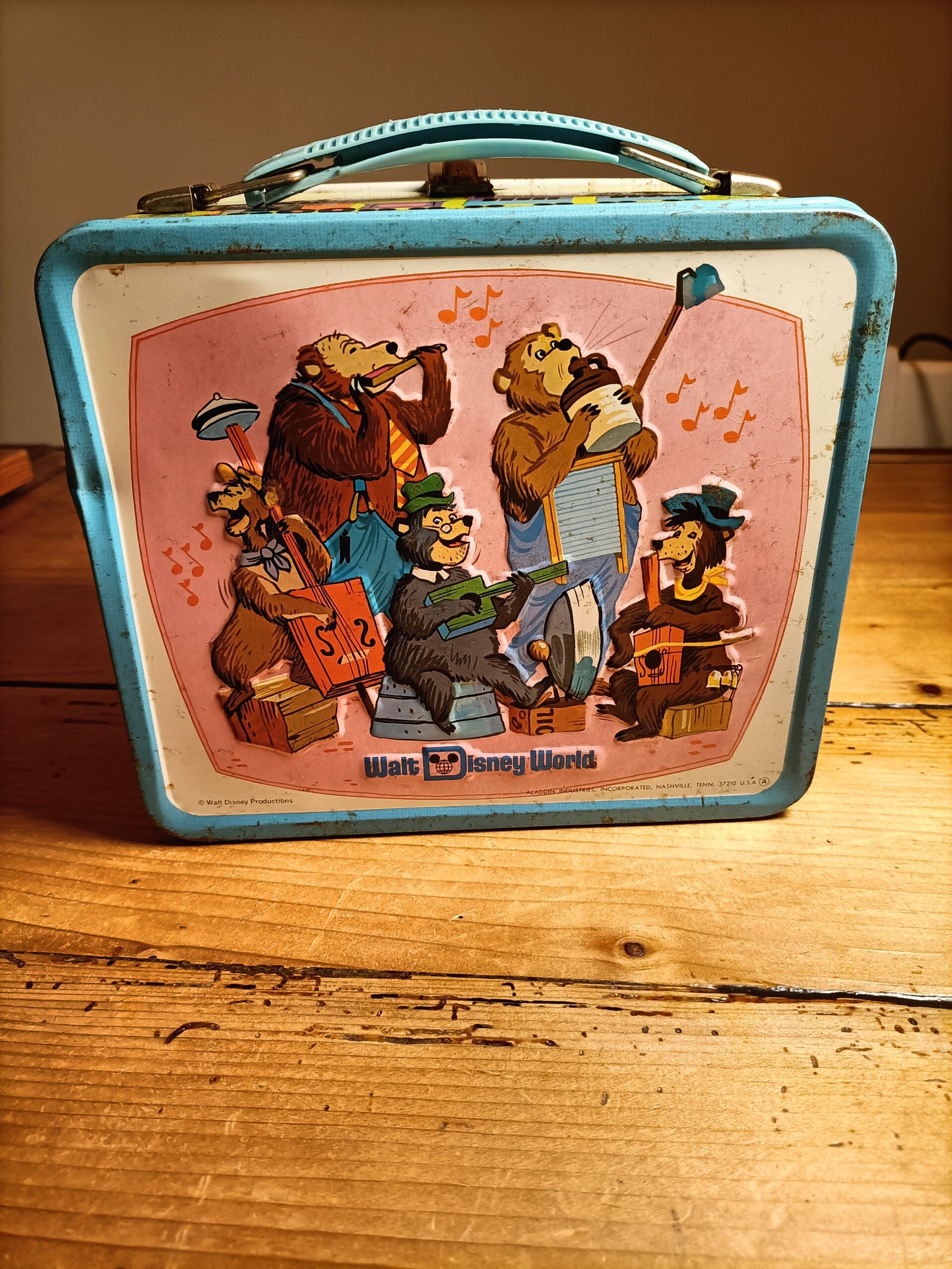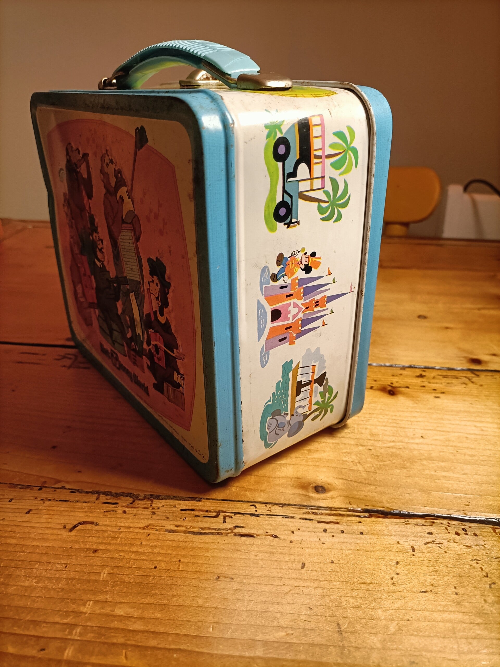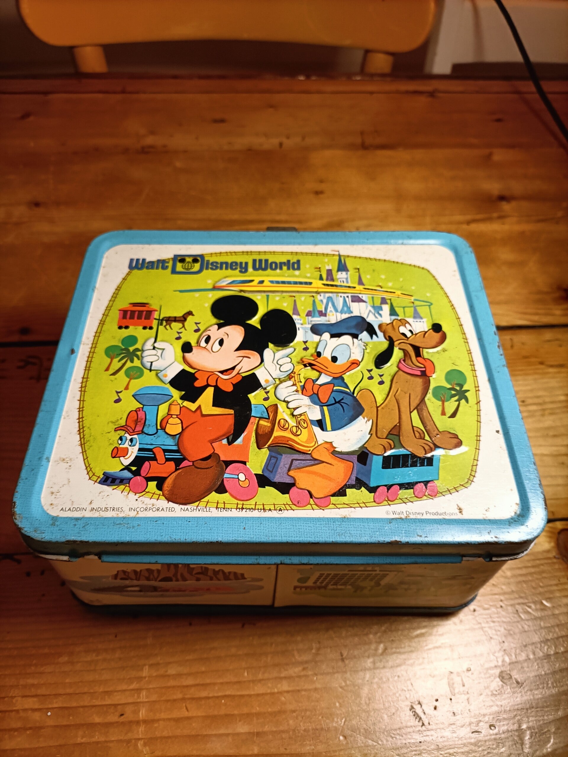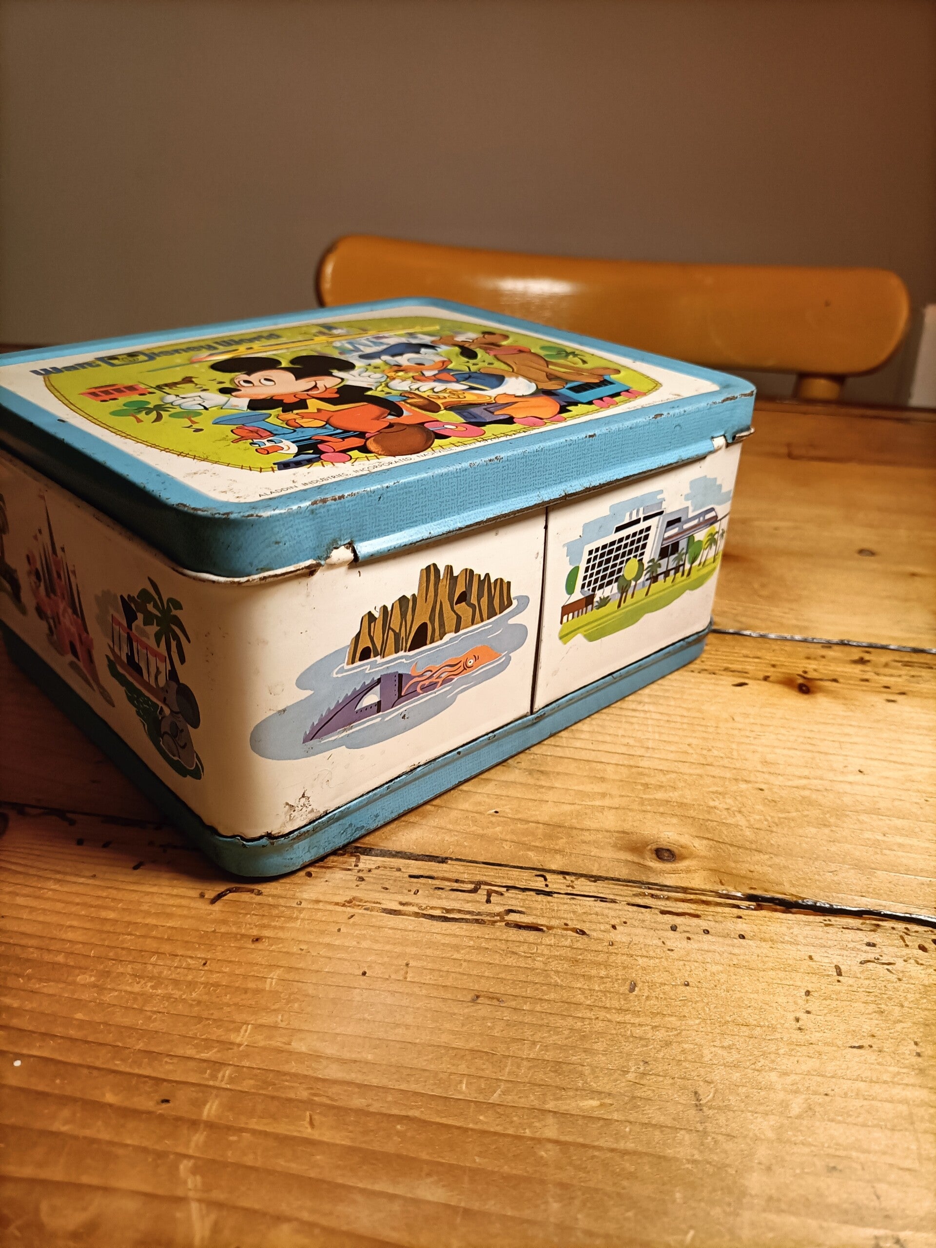 Deze metalen lunchbox met reliëf werd in 1973 door Aladdin vervaardigd ter herdenking van de opening van Disneyworld in Florida, de eerste uitbreiding van de themaparken voorbij Disneyland.