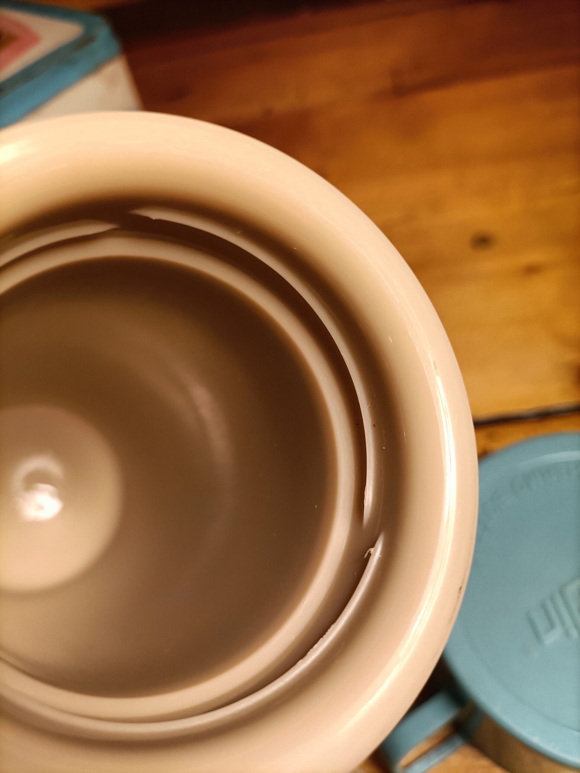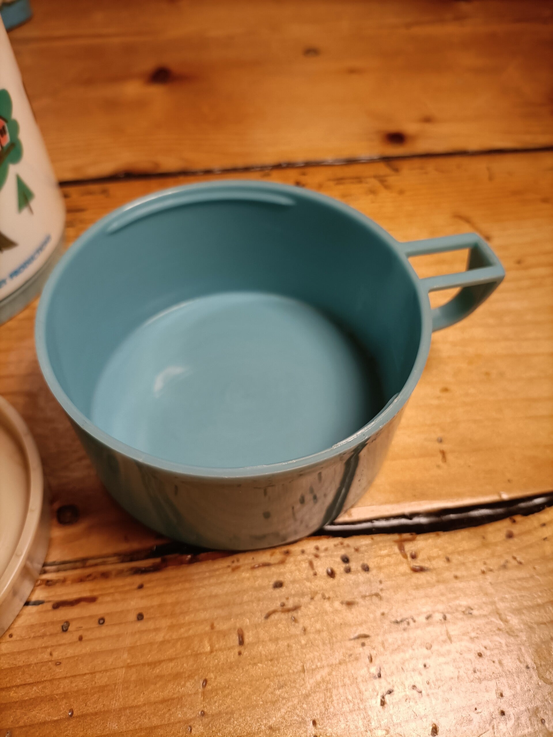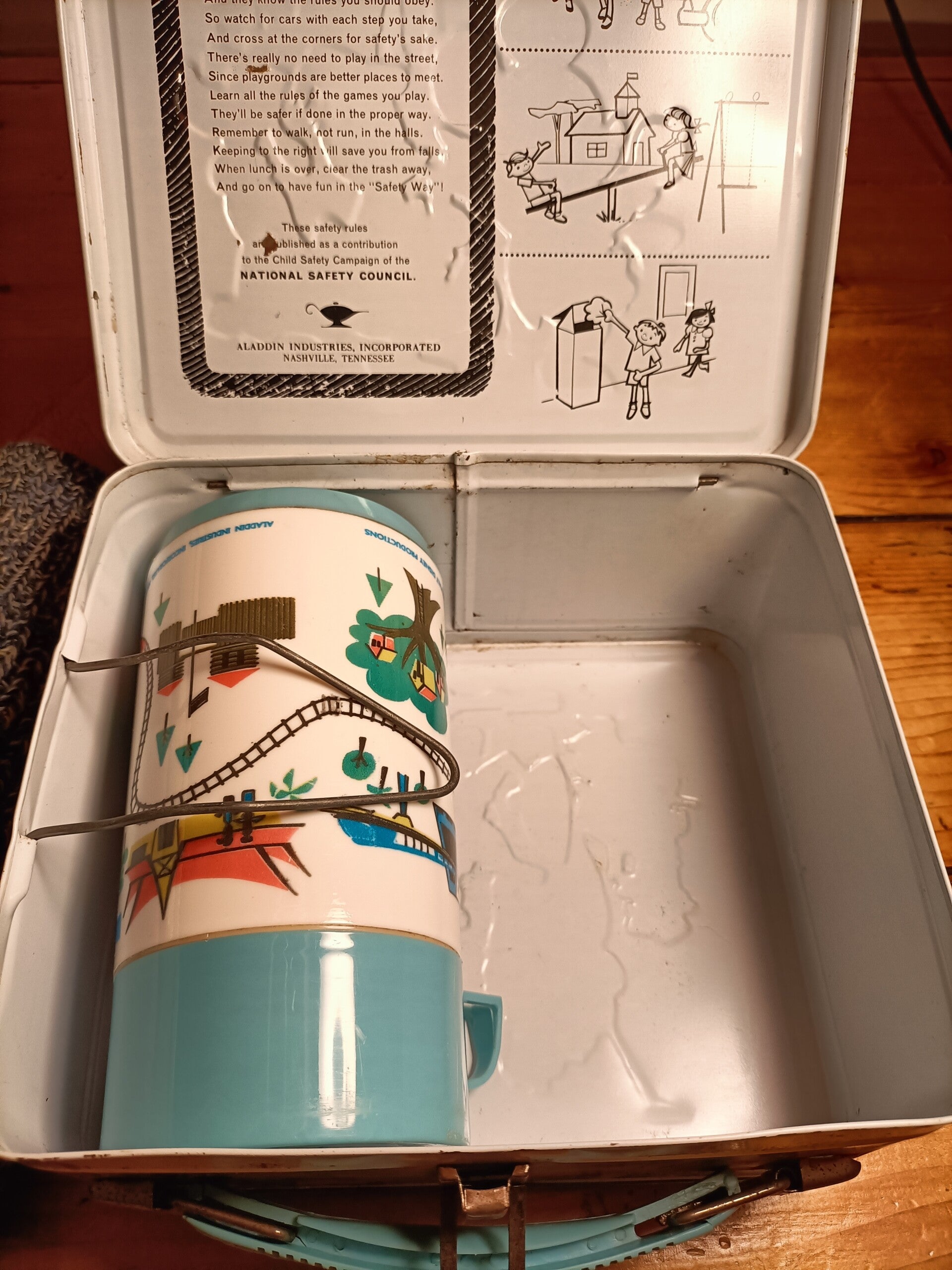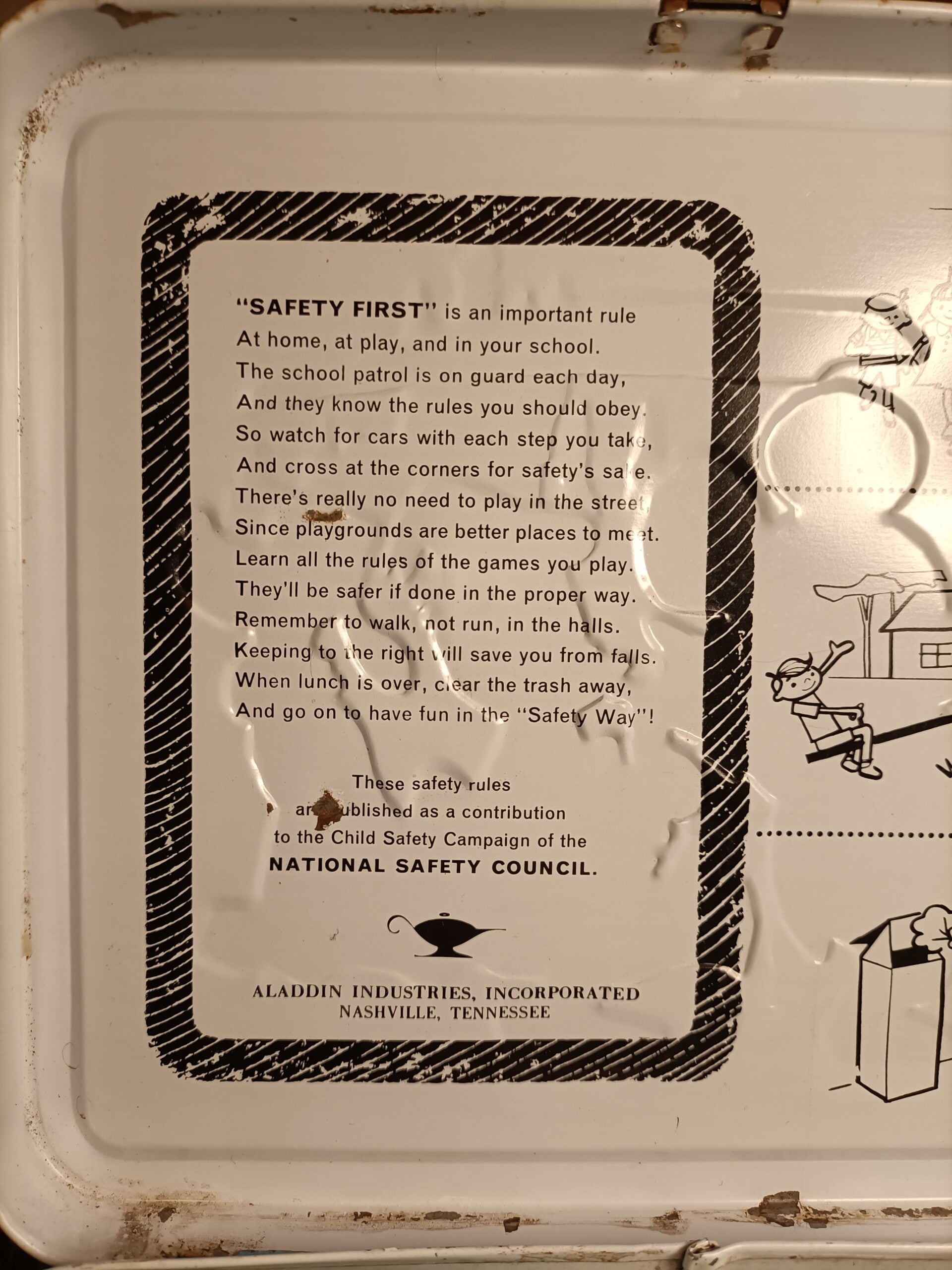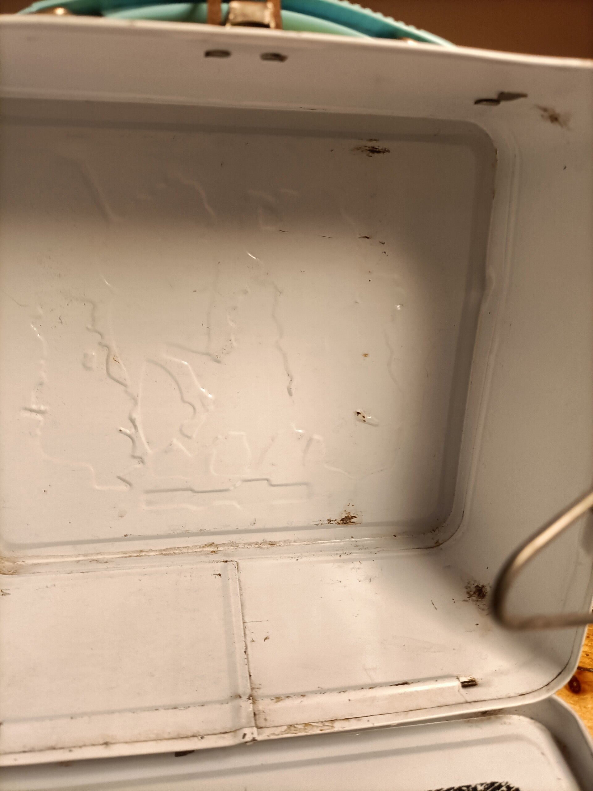 De binnenkant van de lunchbox heeft wat roestslijtageschade, maar niet overdreven gezien het ouder is dan 45 jaar. Zie foto's voor meer informatie. De graphics zijn duidelijk met lichte vervaging en glans. De randen zijn bekrast met wat roest. Binnenin hebben wat slijtage en vlekken met een beetje roest.