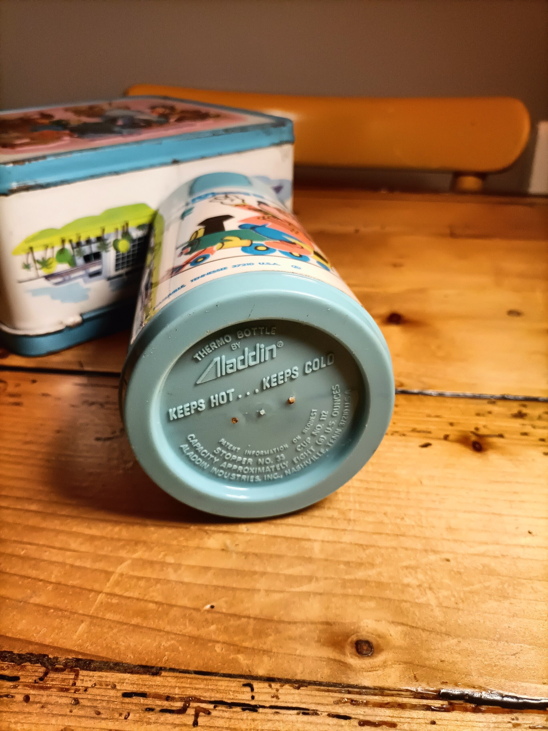 Beide zijden van de reliëfdoos zijn gestempeld "Aladdin Industries, Incorporated, Nashville, Tenn 39210 USA"