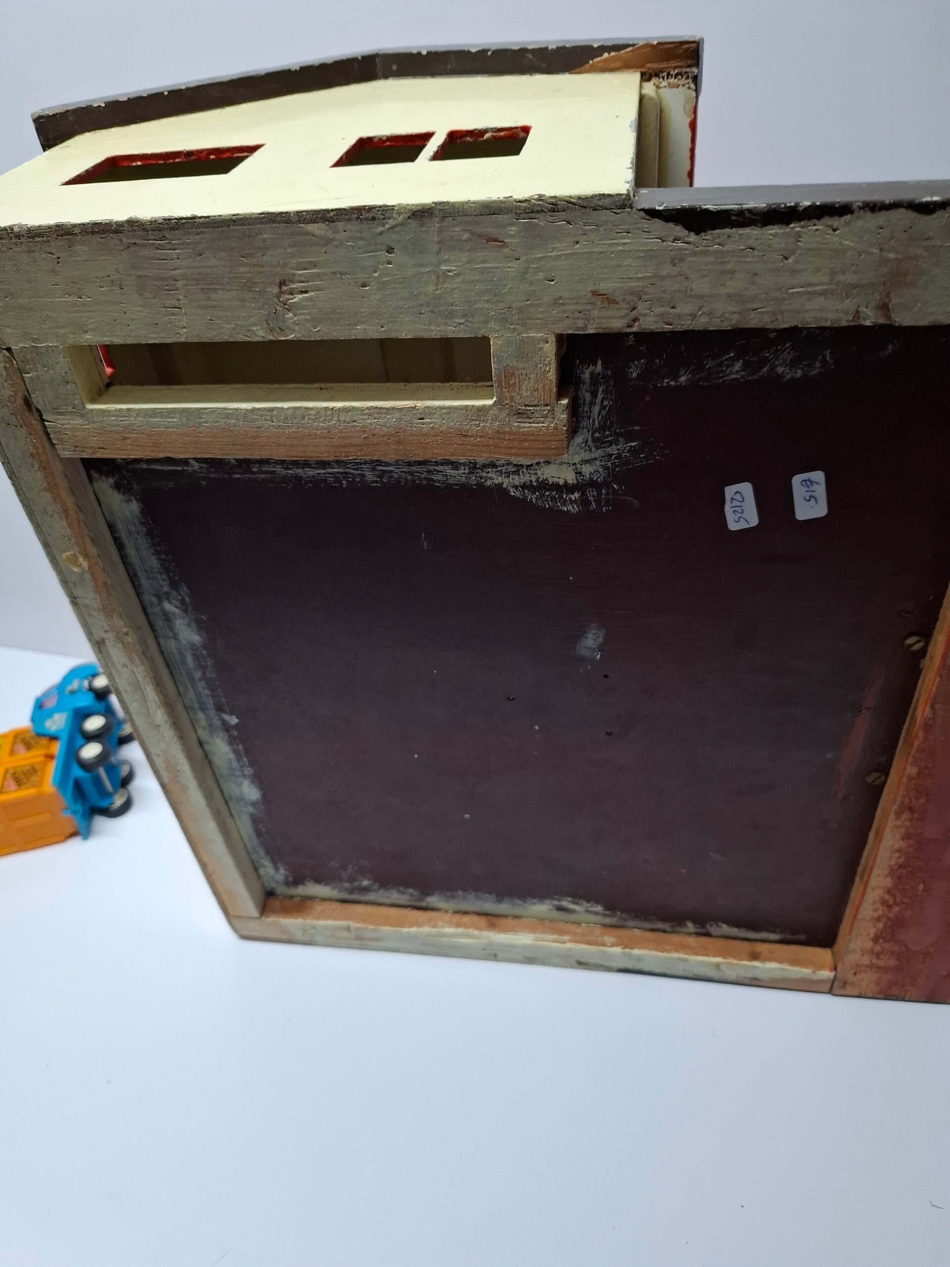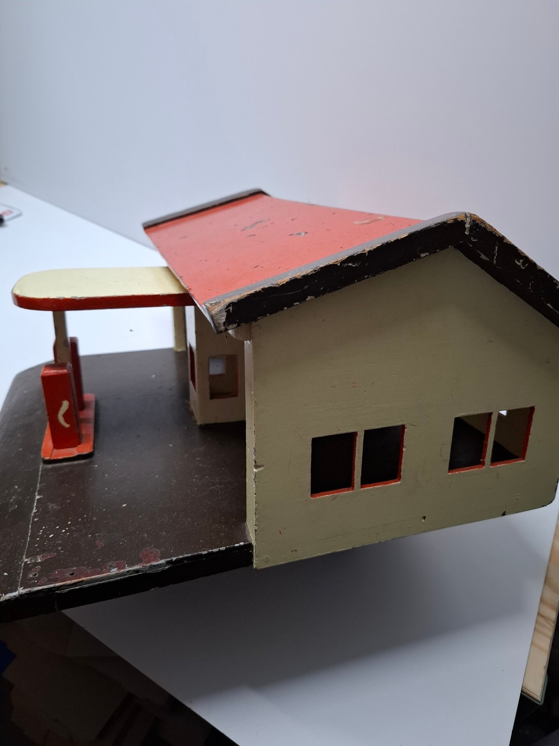 Mooie houten garage. Creme met een rood dak. Met 2 brandstofpompen en een smeerput. Eigenbouw