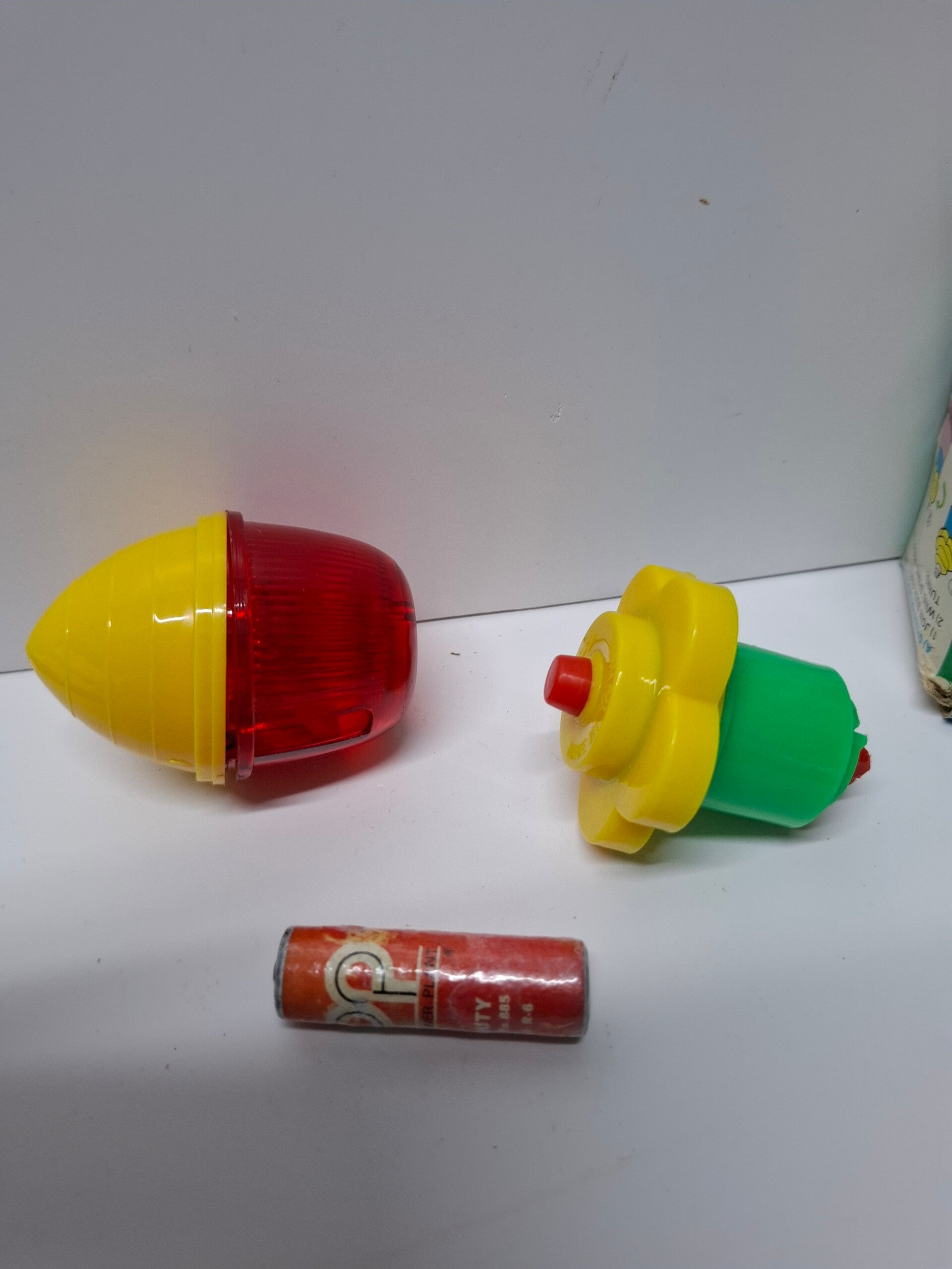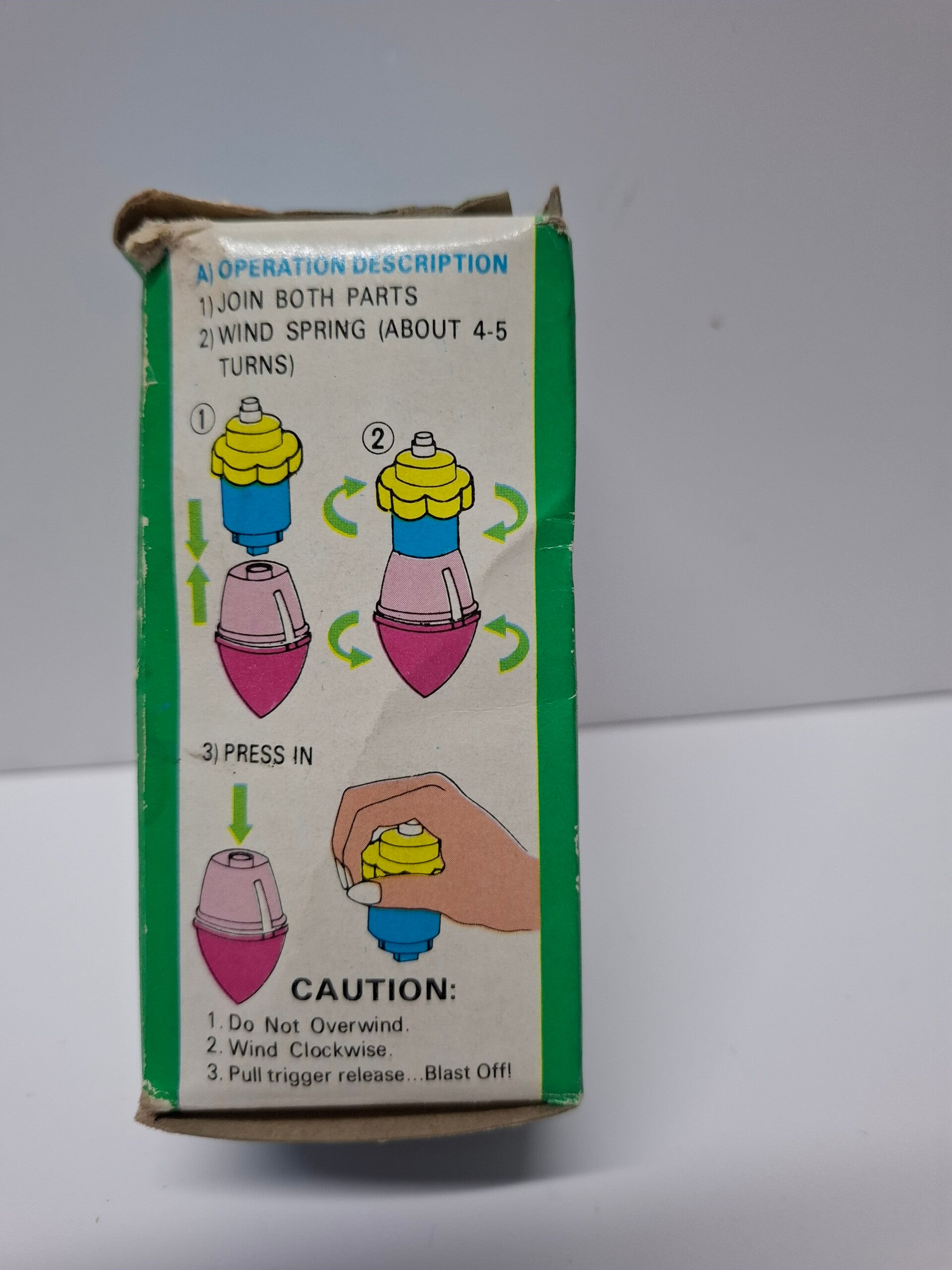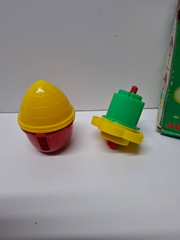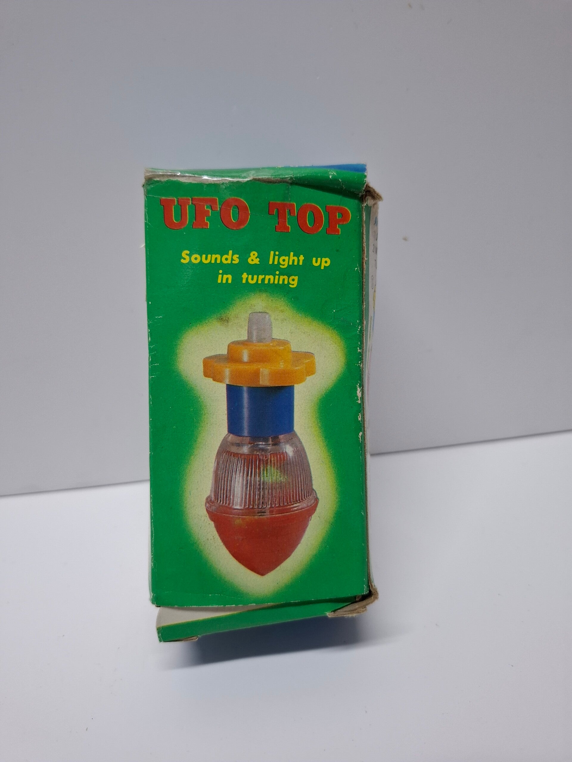 Tol UFO, werkt op 1 aa batterij, wind se Tol op en deze draait rond met een gierend geluid en licht. In het doosje.