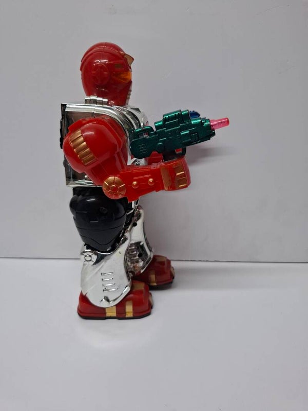 Zilveren robot met rode armen en zwart met rood lijf en benen. Heeft 2 pistolen.