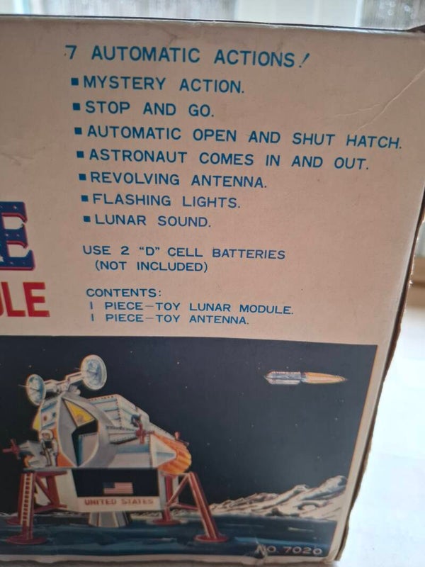 “Yonezawa Apollo 2”, “American Eagle Lunar Module vintage”, “Apollo speelgoed jaren 60”, “ruimtevaart speelgoed Japan”, “vintage tinplate NASA toy”