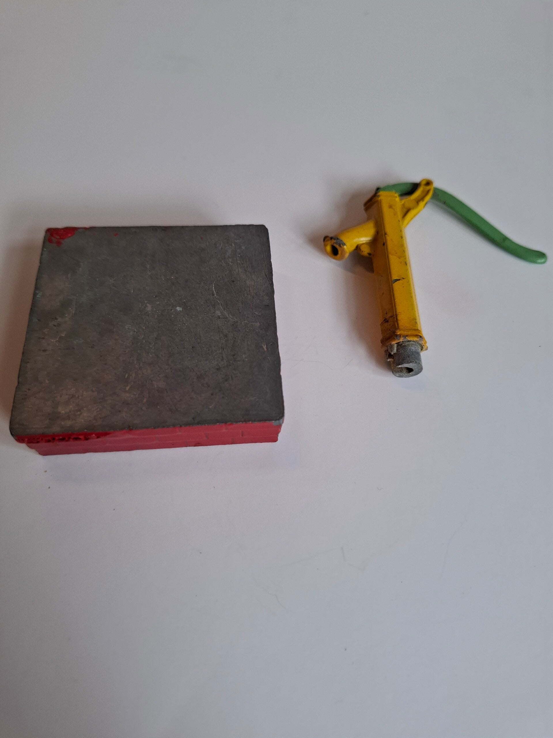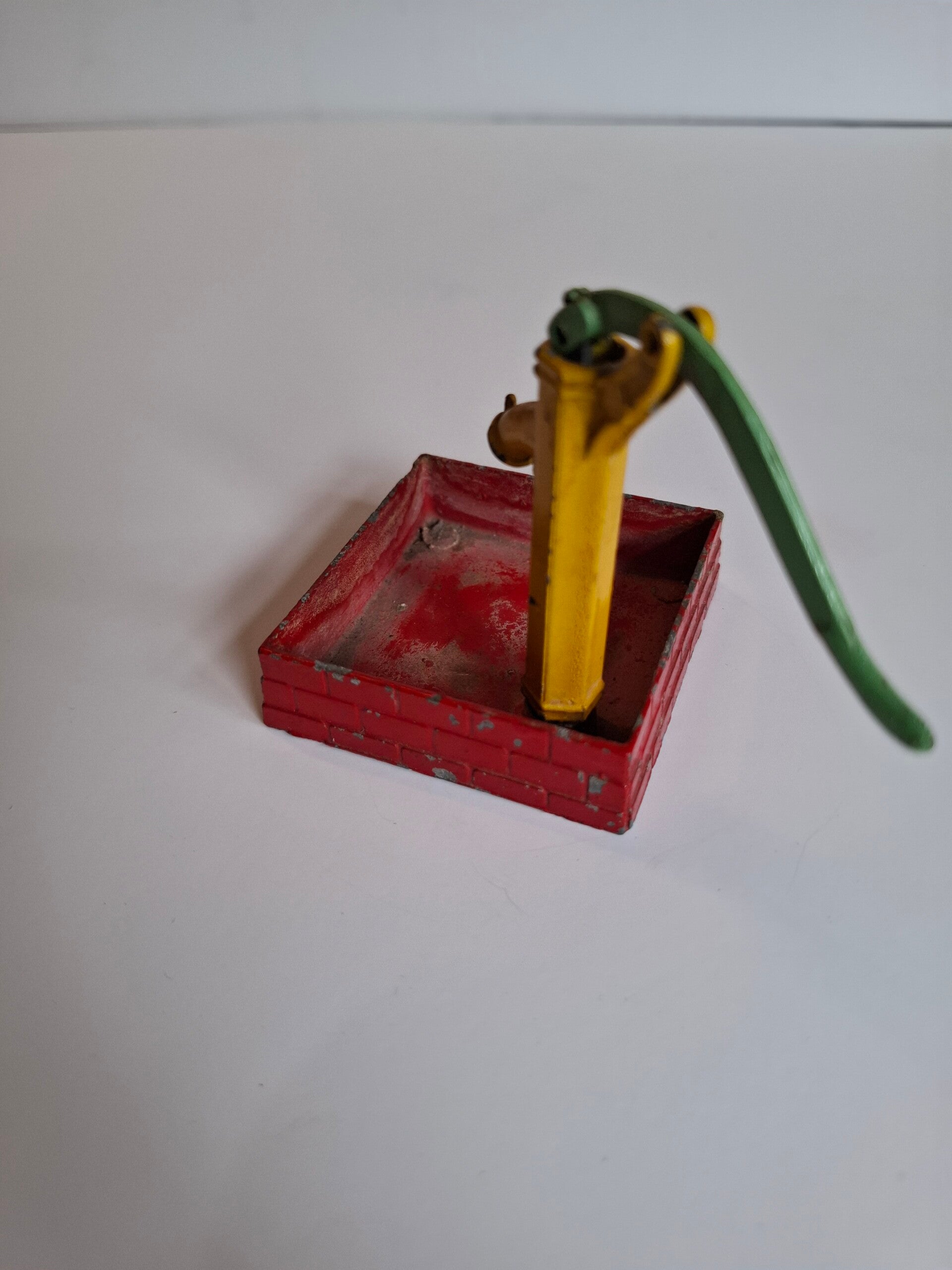 Groengele waterpomp in rode vak. The old village pump. Mist de emmer. Werking pomp niet getest.