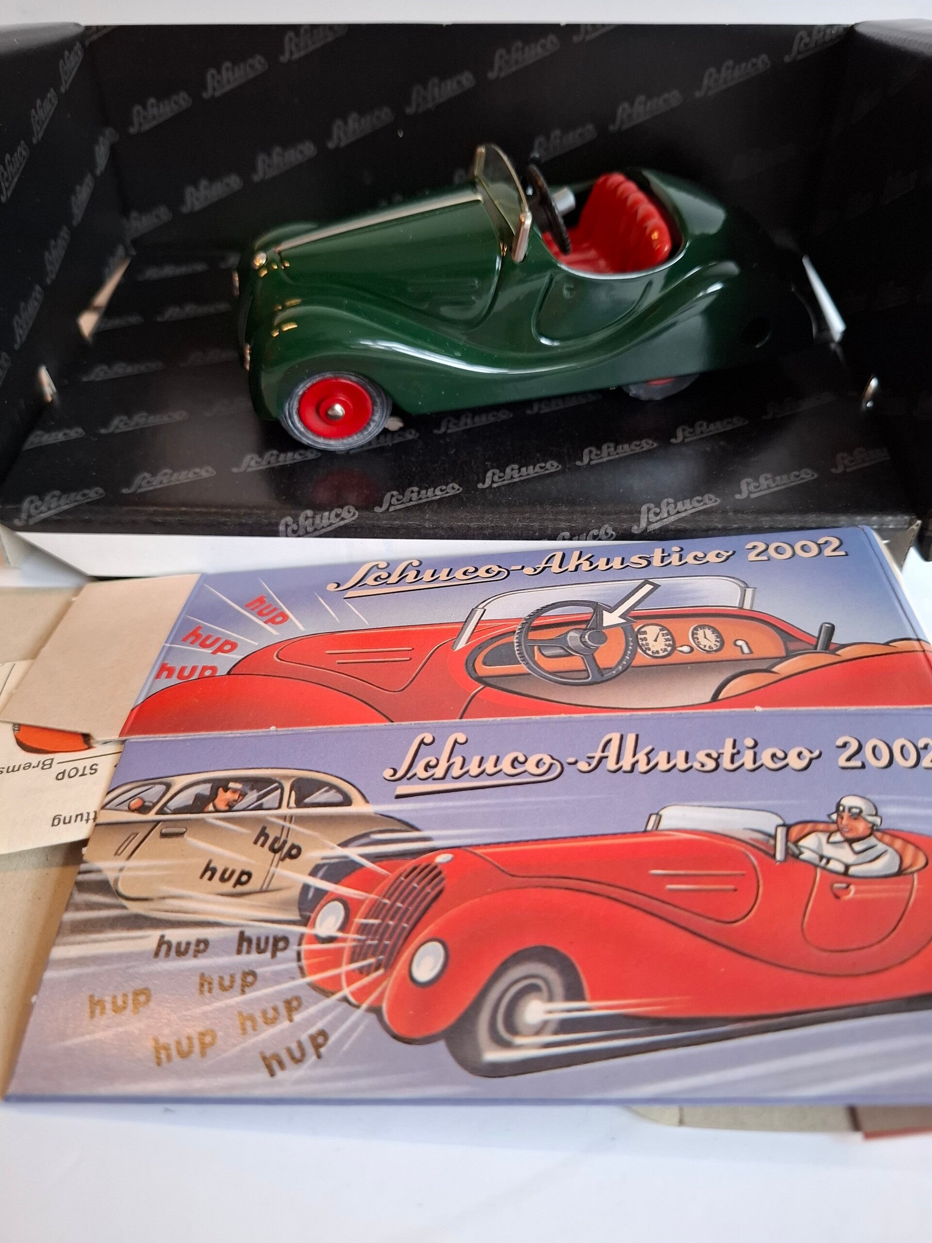 Dit is een prachtige donkergroene replica van een Akustico speelgoedauto uit 2002, zonder ook maar één gebrek. Hij is vrijwel perfect en os de replica van het origineel wat dateert uit de jaren 60. Hij beschikt over twee uurwerken, één om de auto te laten rijden en de andere om de claxon te bedienen. Het is een favoriet onder Schuco-verzamelaars. Wordt geleverd met een Schuco-sleutel en doos.