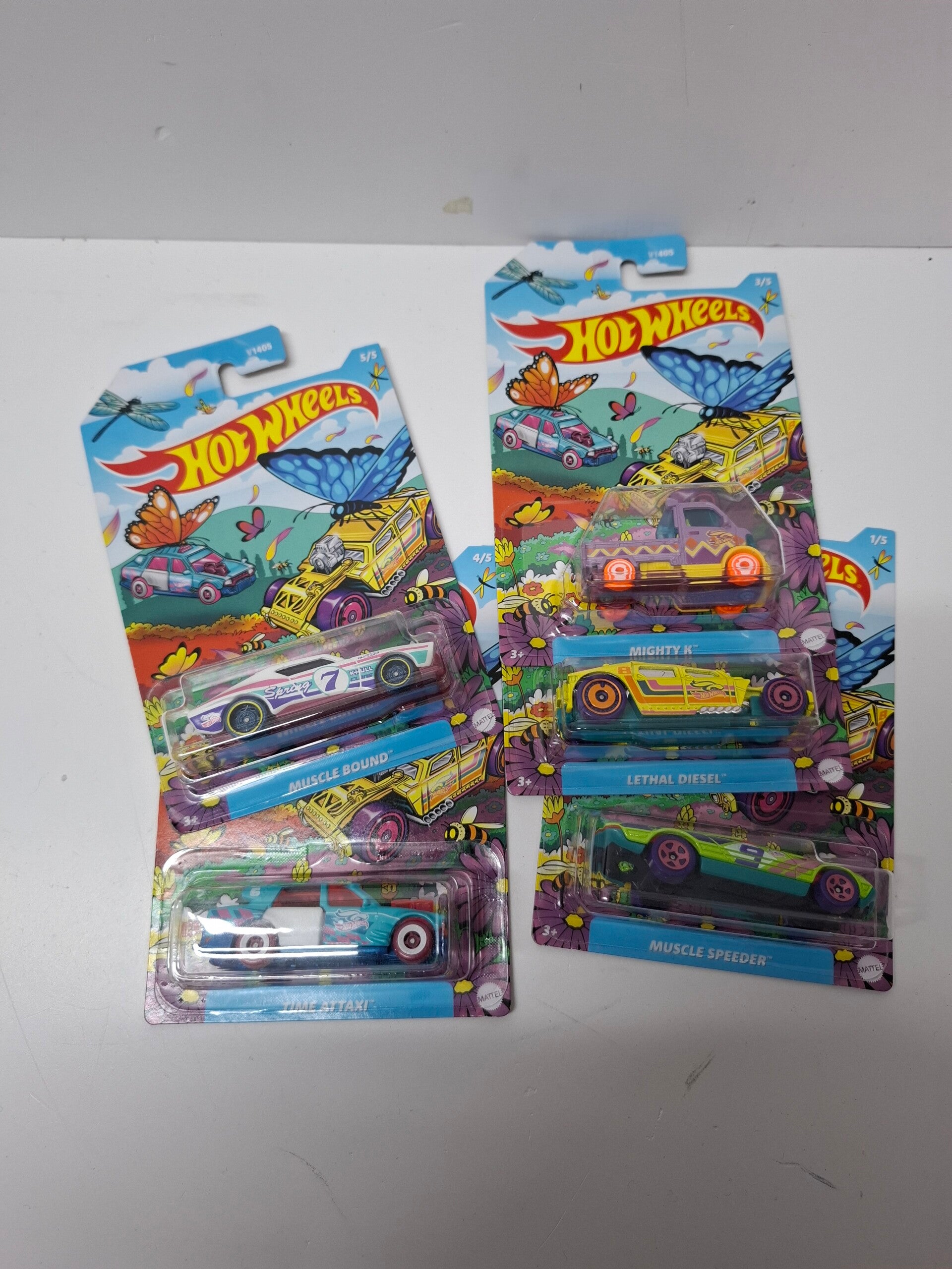 Set van 5 kleurrijke hotwheels, Muscle Bound, Time Attaxi, Muscle Speeder, Lethal diesel en Mighty K.