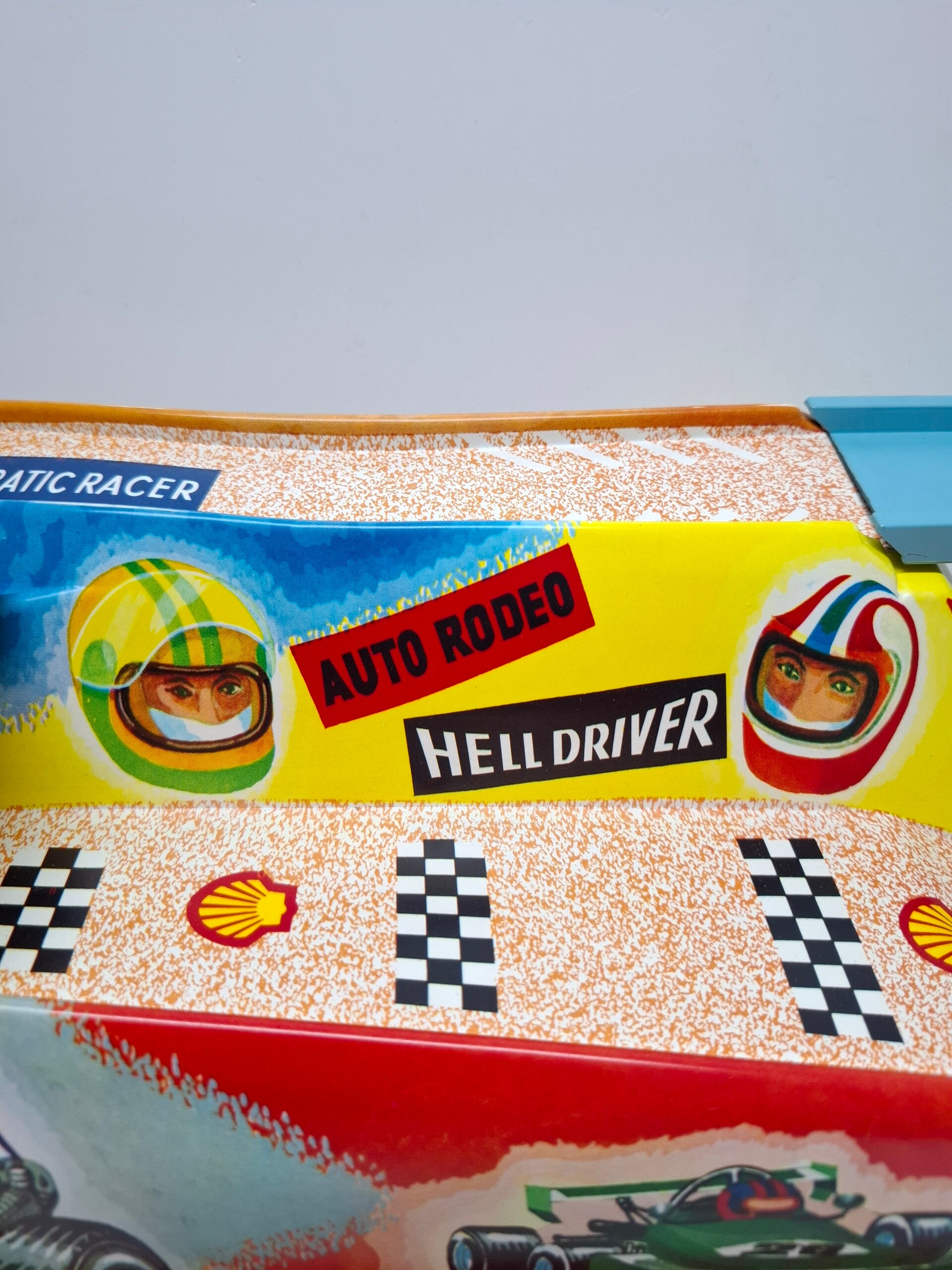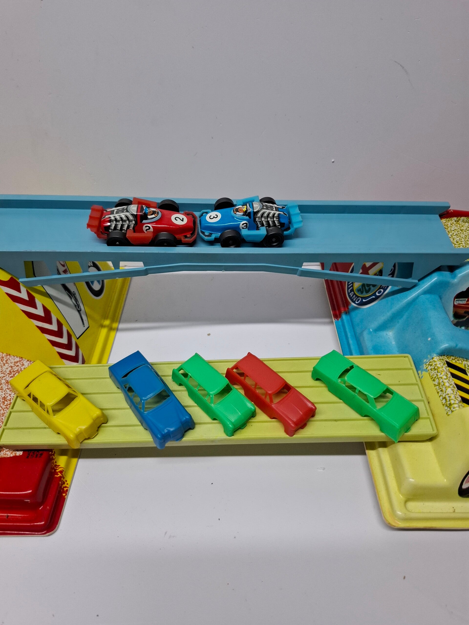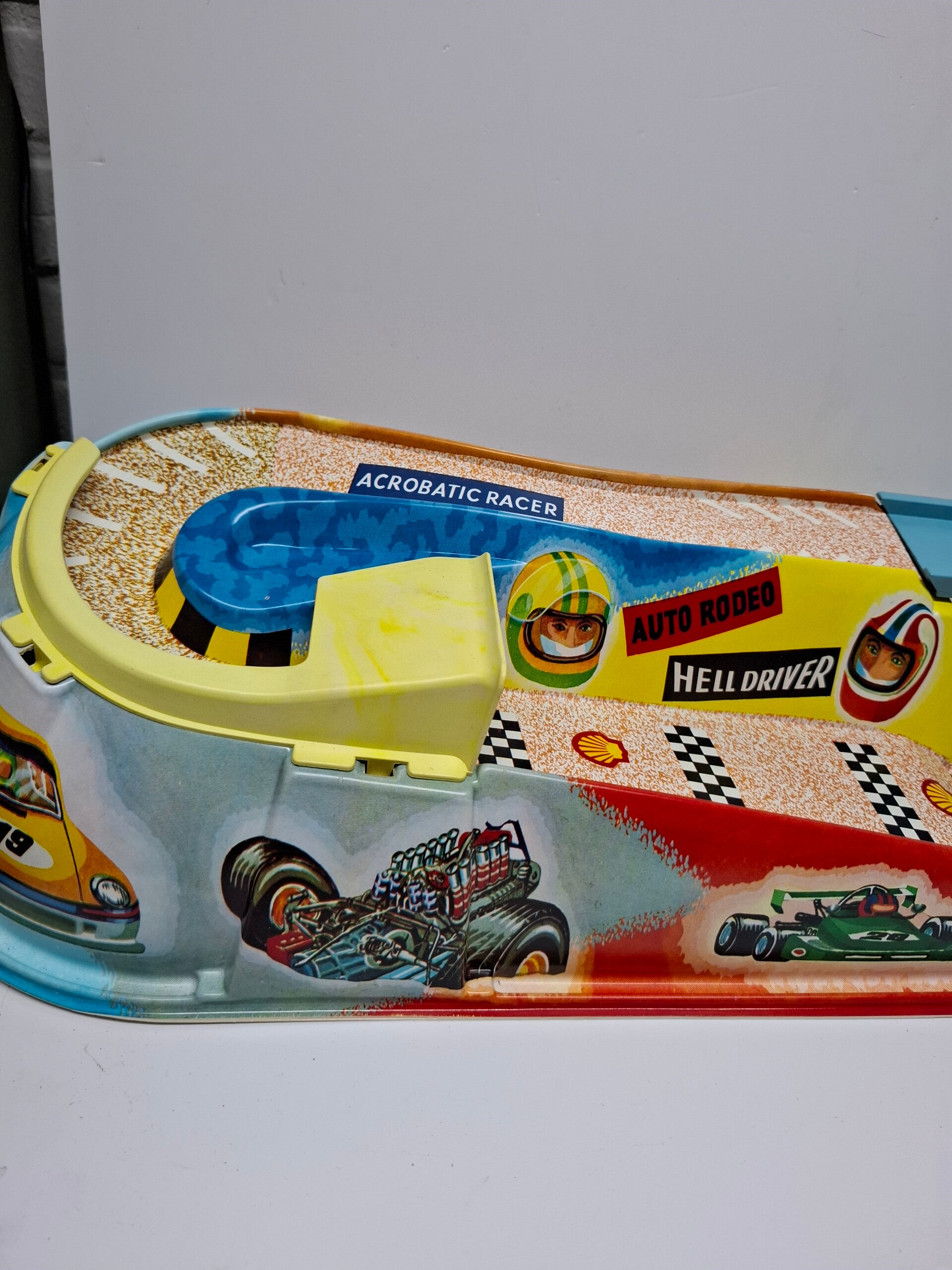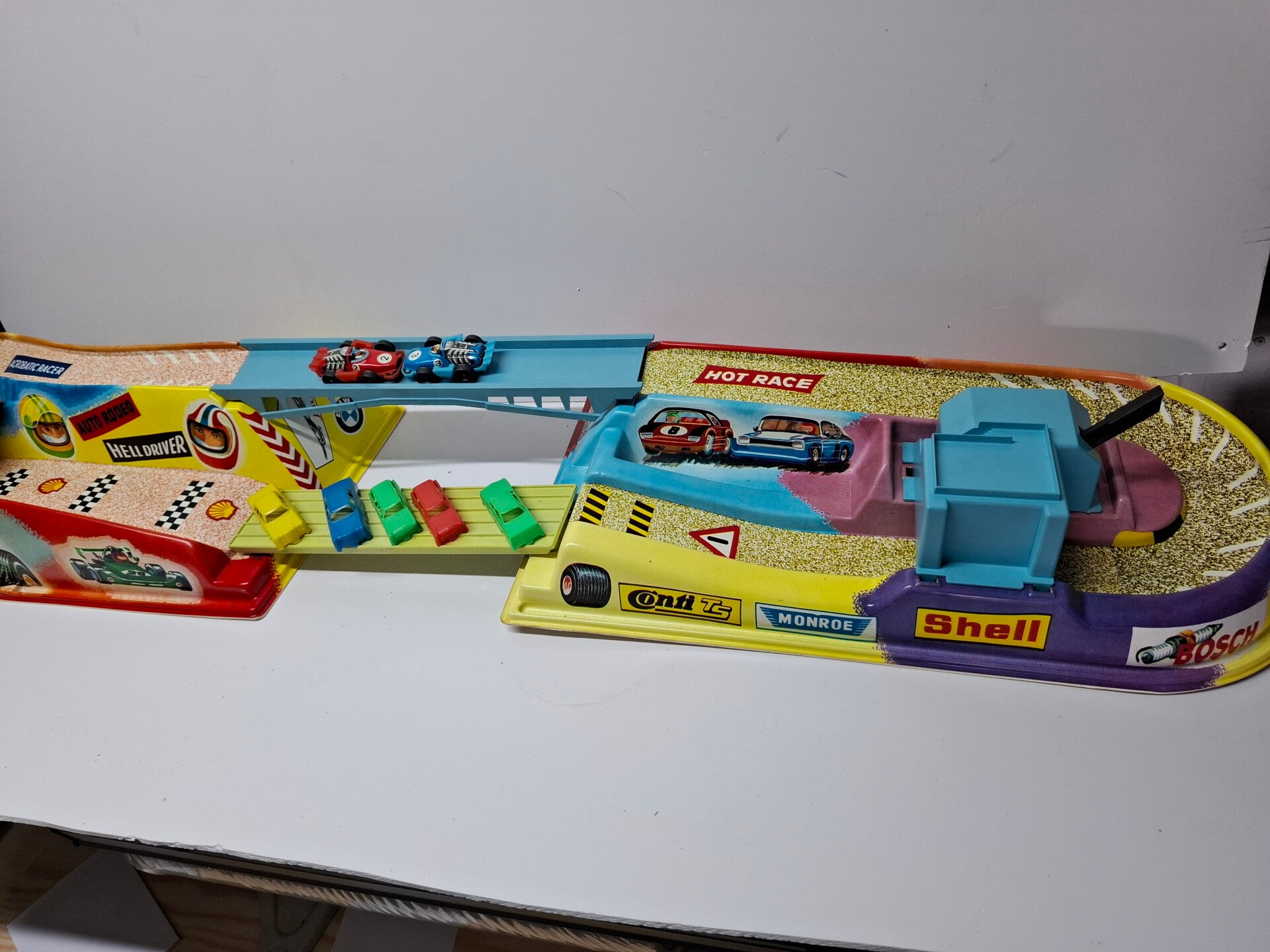 Technofix autobaan met 2 autos en meerdere wrakken, Technofix Hell Driver Rodeo-circuit. Uitgevouwen 105 cm bij 22 cm. De starthendel werkt goed. De doos is beschadigd.