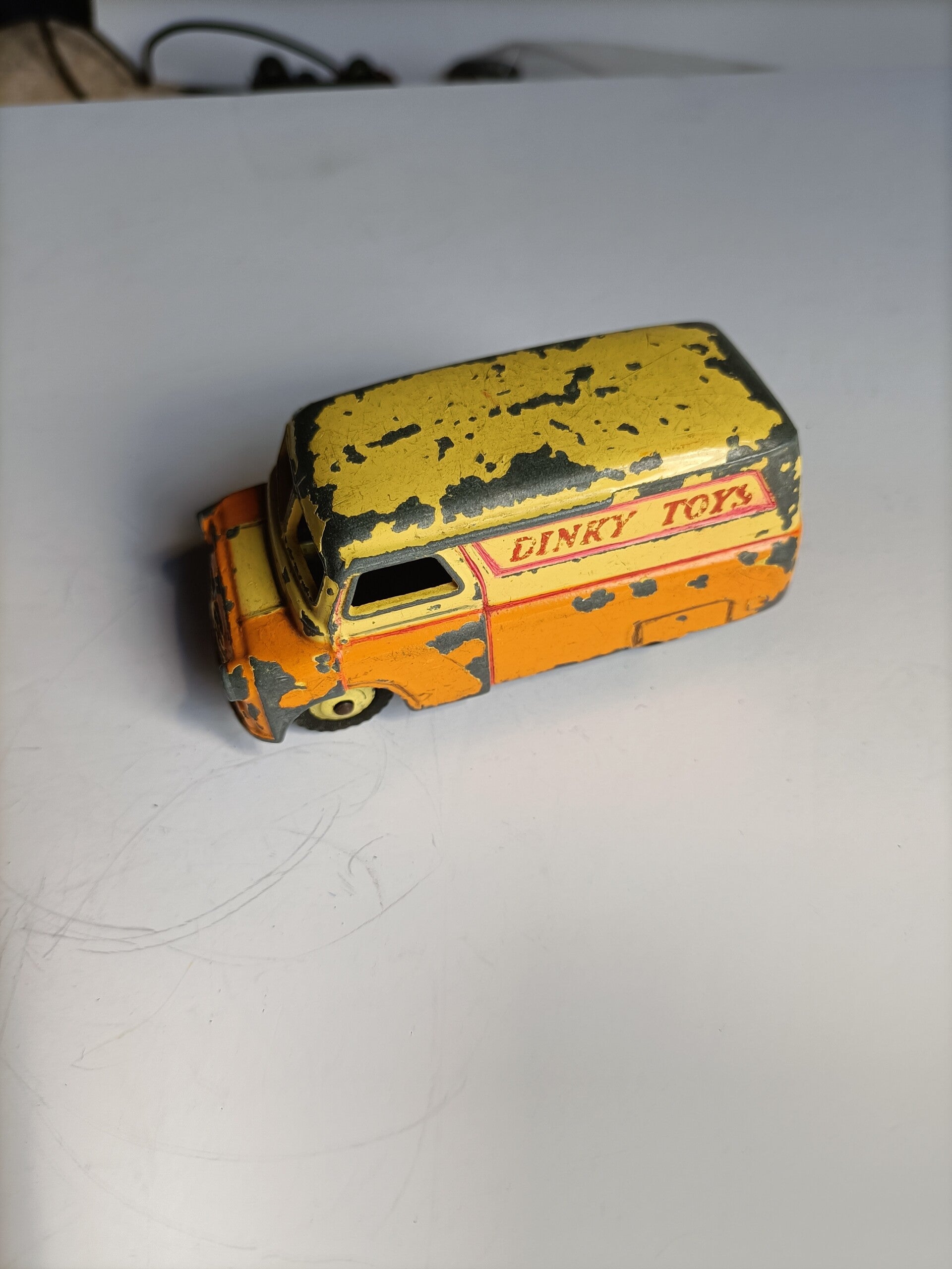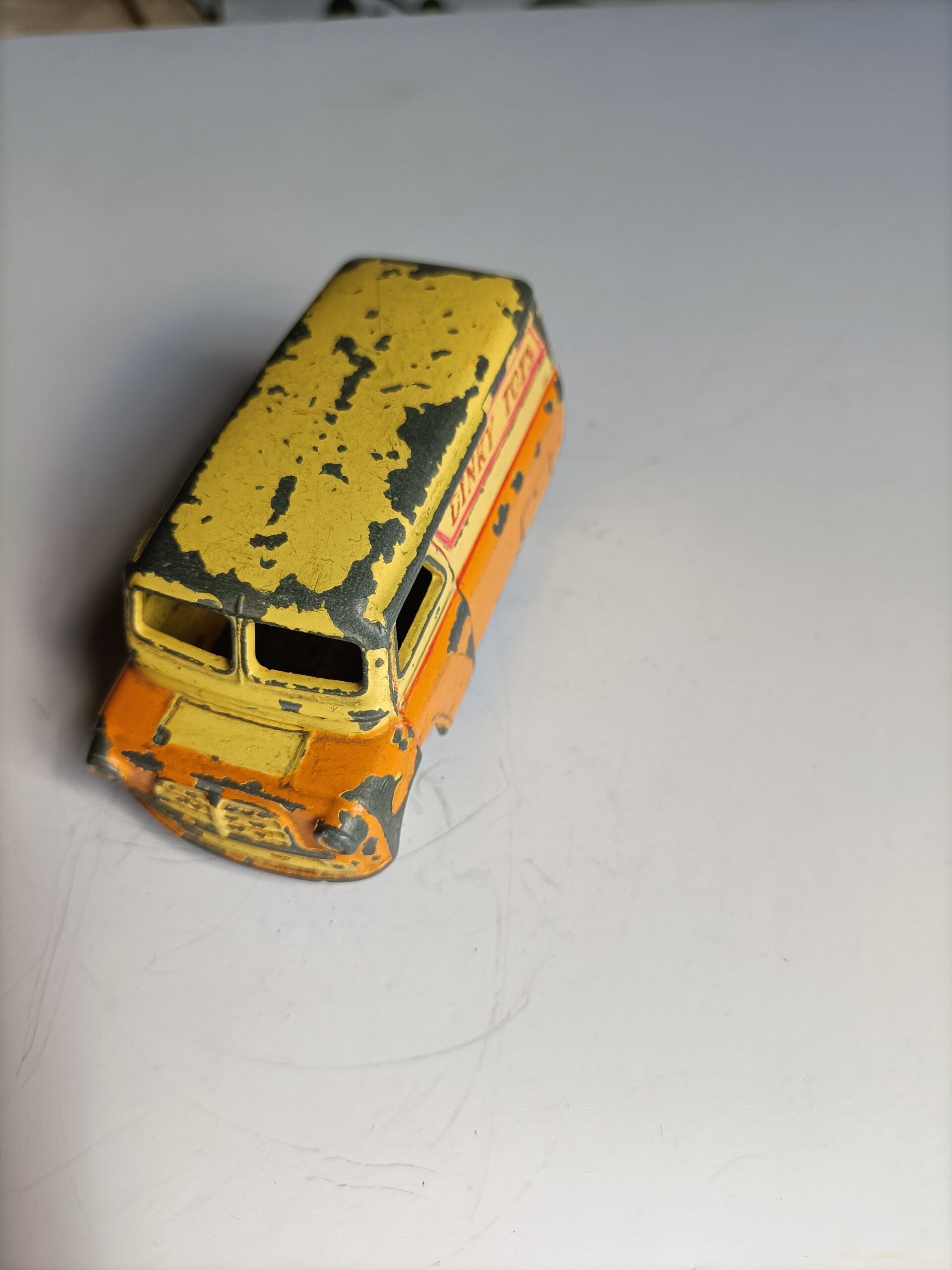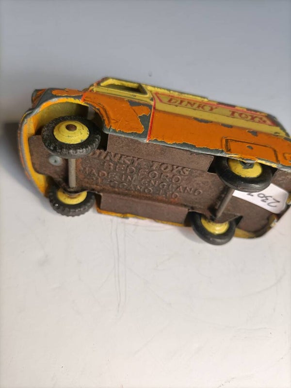 Dinky Toys Bedford bus, geel en Oranje met Dinky Toys reclame erop