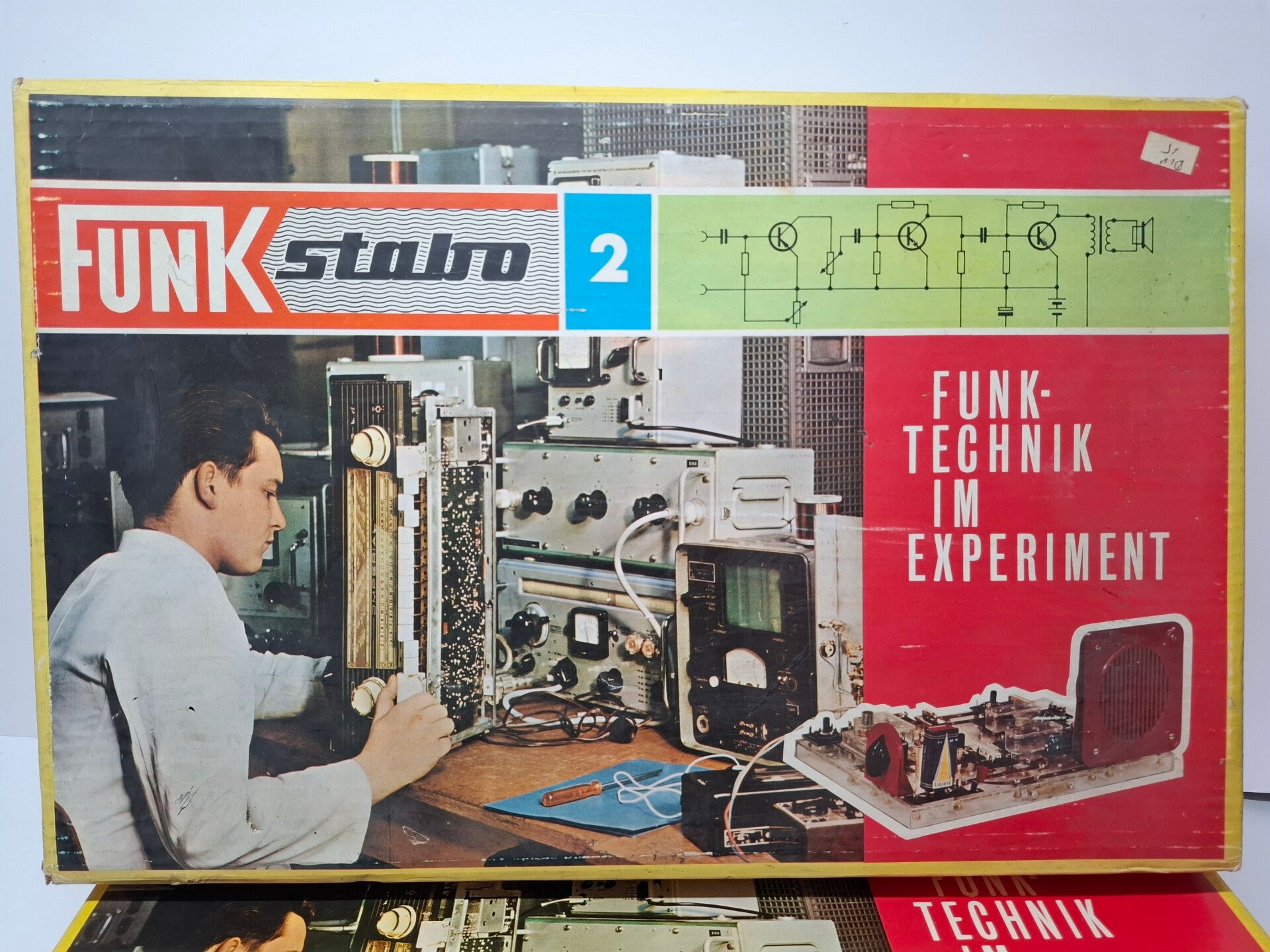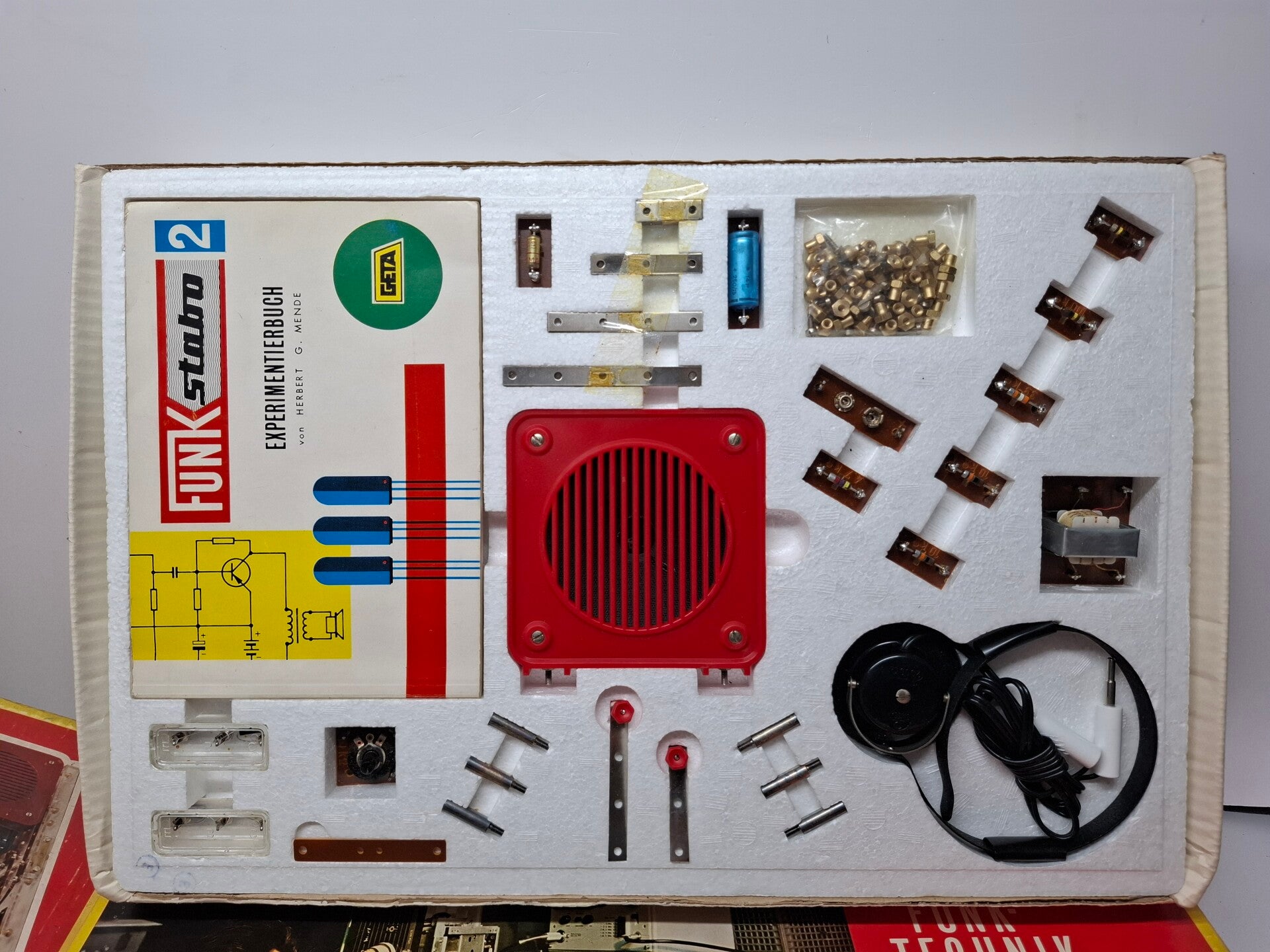 Dit is de uitbreidingsset voor de eerste Funkstabo-radio en bevat naast een extra hoofdtelefoon nu ook een luidspreker en twee extra transistors (OC70 en OC71) voor radio-experimenten.