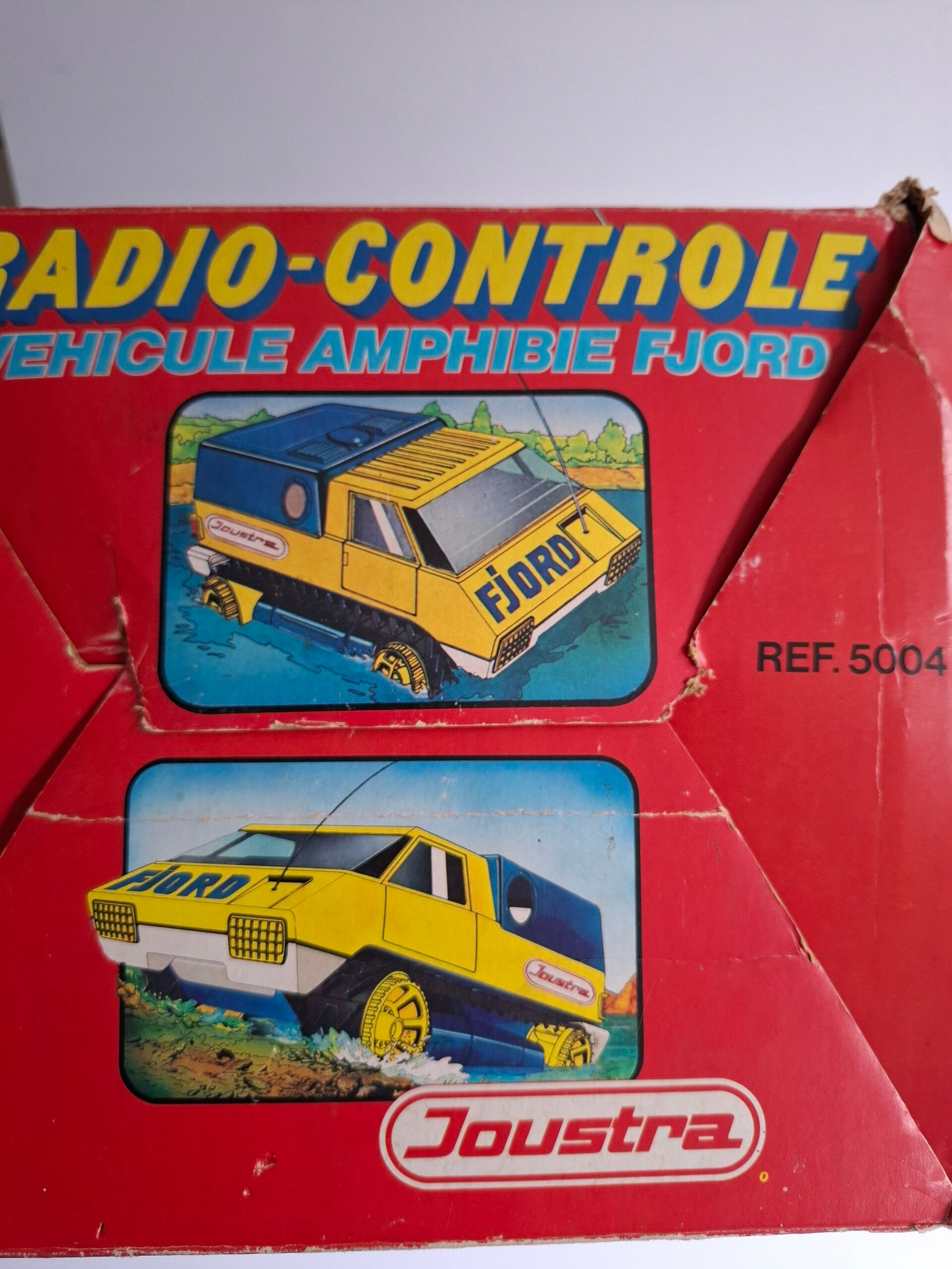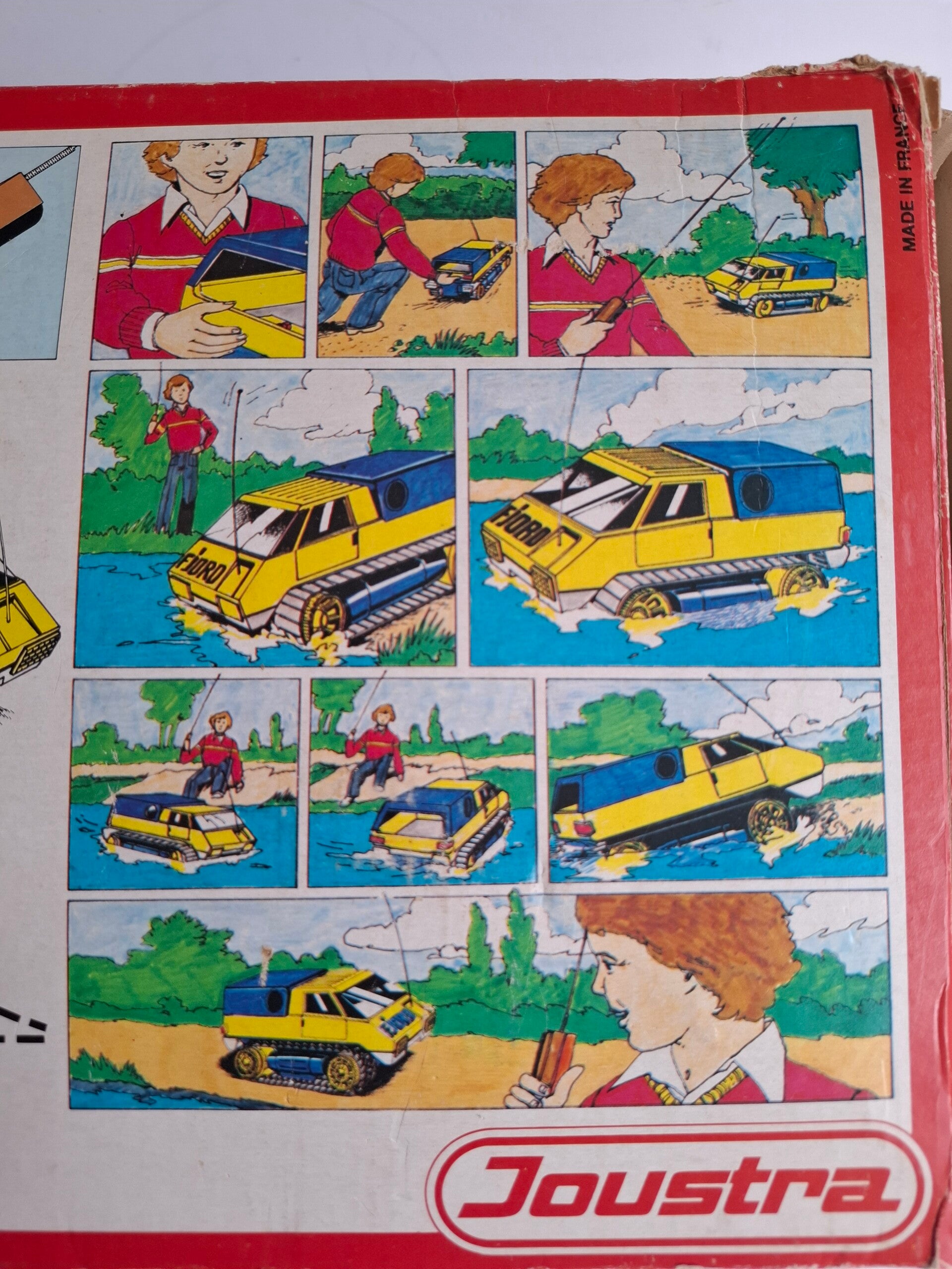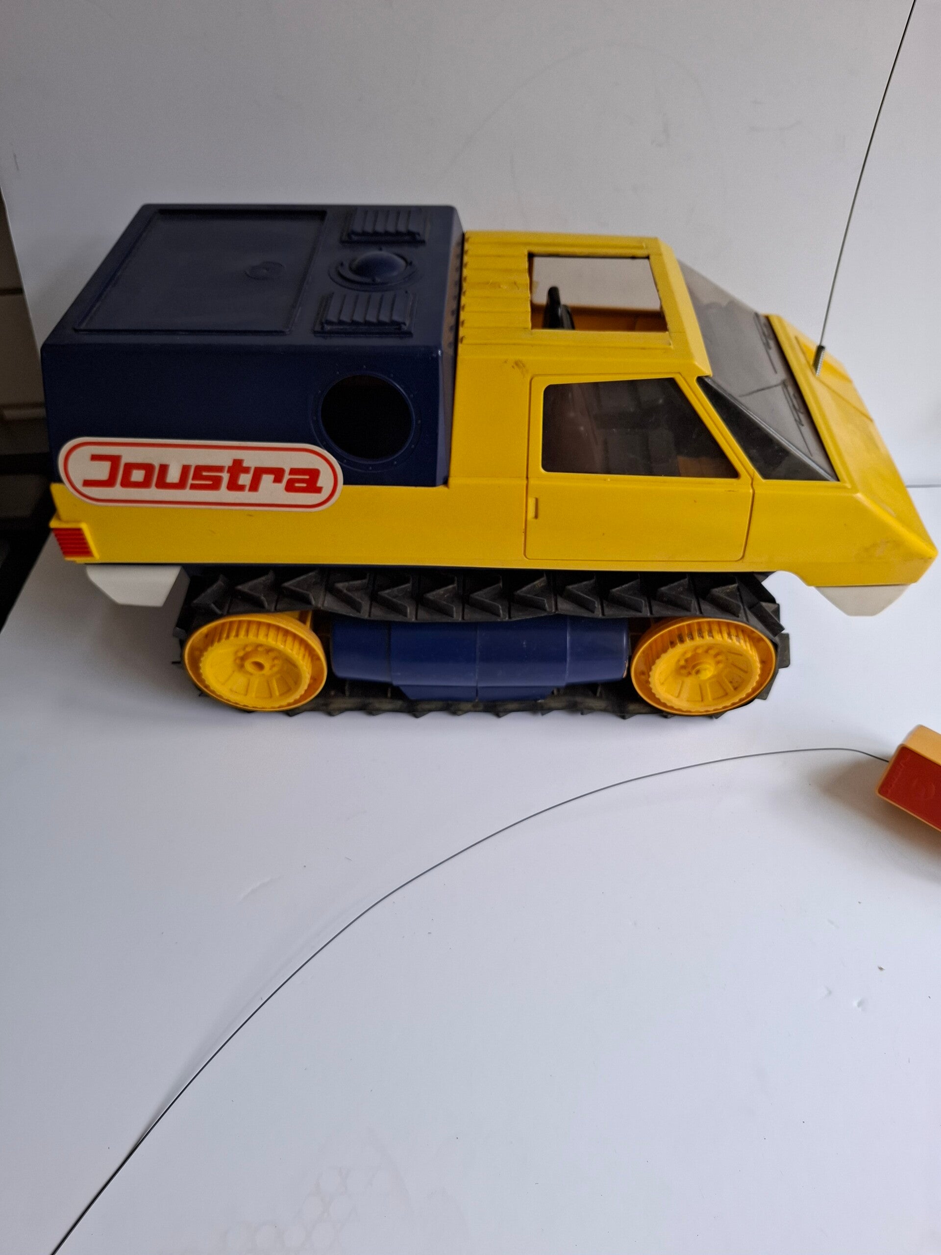 JOUSTRA, een Frans speelgoedmerk. Het betreft waarschijnlijk een amfibisch of rupsvoertuig, gezien de rupsbanden en de vormgeving die doet denken aan voertuigen voor ruig terrein of water.