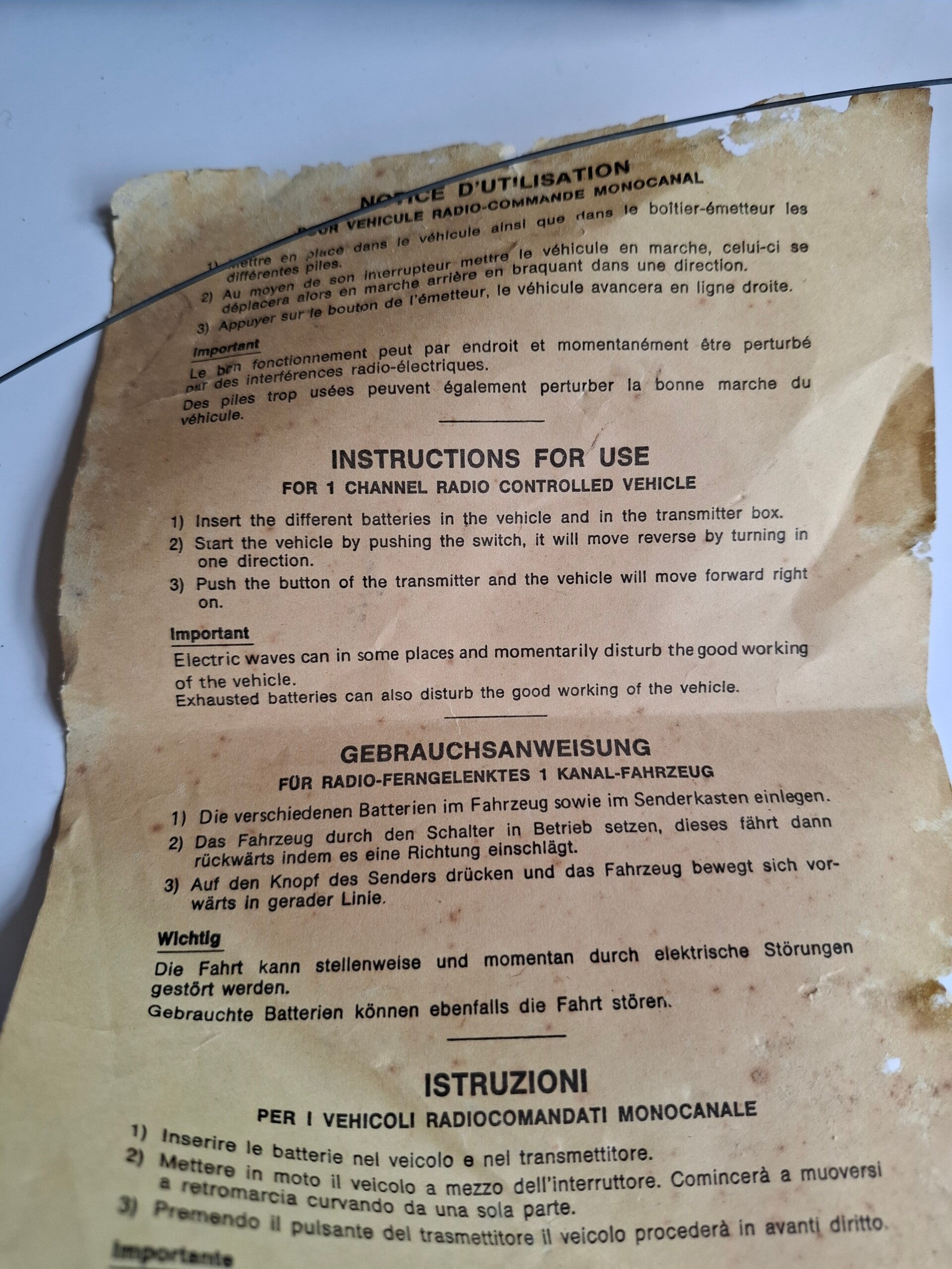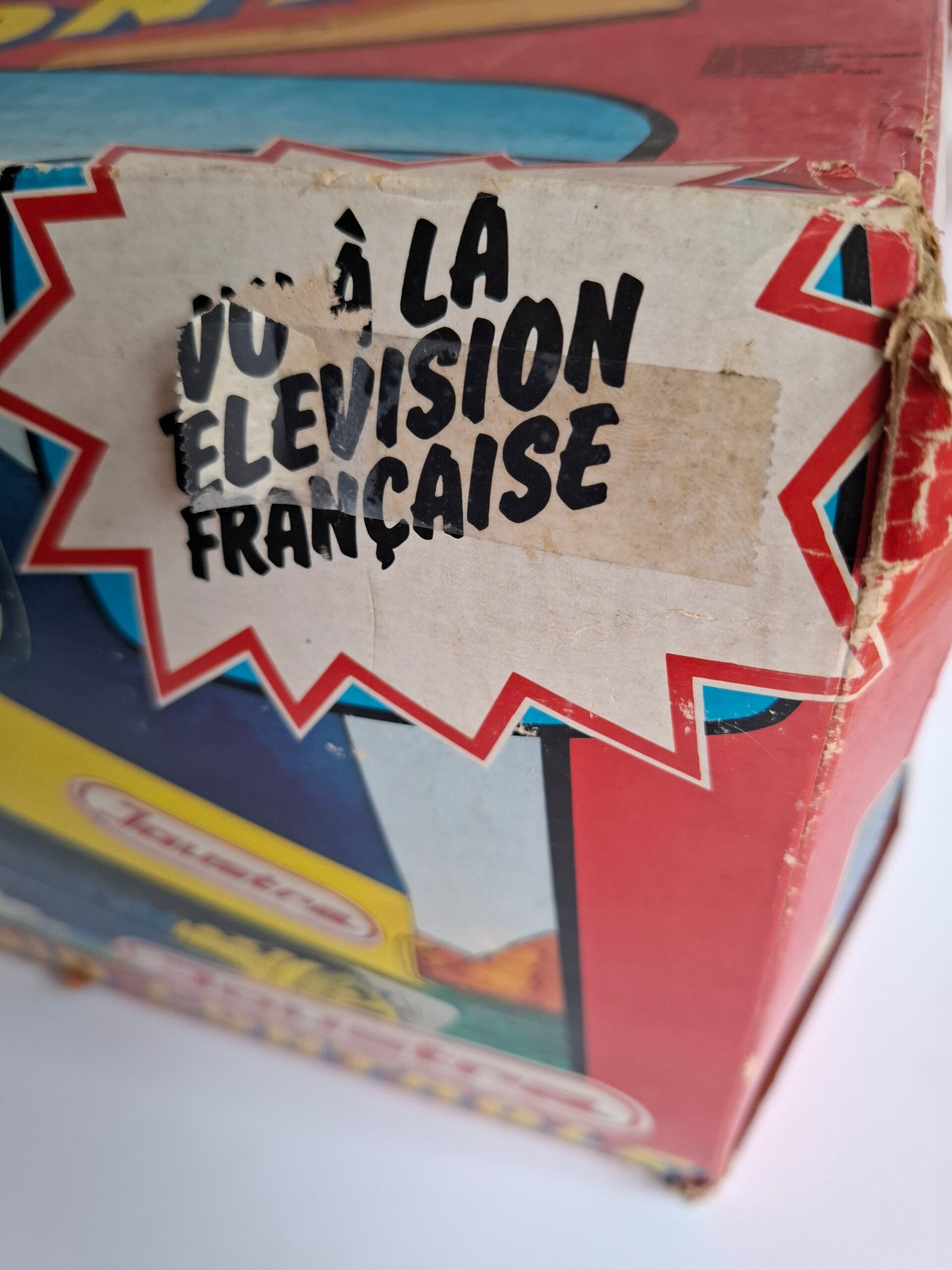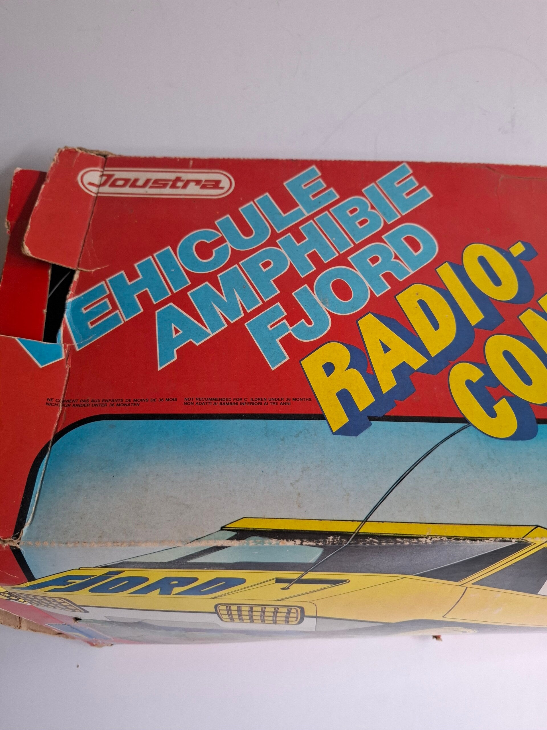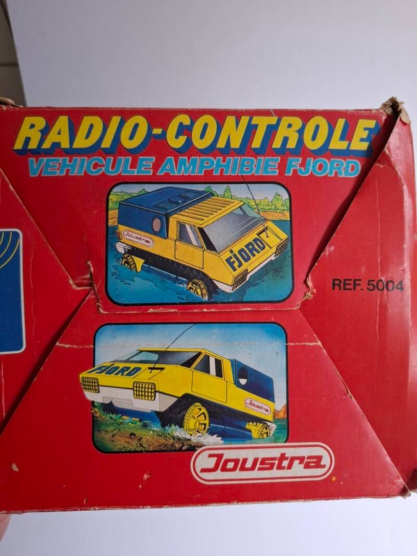 JOUSTRA, een Frans speelgoedmerk. Het betreft waarschijnlijk een amfibisch of rupsvoertuig, gezien de rupsbanden en de vormgeving die doet denken aan voertuigen voor ruig terrein of water.