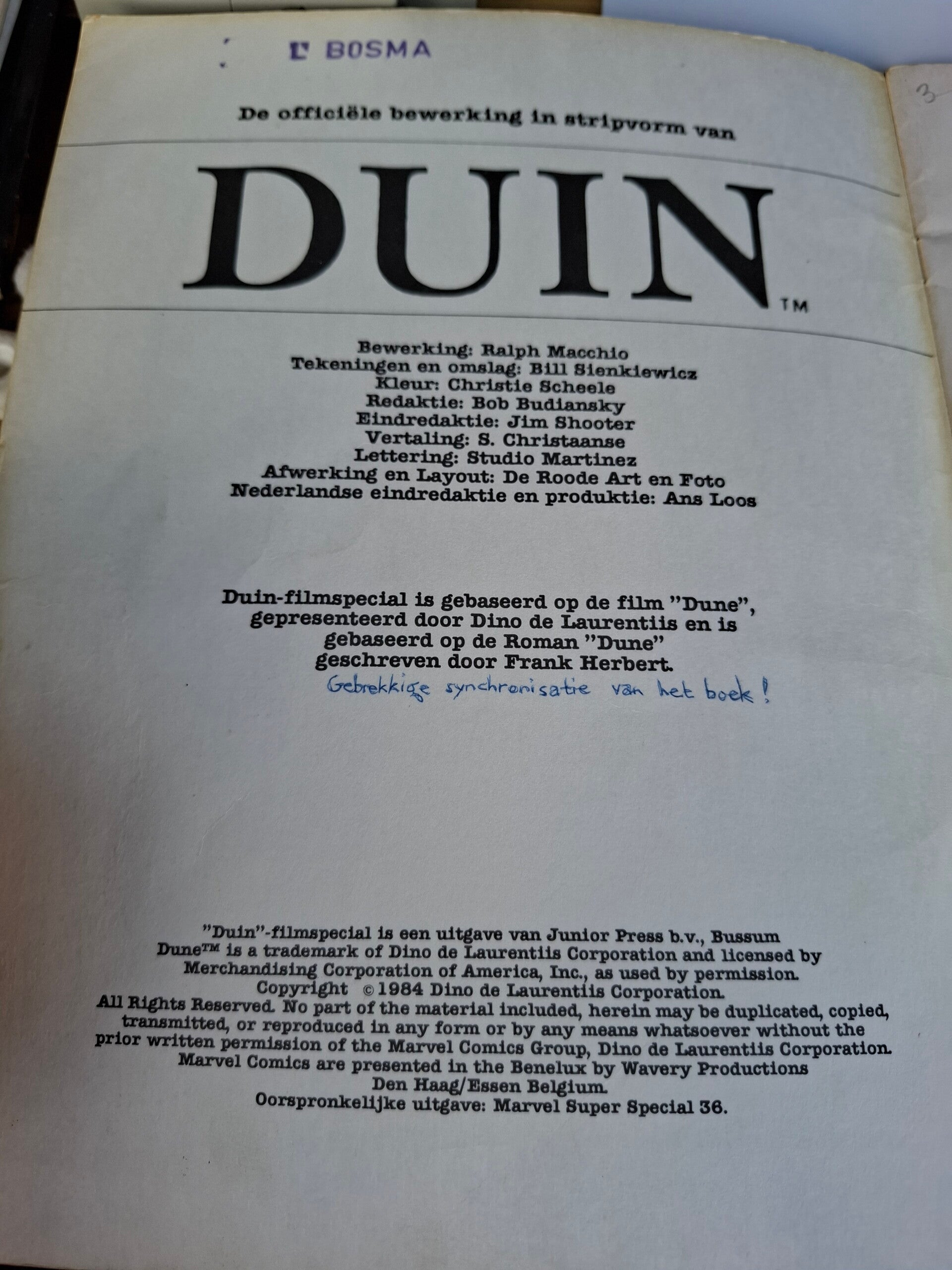 Dit is "Filmspecial nummer 4: Duin", de officiële stripboekbewerking van de film "Dune" uit 1984.