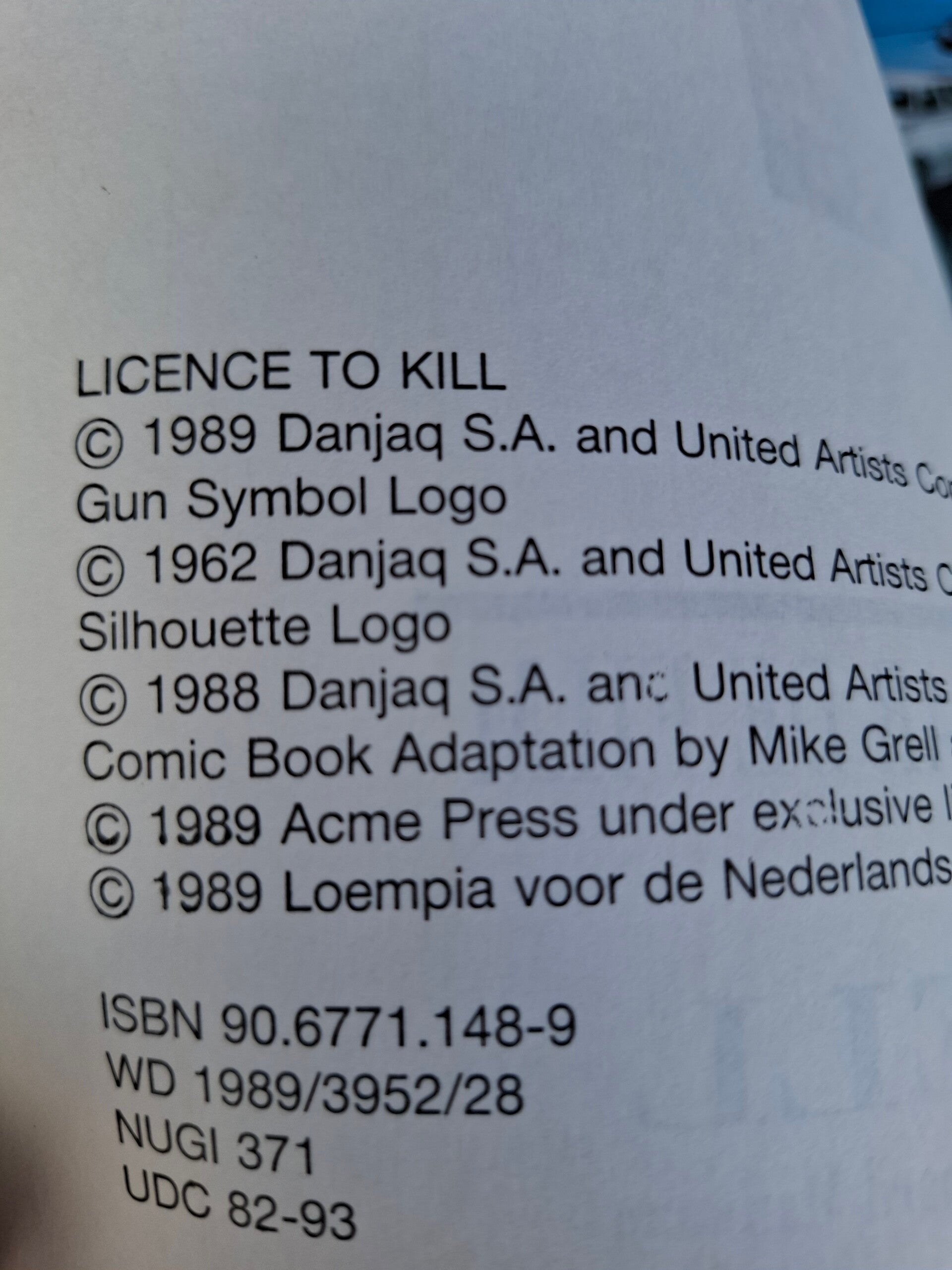 James Bond 007: Licence To Kill - Het stripverhaal naar de film" door Mike Grell, gebaseerd op het scenario van Michael G. Wilson en Richard Maibaum.