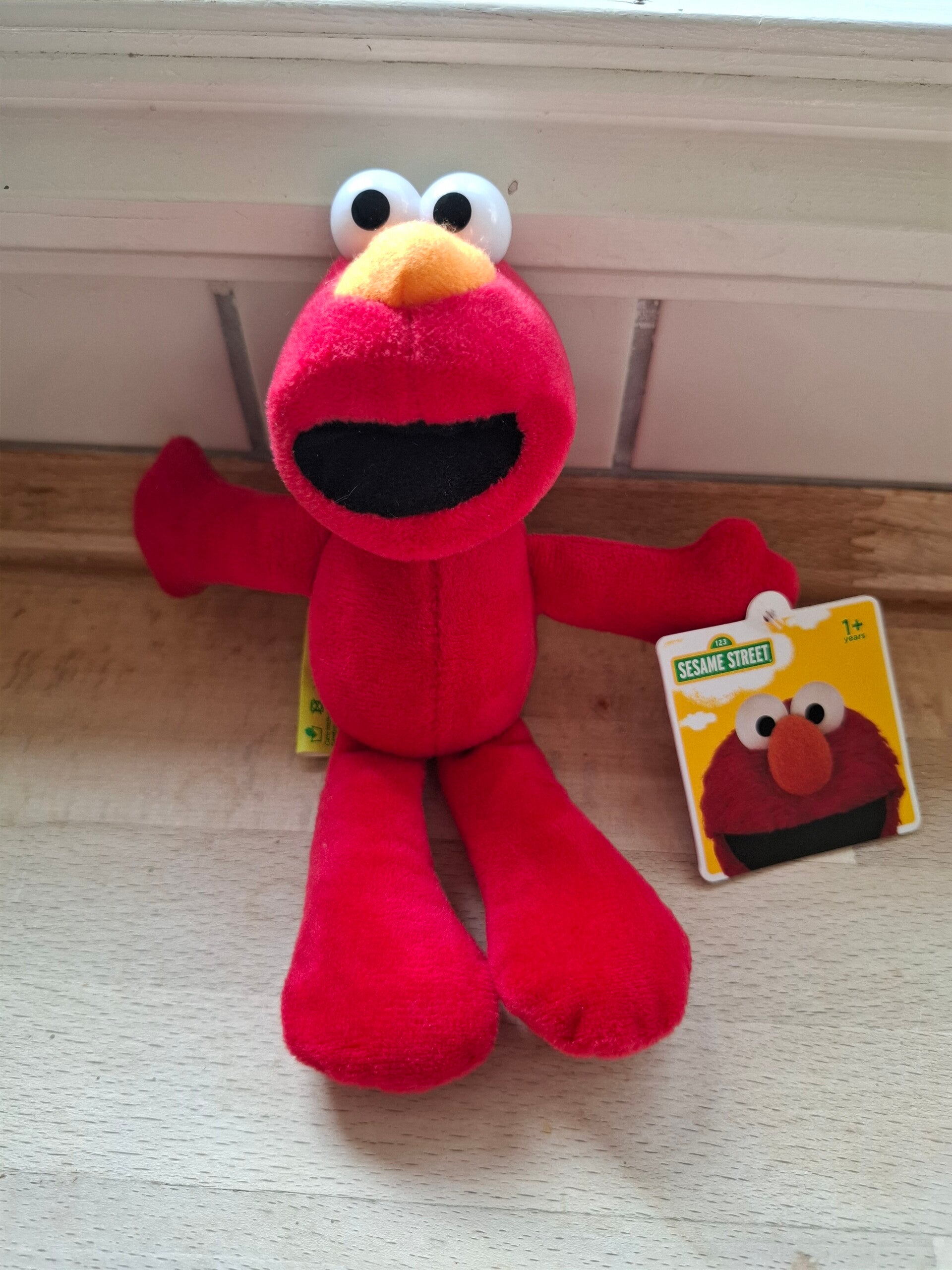 pluchen knuffel van Elmo, een rood en harig monsterkarakter uit het kinderprogramma Sesame Street (Sesamstraat). Elmo staat bekend om zijn vriendelijke en nieuwsgierige karakter, zijn oranje neus en brede mond, en zijn hoge stemgeluid.