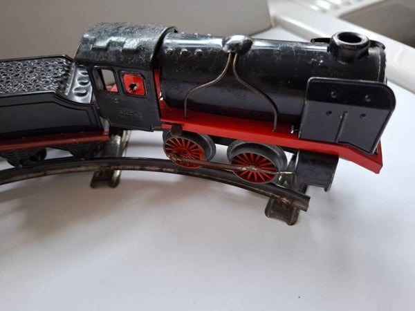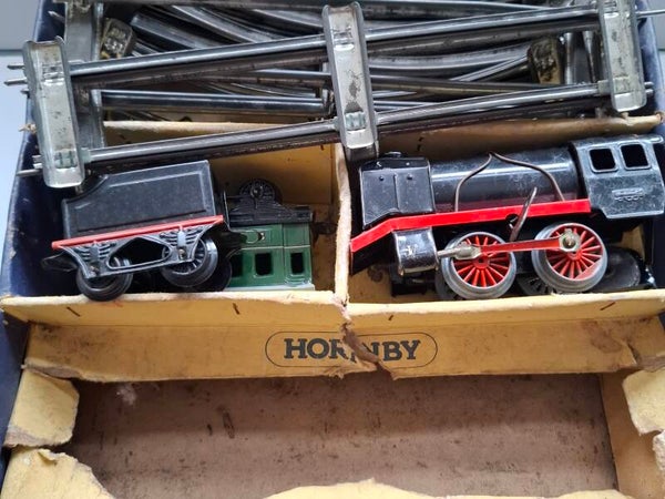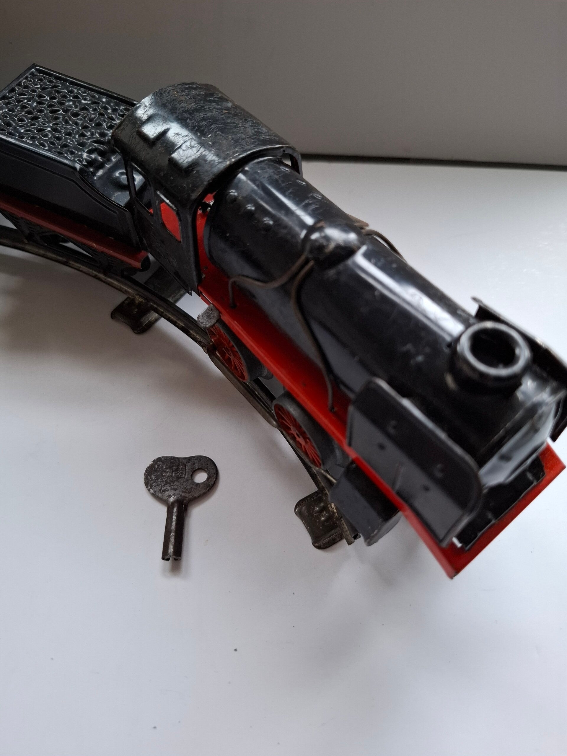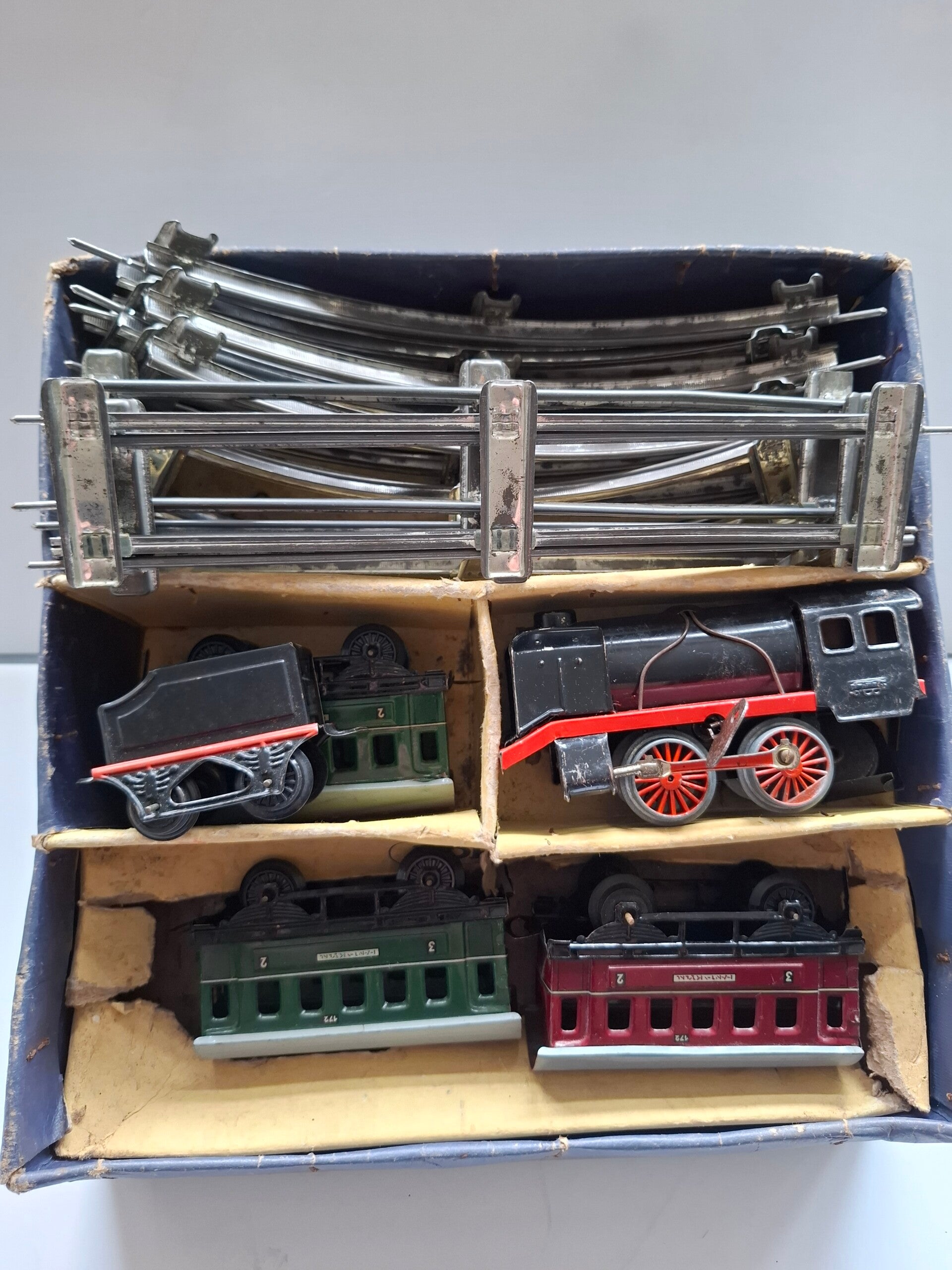 - De set bevat een locomotief, diverse wagons en rails, allemaal gemaakt van tinnen plaatwerk.