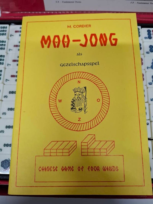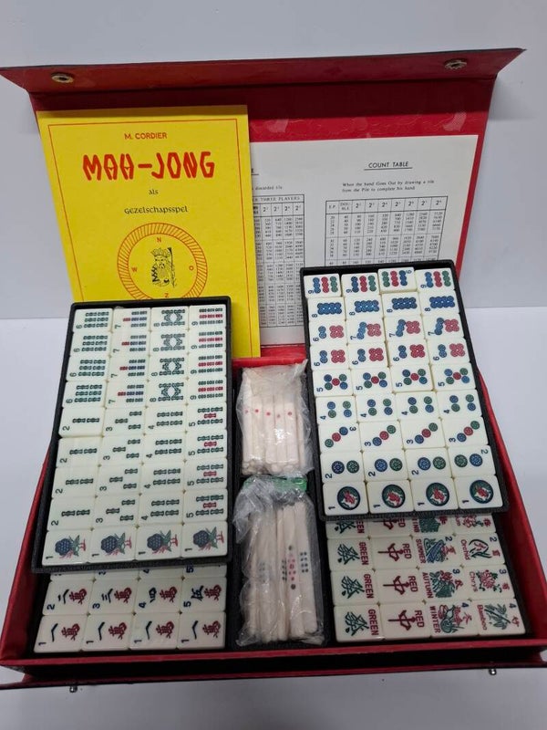 De set bevat de karakteristieke Mahjong-tegels en een telkaart voor het bijhouden van scores.
