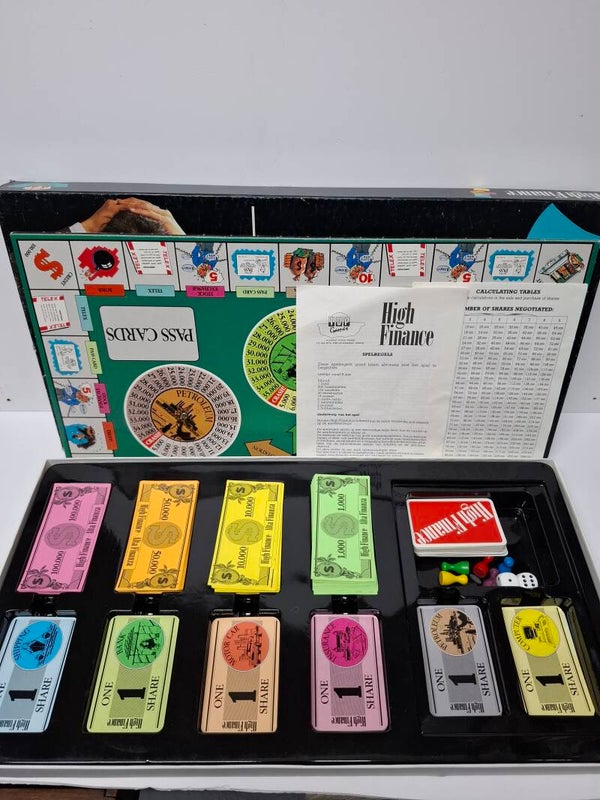 "High Finance" is een bordspel dat zich afspeelt in de wereld van de aandelenbeurs, waarbij spelers strijden om aandelen te kopen en verkopen om rijkdom te vergaren.