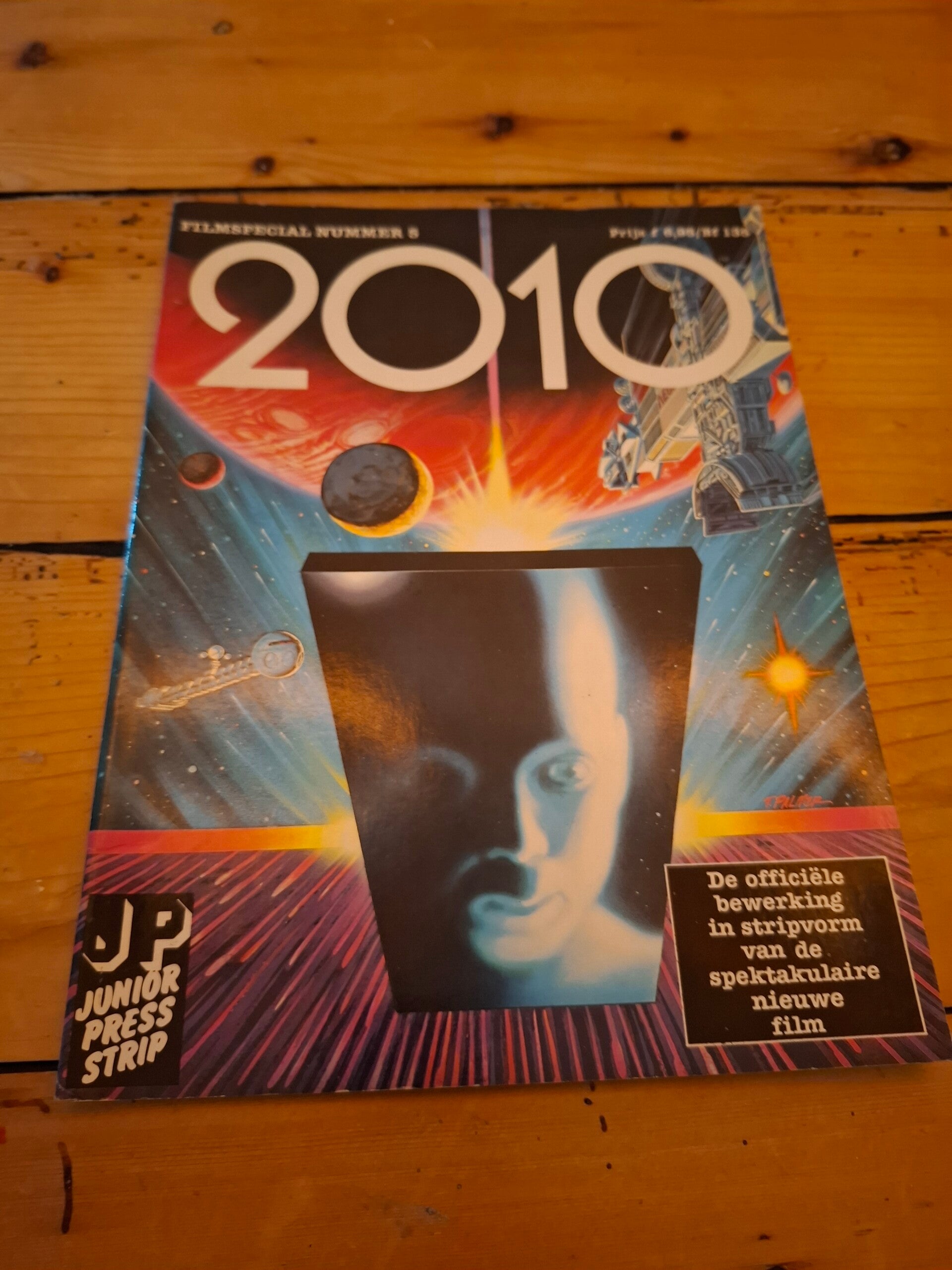 De cover toont elementen uit de film, waaronder een ruimteschip, planeten en een mysterieus monoliet-achtig object met een gezicht erin.