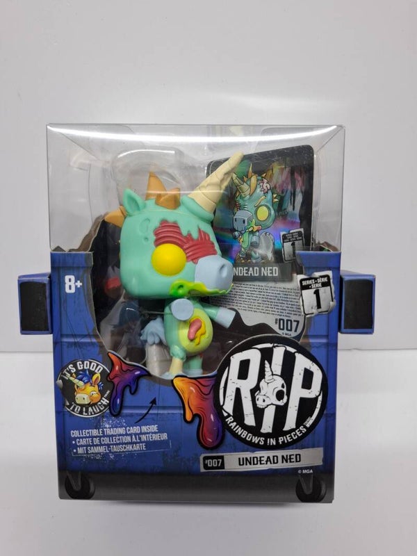 Undead Ned" uit de "R.I.P. Rainbows in Pieces" serie van MGA Entertainment. Dit is een verzamelbaar vinyl eenhoornfiguur, bekend om zijn "gnarly" en "messed up" uiterlijk.