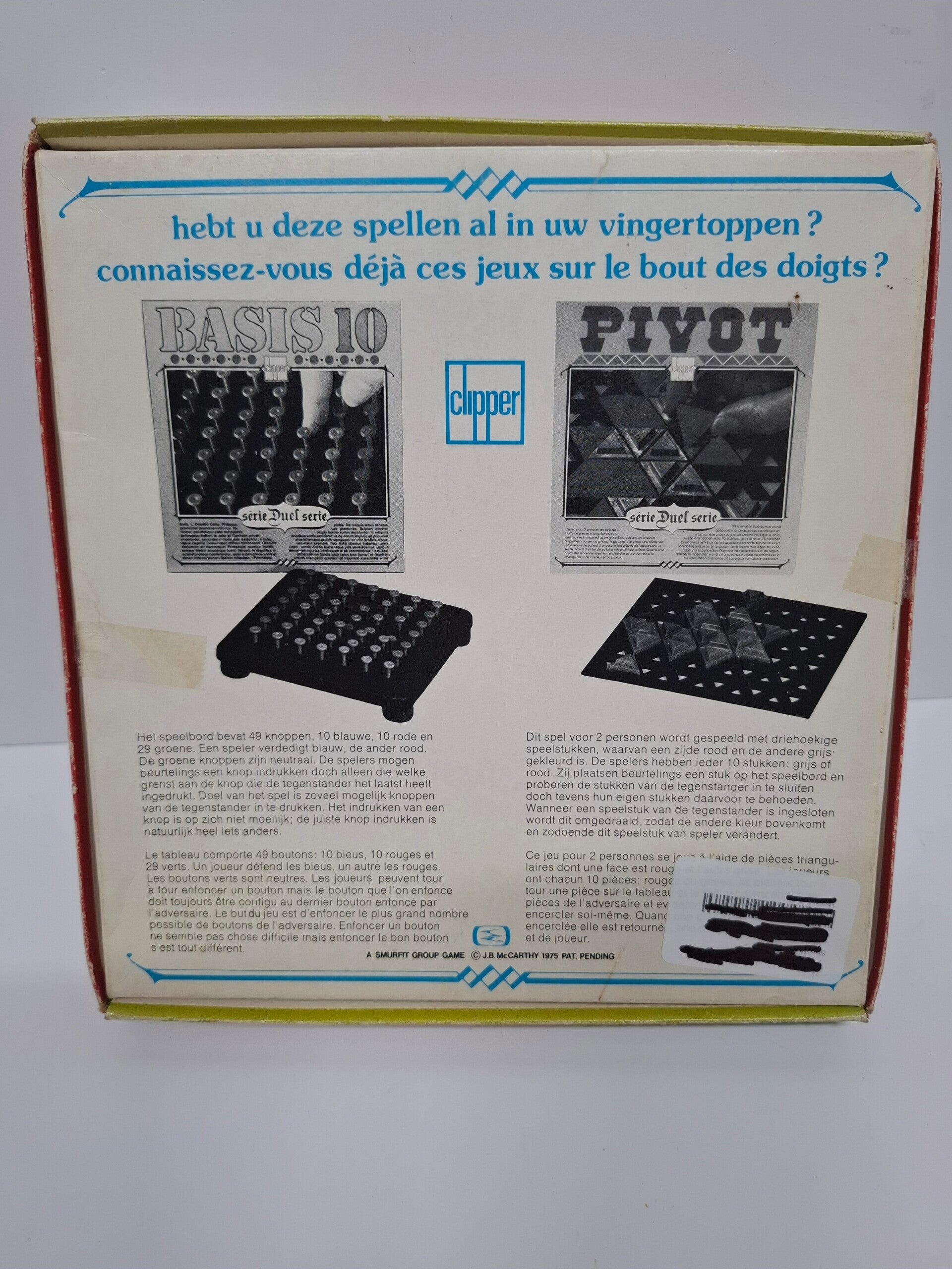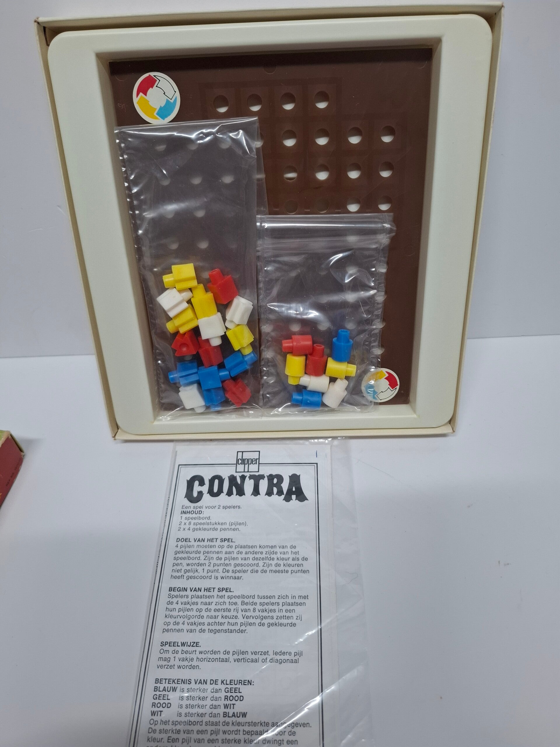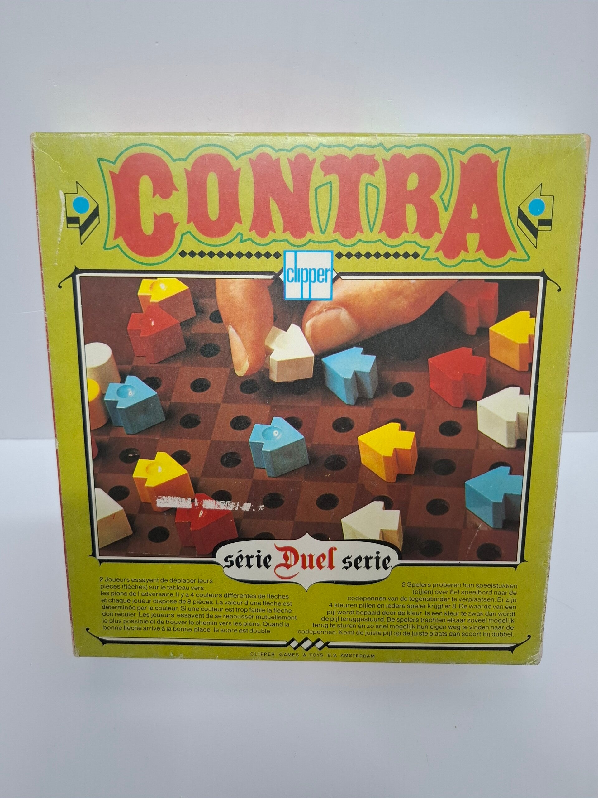 bordspel Contra uit de Clipper Duel-serie uit 1975. Het is een strategisch spel voor twee spelers, waarbij het doel is om de stukken van de tegenstander te veroveren.