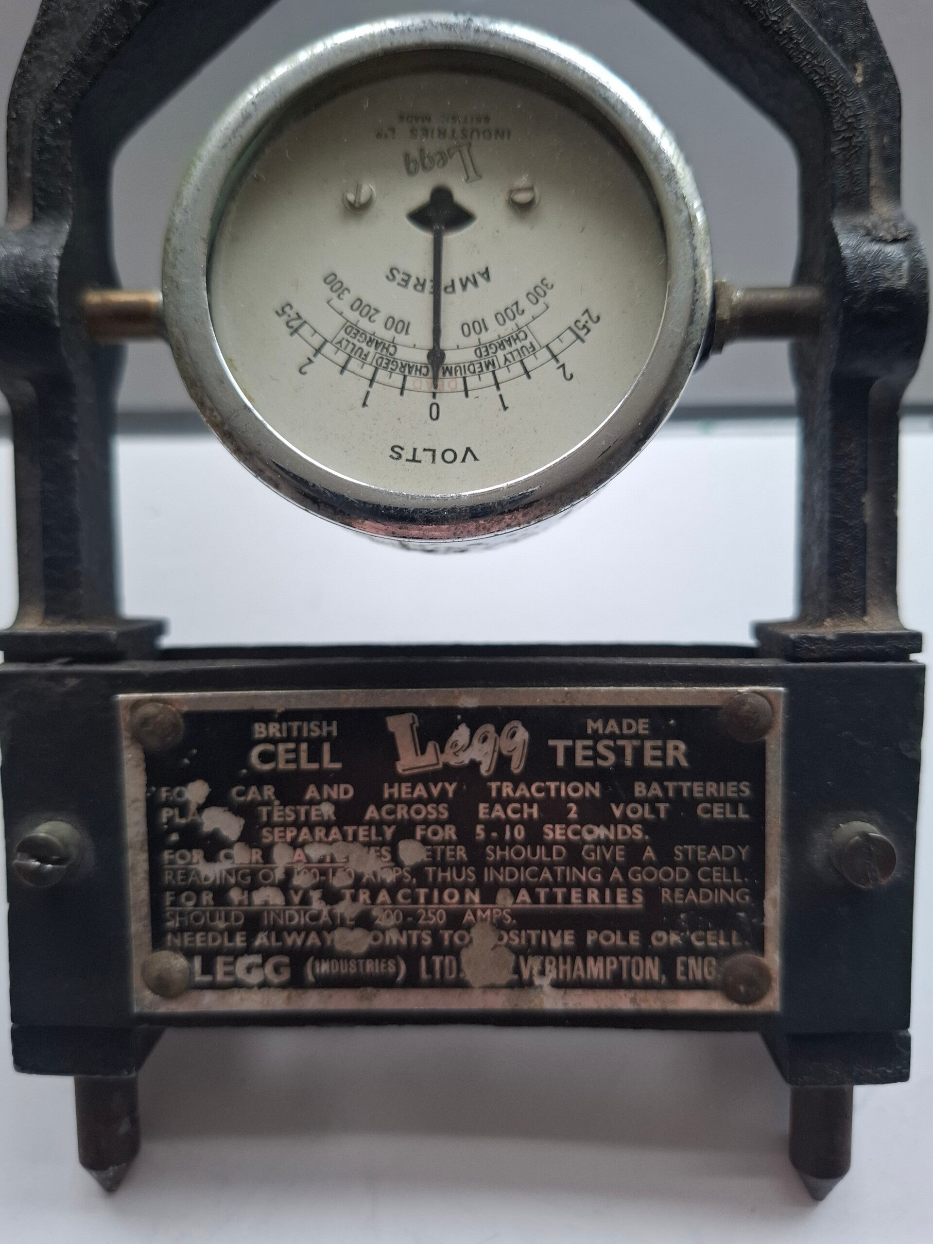 een vintage Legg cel-tester voor accu's, geproduceerd door Legg (Industries) Ltd. in Wolverhampton, Engeland.
