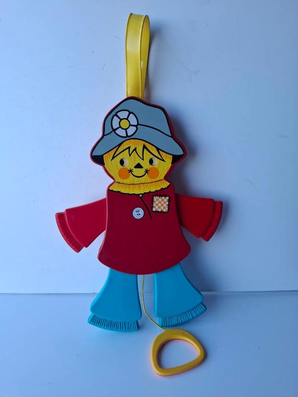 vintage Fisher-Price Jumping Jack Scarecrow (Vogelverschrikker), met modelnummer #423. Dit specifieke model werd in 1978 uitgebracht als wieg- of boxspeelgoed.