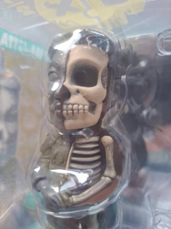 Producttype: Een 'half anatomie' model of 'semi dissection model' figuur. Het toont de buitenkant van een Terracotta Krijger aan de ene kant en de anatomie (skelet) aan de andere kant.