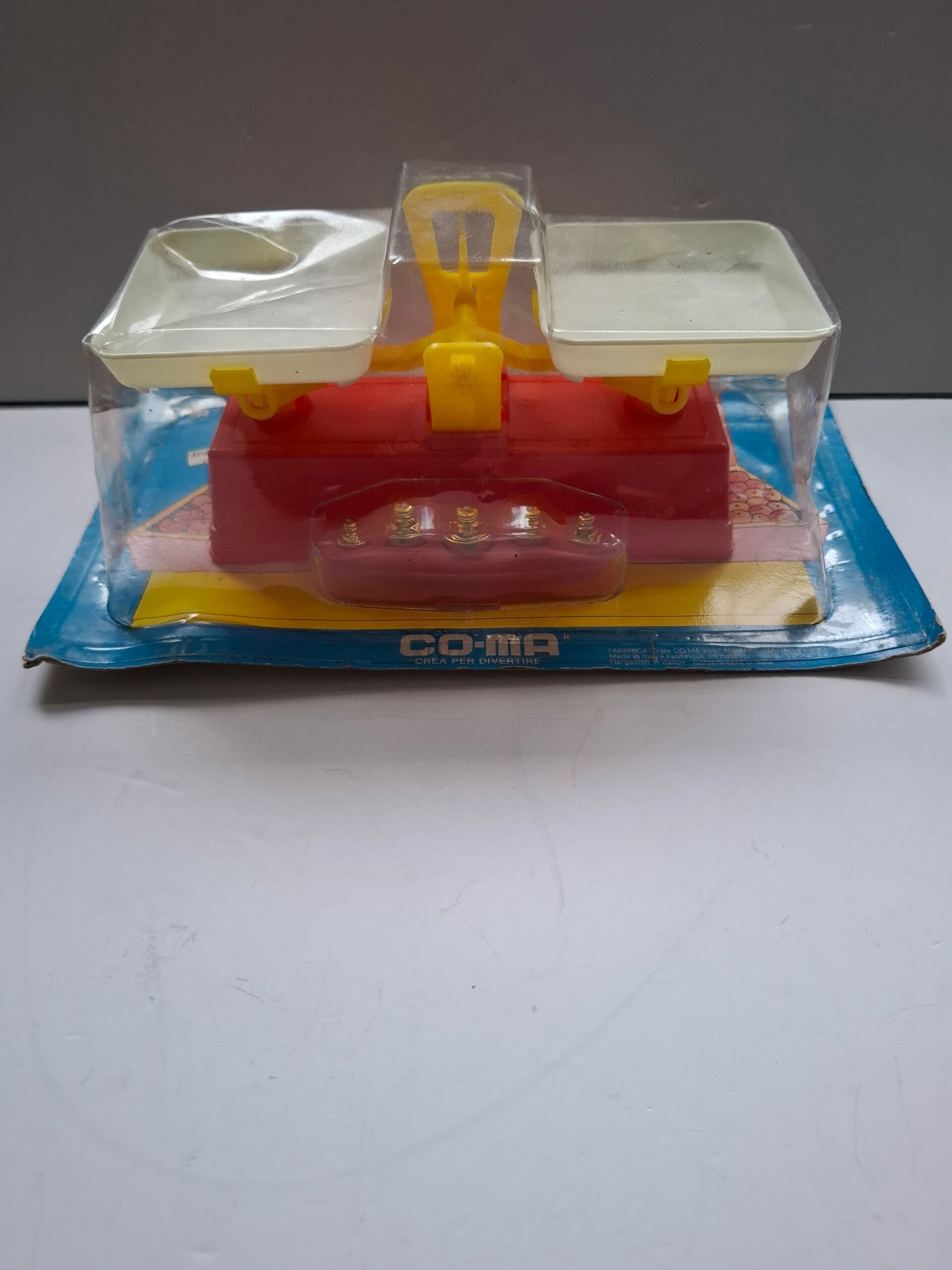 Dit is een vintage speelgoed balansweegschaal van het merk CO-MA uit Italië. Ongebruikt en nog in de originele verpakking te zitten.
