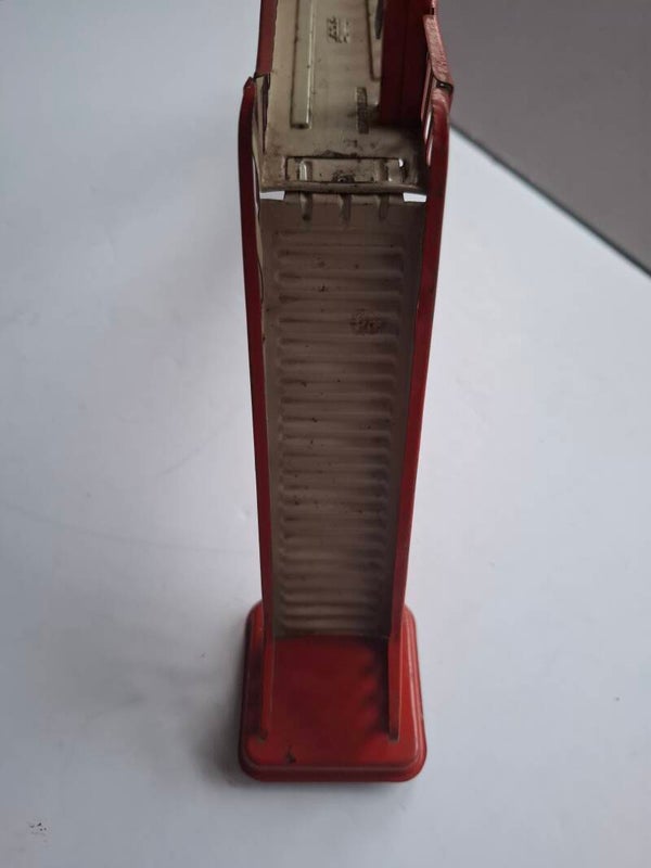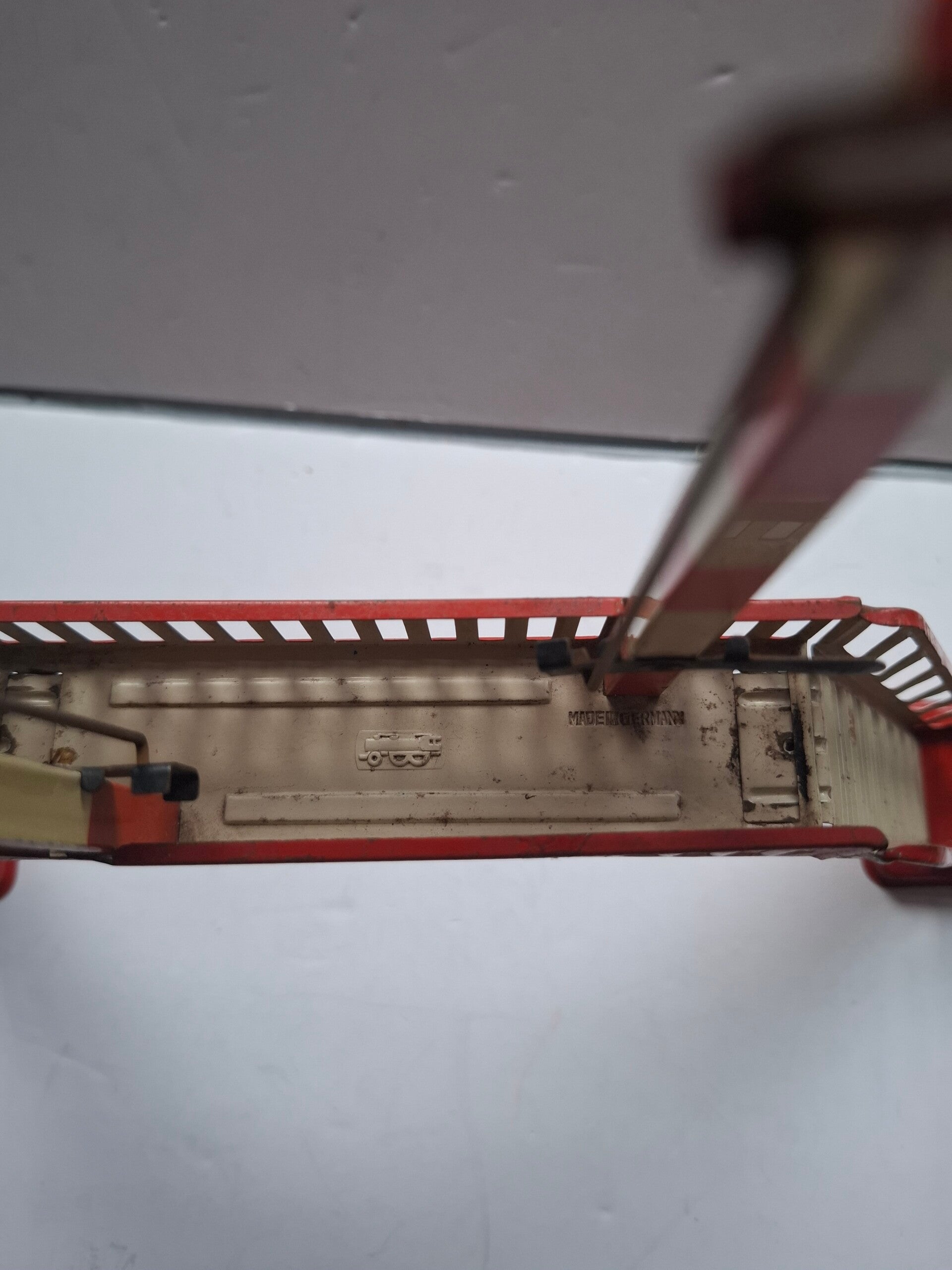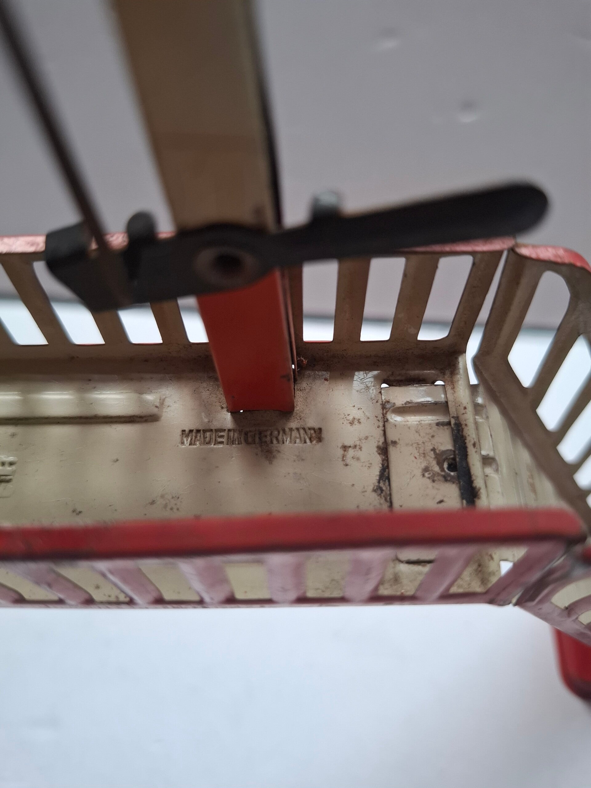 Materiaal: Het item is gemaakt van blik (tinplate), wat gebruikelijk was voor speelgoedtreinaccessoires uit die periode.