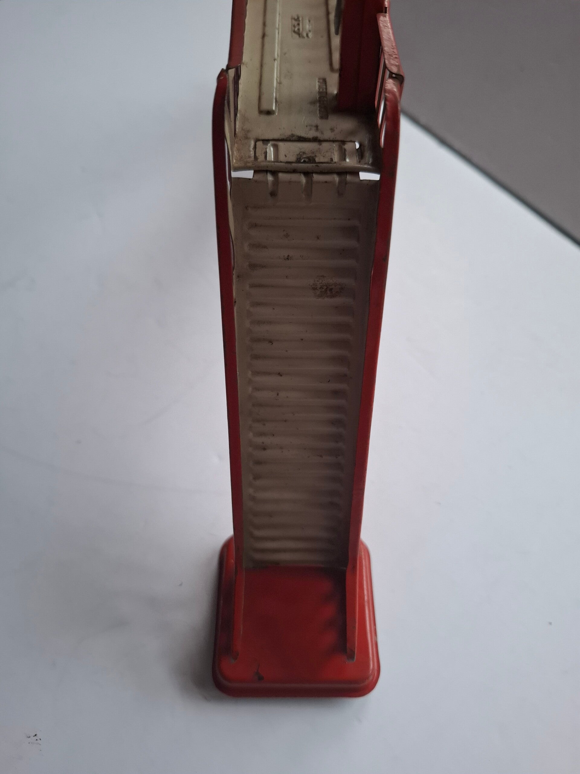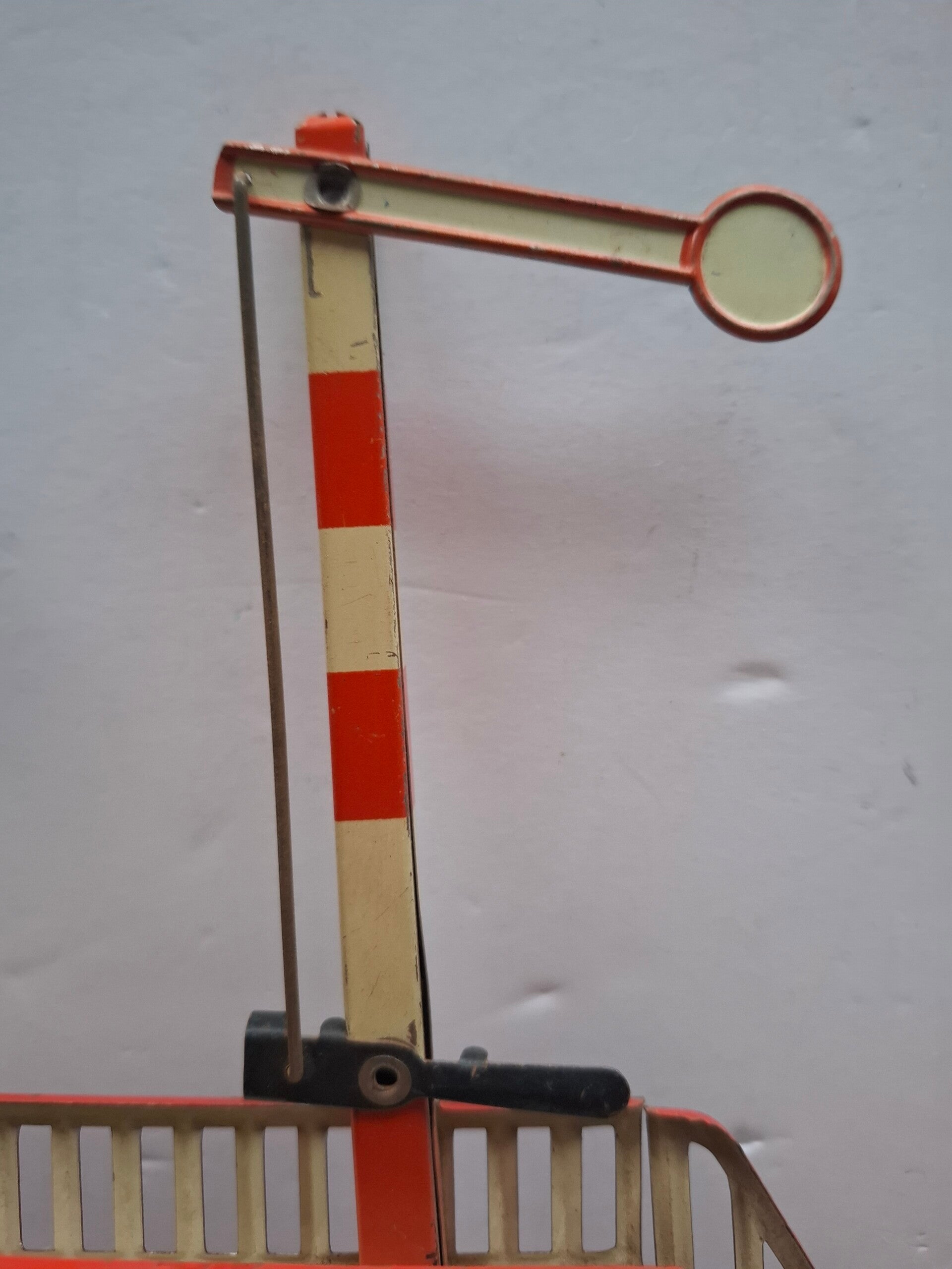 Een vintage blikken speelgoed seinenbrug (signaalbrug) voor modeltreinen, geproduceerd in Duitsland rond de jaren vijftig.