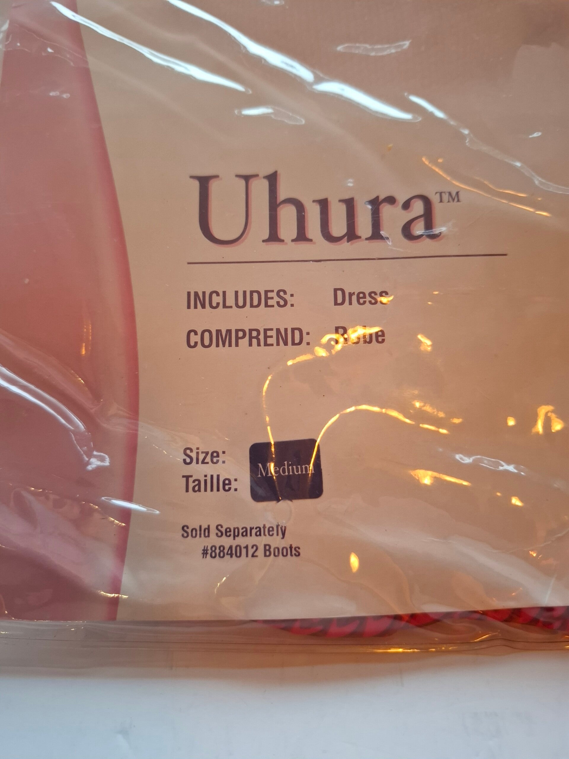 Dit is een Secret Wishes Star Trek Uhura-kostuum, vervaardigd door Rubie's Costume Company, een bekend merk voor kostuums voor volwassenen. Het is een officieel gelicentieerde replica van de rode uniformjurk die luitenant Uhura in de Star Trek-films draagt.