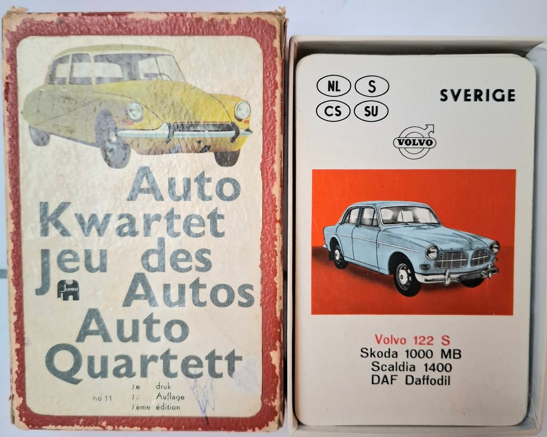 Dit is een vintage Auto Kwartet kaartspel, uitgegeven door Jumbo. Het specifieke spel op de afbeelding is de 7e druk, ook bekend als '7. Auflage' in het Duits of '7ème édition' in het Frans. Het spel heeft het nummer 'no 11'.