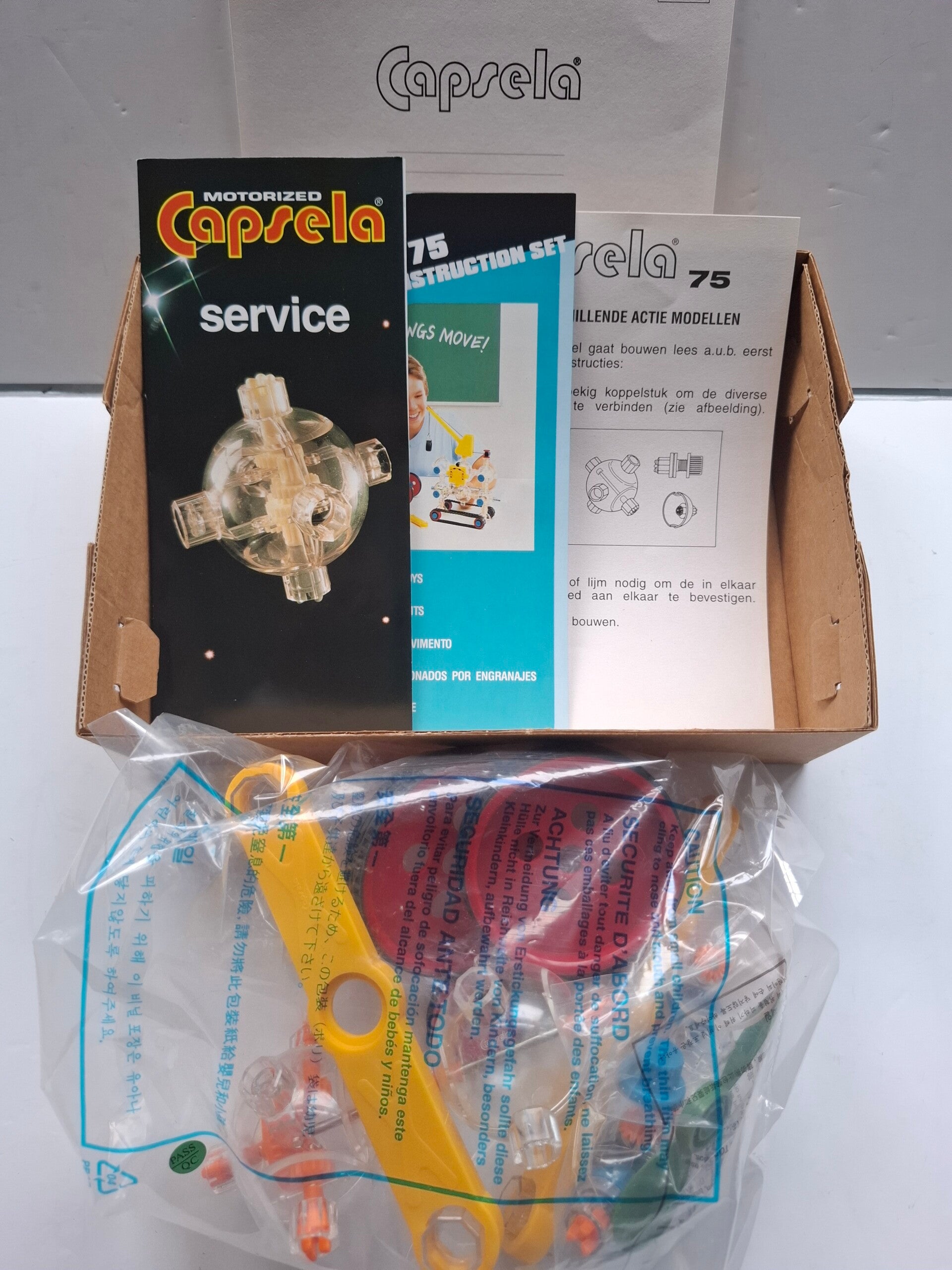 Vintage Capsela 75 gemotoriseerde wetenschappelijke bouwset. Capsela was populair constructiespeelgoed uit de jaren 80 en 90, dat zich richtte op modules met tandwielen, motoren en wielen in doorzichtige capsules.