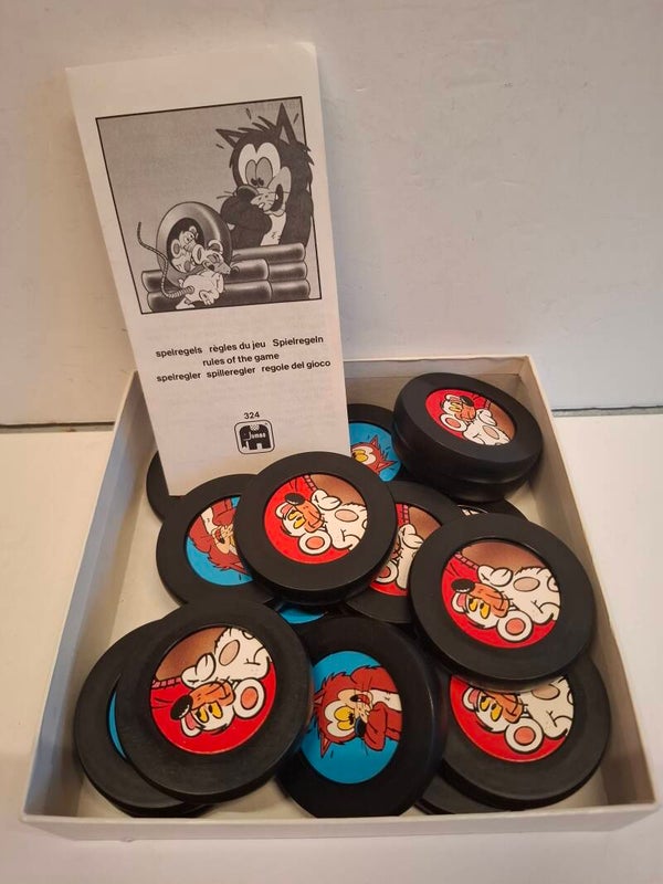 Inhoud: Het spel omvat doorgaans een bord met kaas, gekleurde muizen, een kattenklauw en een dobbelsteen.
