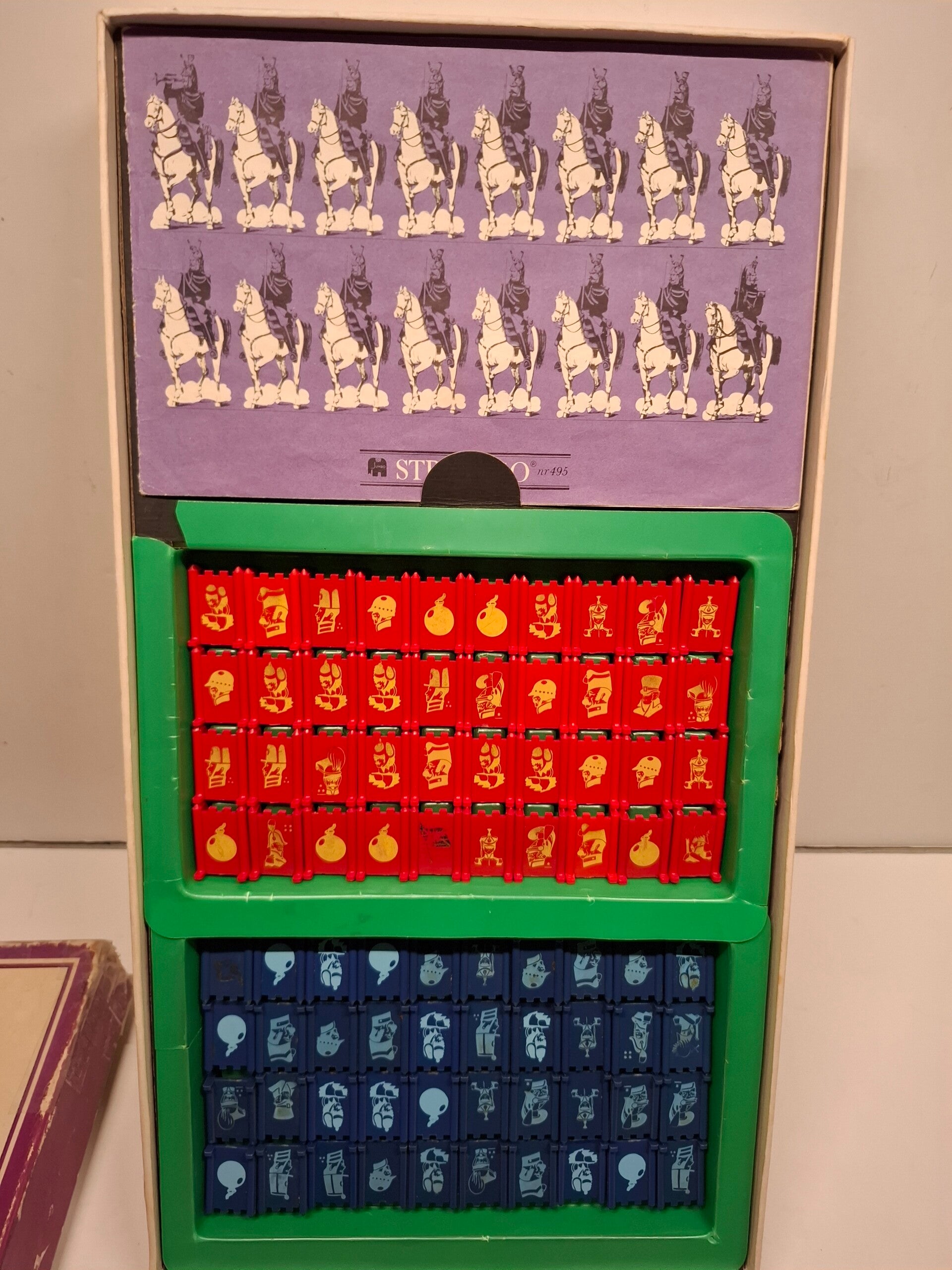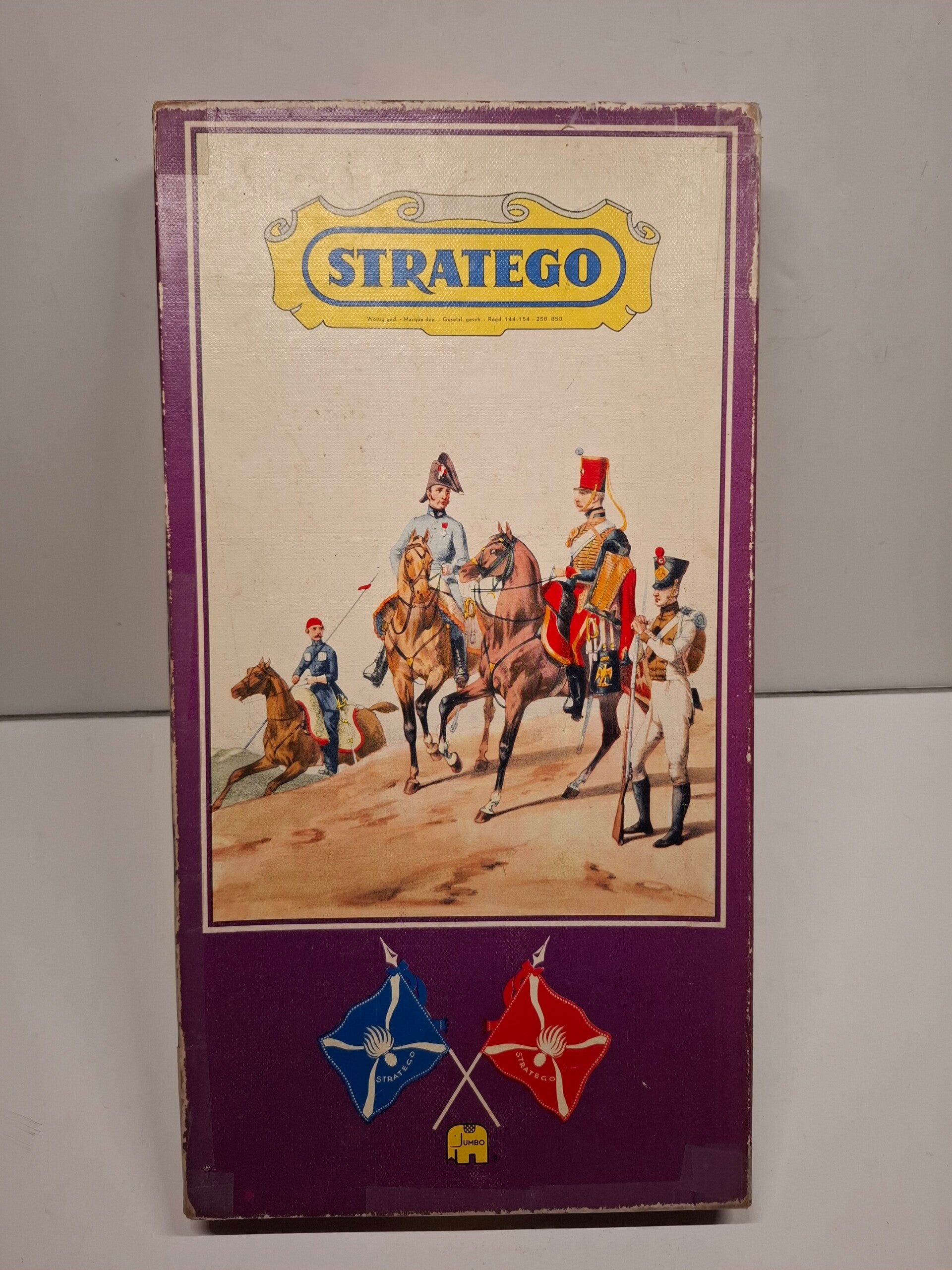 vintage Stratego bordspel-editie van de Nederlandse uitgever Jumbo. De afgebeelde doos is kenmerkend voor een latere uitgave dan de eerste versies uit de jaren '50 en vroege jaren '60, waarschijnlijk uit de jaren '70 of '80, met behoud van de klassieke illustratie van militaire figuren te paard.