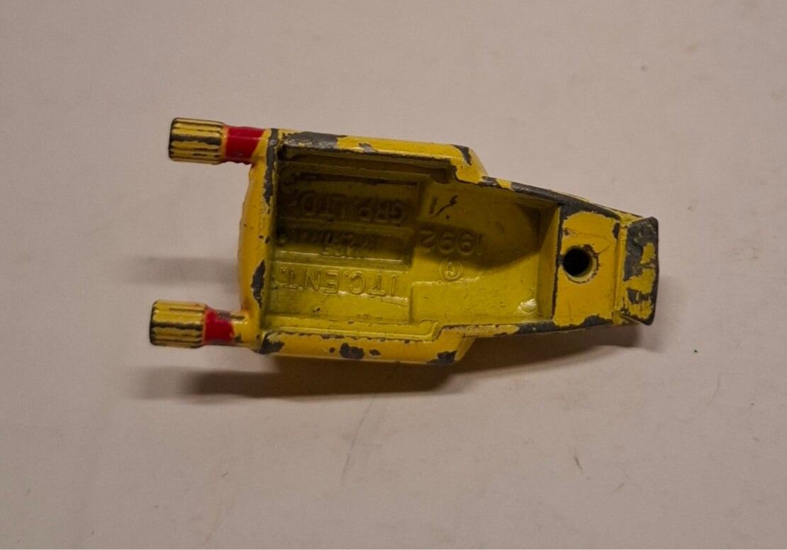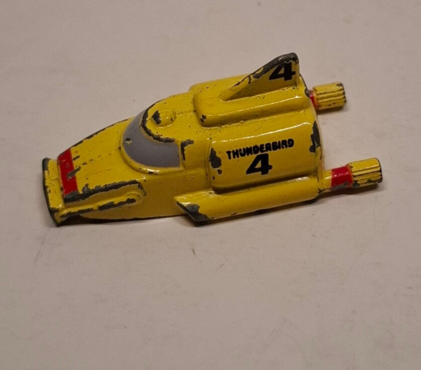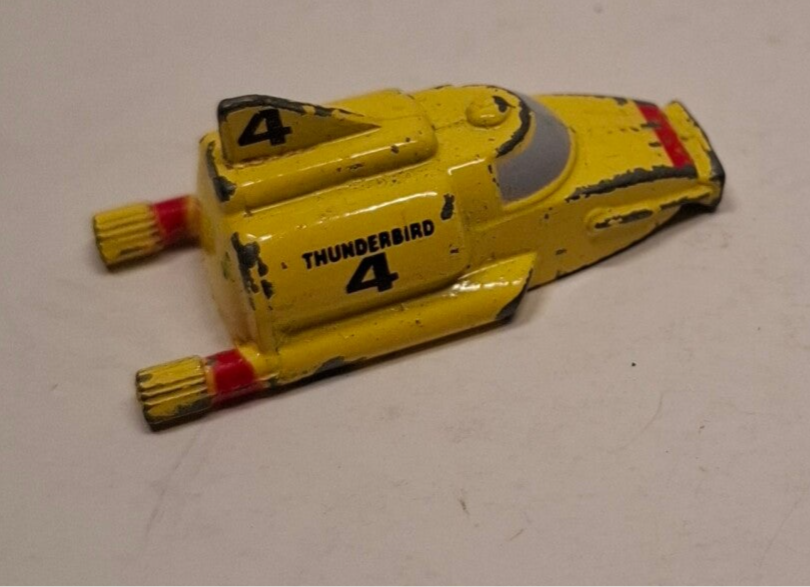 Dit is de Thunderbird 4, de iconische gele mini-onderzeeër uit de klassieke Gerry Anderson tv-serie Thunderbirds. Het model is waarschijnlijk een vintage die-cast model, mogelijk geproduceerd door Matchbox in de jaren negentig.