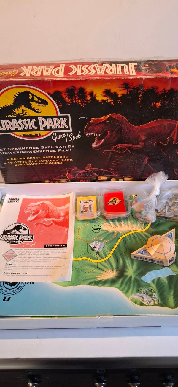 Taal: Deze specifieke doos is deels in het Nederlands, met de tekst "Game/Spel" en "HET SPANNENDE SPEL VAN DE ONTNOMEN FILM!" (met een typefout) en "EXTRA GROOT SPEELBORD, 16 OFFICIËLE JURASSIC PARK DINOSAURUS-FIGUREN" op de voorkant.