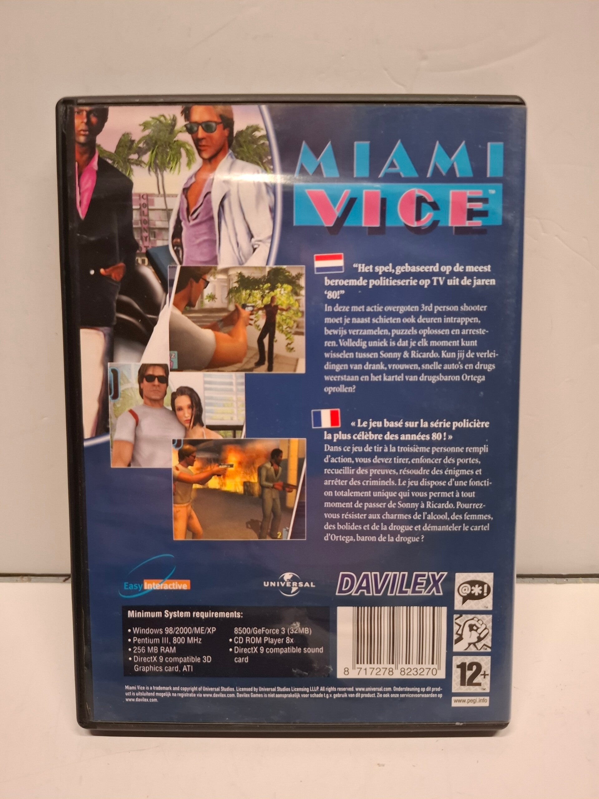 Dit is het PC CD-ROM spel Miami Vice, uitgegeven door Davilex. Het spel is gebaseerd op de populaire gelijknamige televisieserie uit de jaren 80.