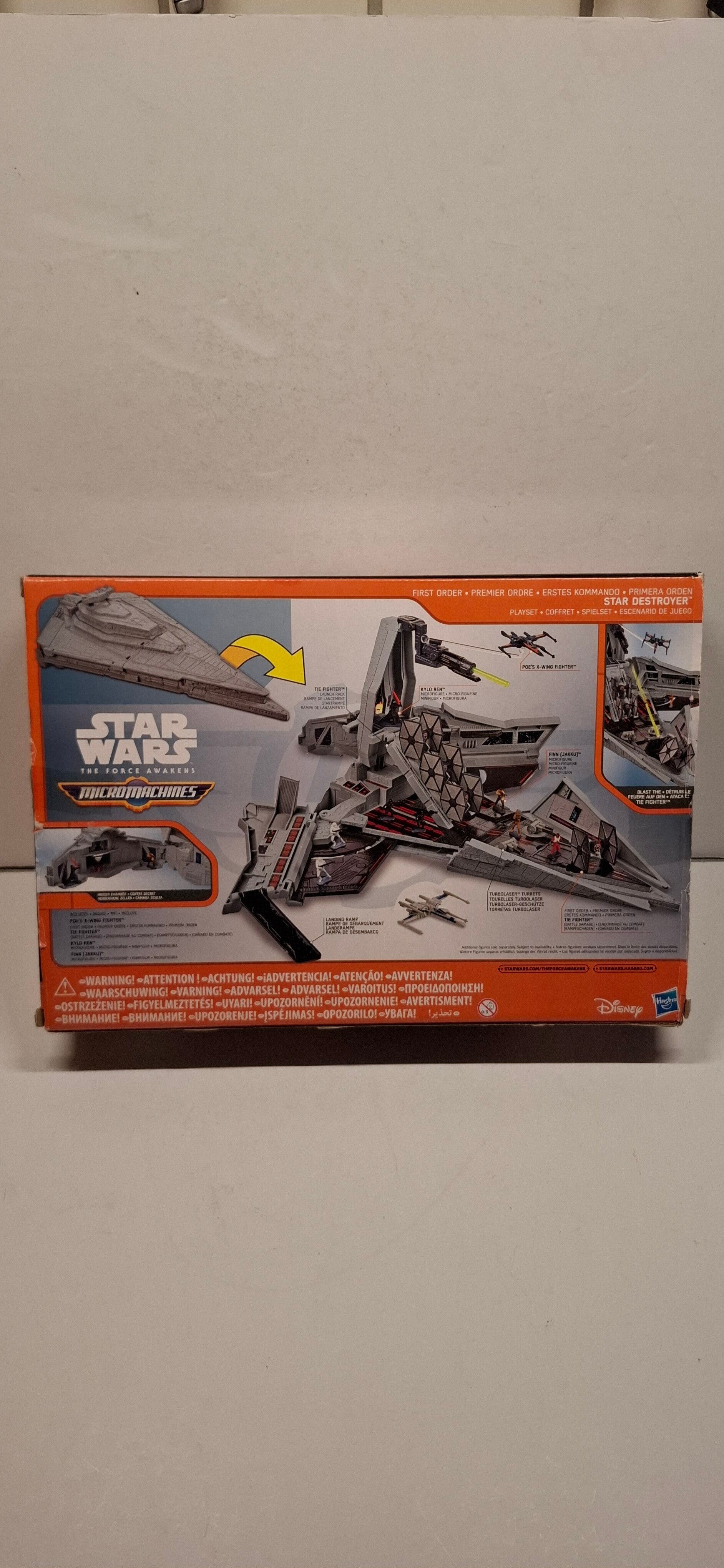 Dit is de Star Wars The Force Awakens Micro Machines First Order Star Destroyer Playset. Deze speelset is geproduceerd door Hasbro en kan worden omgebouwd van een ruimteschip naar een gedetailleerd slagveld.