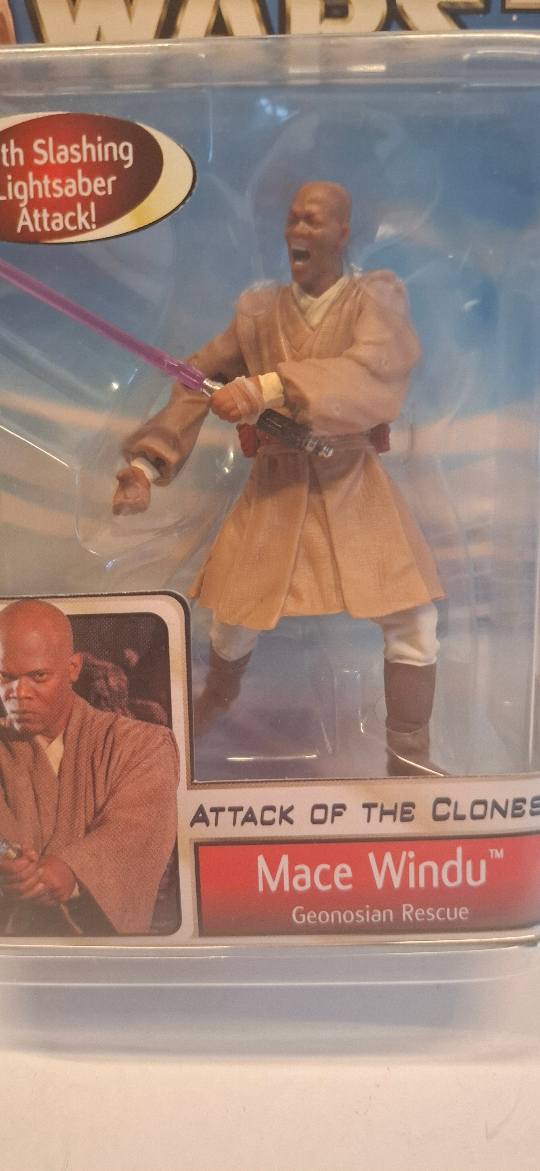 Mace Windu actiefiguur uit de Star Wars: Episode II Attack of the Clones lijn, specifiek de "Geonosian Rescue" versie.