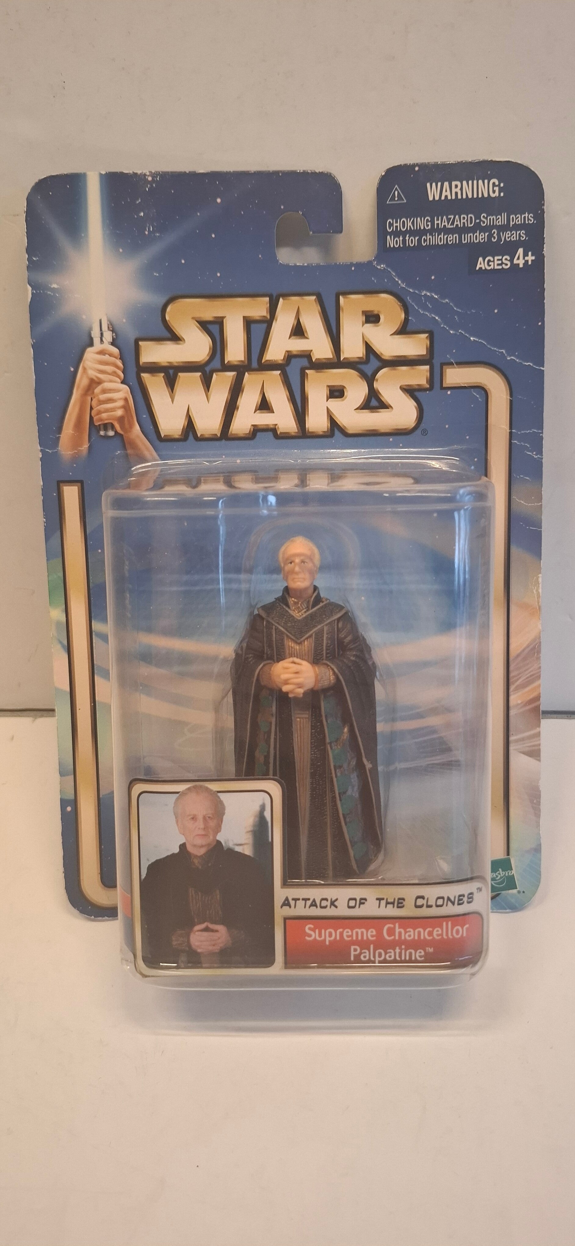 Supreme Chancellor Palpatine actiefiguur uit 2002, geproduceerd door Hasbro als onderdeel van de "Attack of the Clones" collectie.