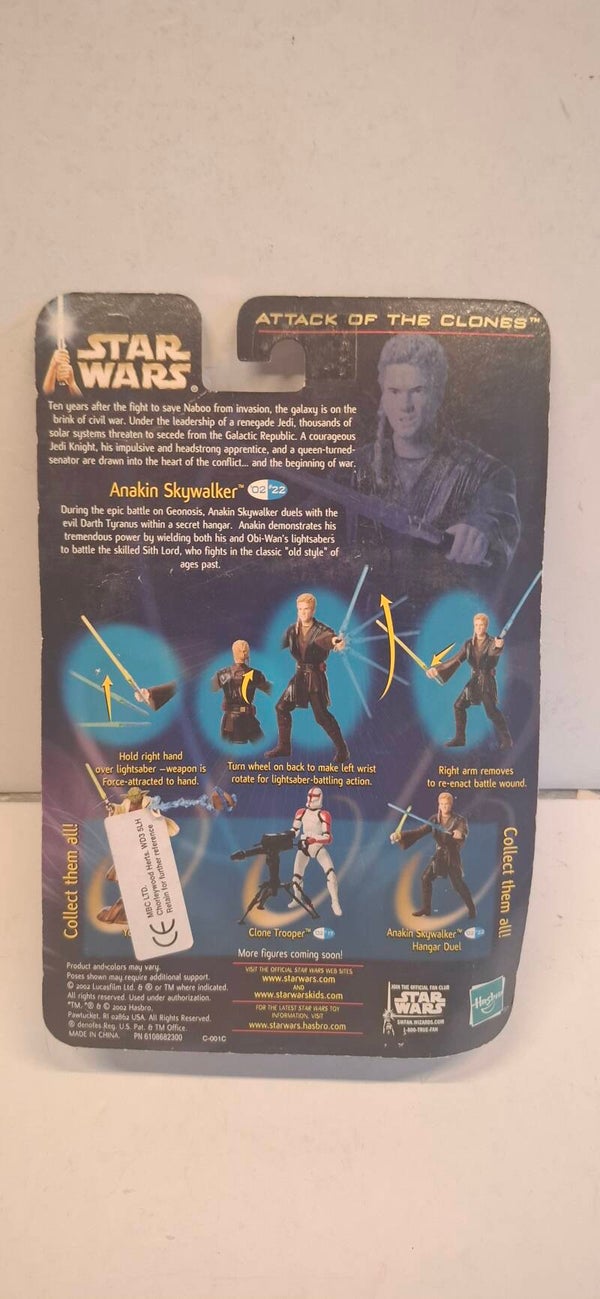 De actiefiguur op de afbeelding is Anakin Skywalker (Hangar Duel) uit de Star Wars: Episode II - Attack of the Clones collectie van 2002, geproduceerd door Hasbro. Het maakt deel uit van de bredere Saga Collection-speelgoedlijn die in dat jaar werd uitgebracht.