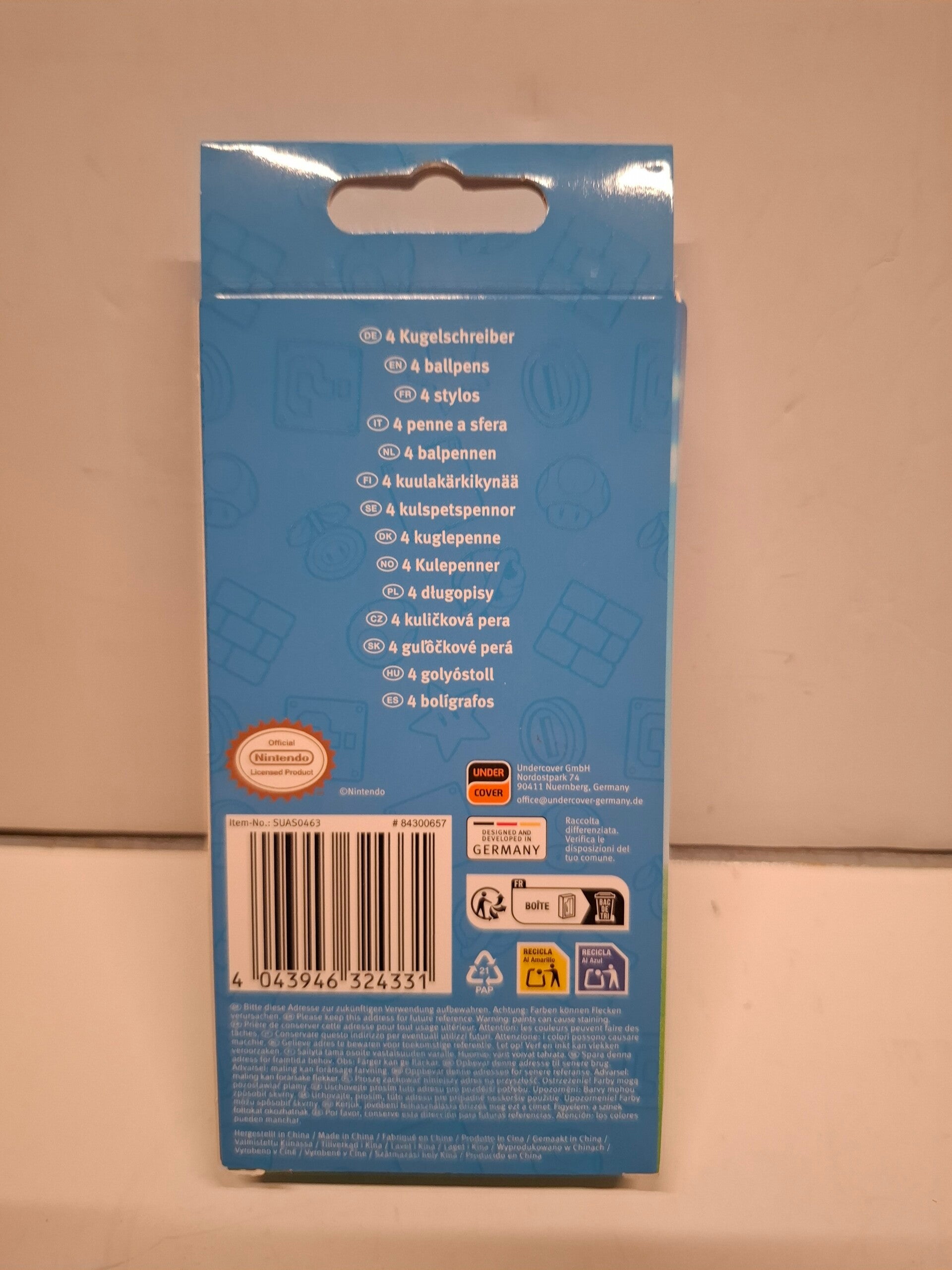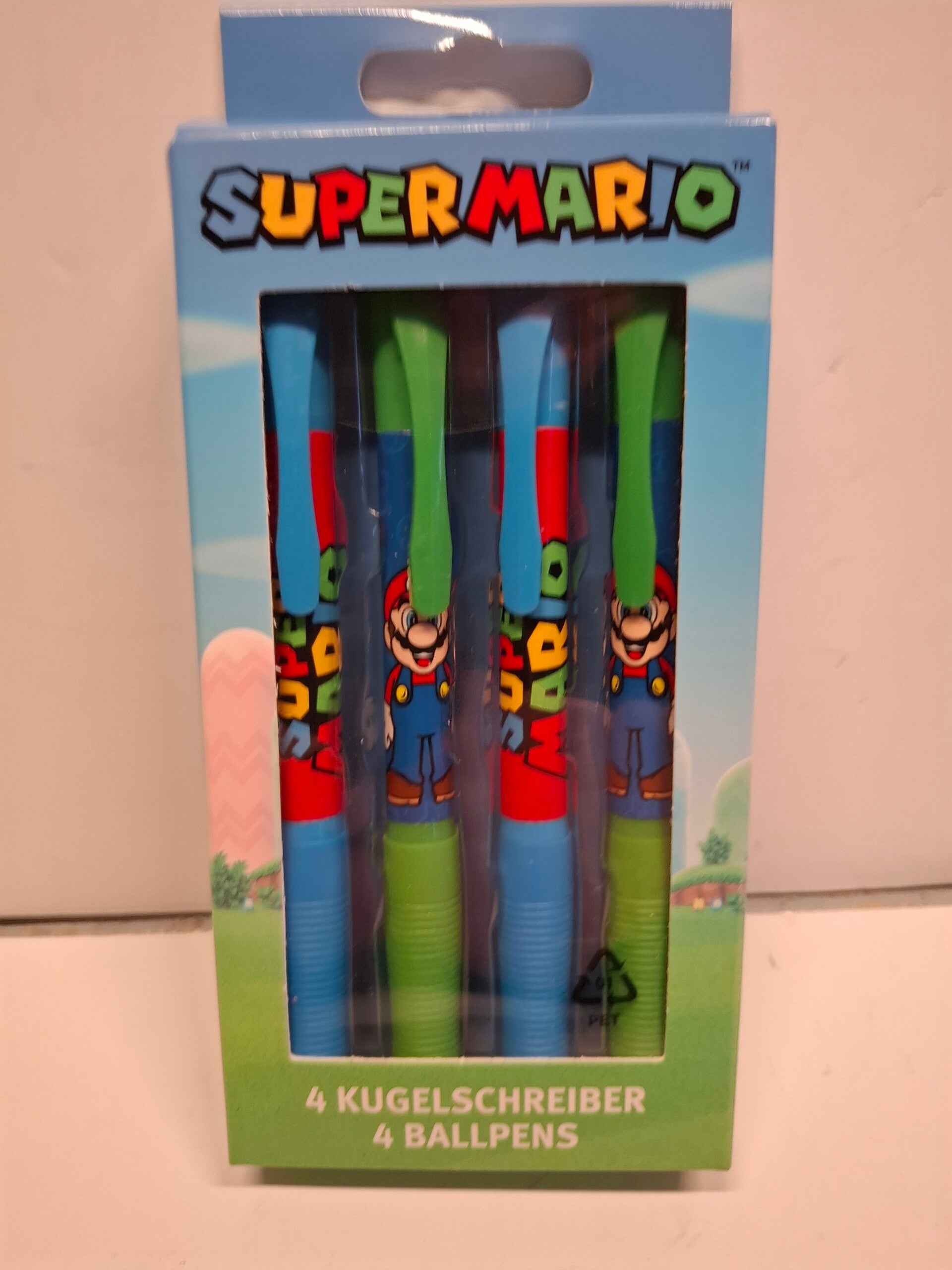 Dit is een set van vier Super Mario-balpennen, elk versierd met personages uit de populaire Nintendo-serie. De pennen zijn uitgevoerd in blauwe en groene kleuren en tonen afbeeldingen van Mario.
