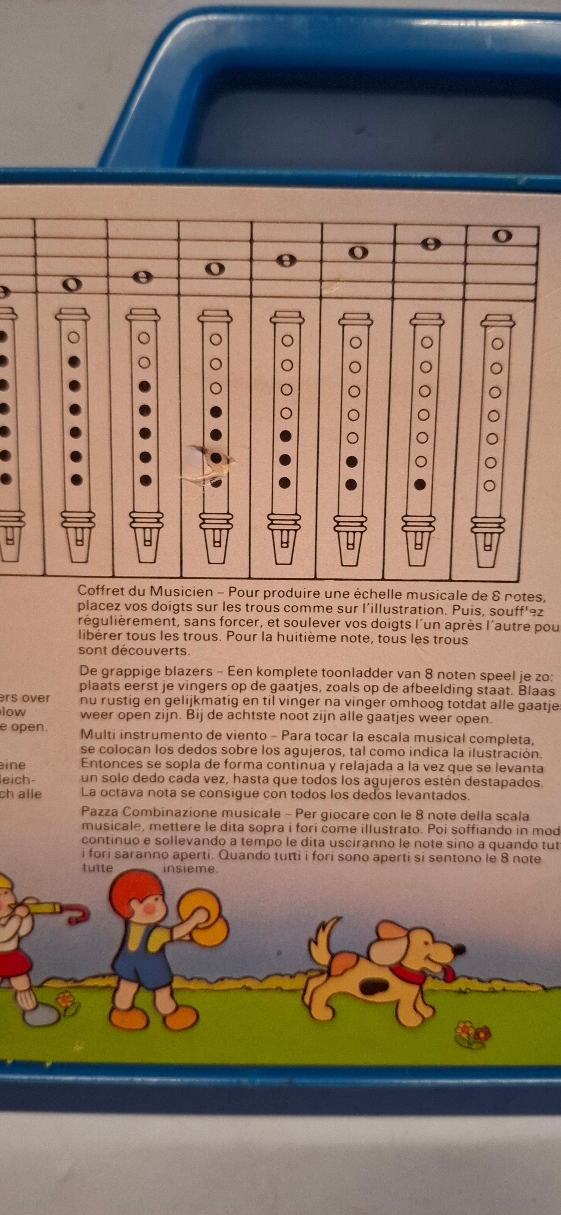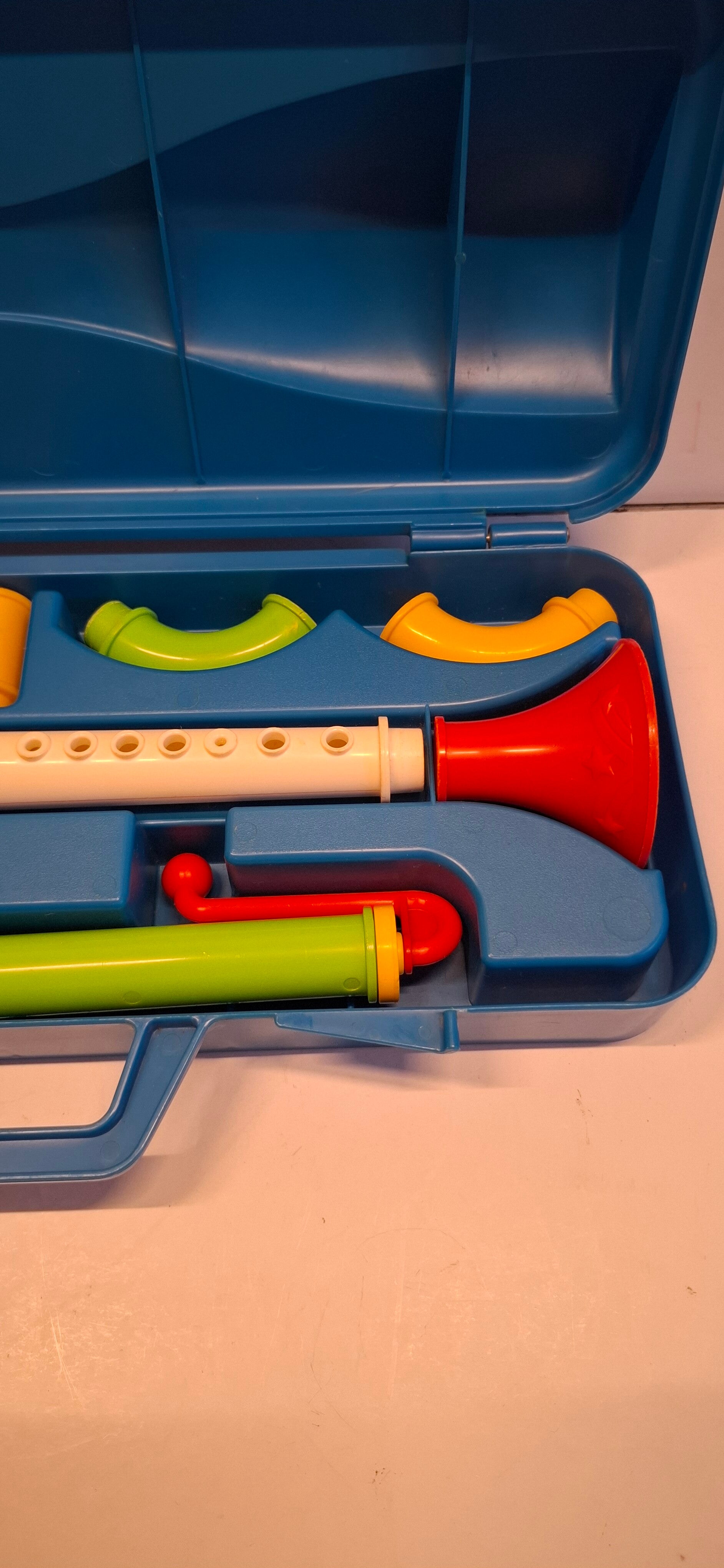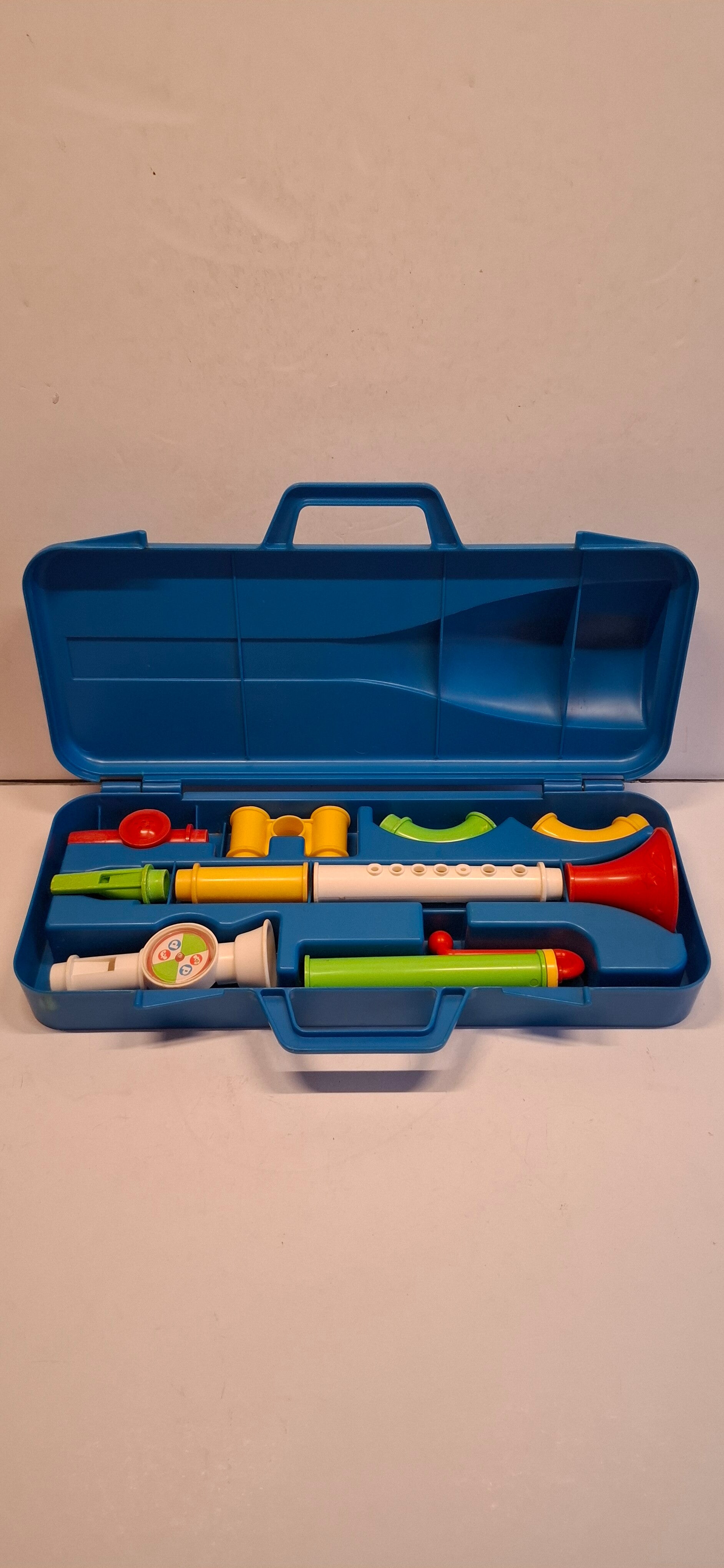 - Inhoud: De set bestaat uit 10 kleurrijke onderdelen, waaronder mondstukken, buizen en een hoorn, die in een blauwe draagkoffer zitten.