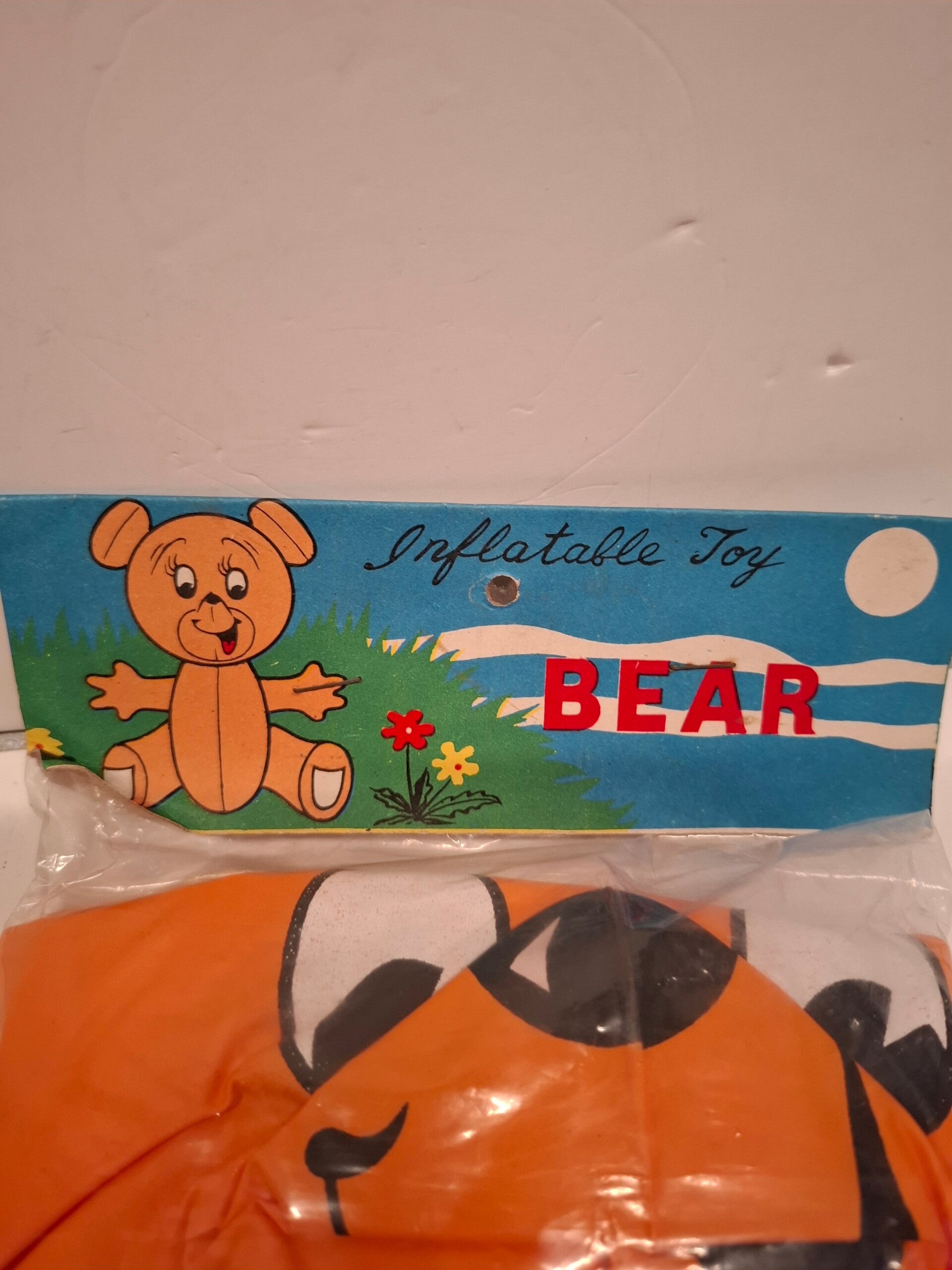 opblaasbare beer, verpakt in zijn originele verpakking met een kartonnen label waarop "Inflatable Toy BEAR" staat.