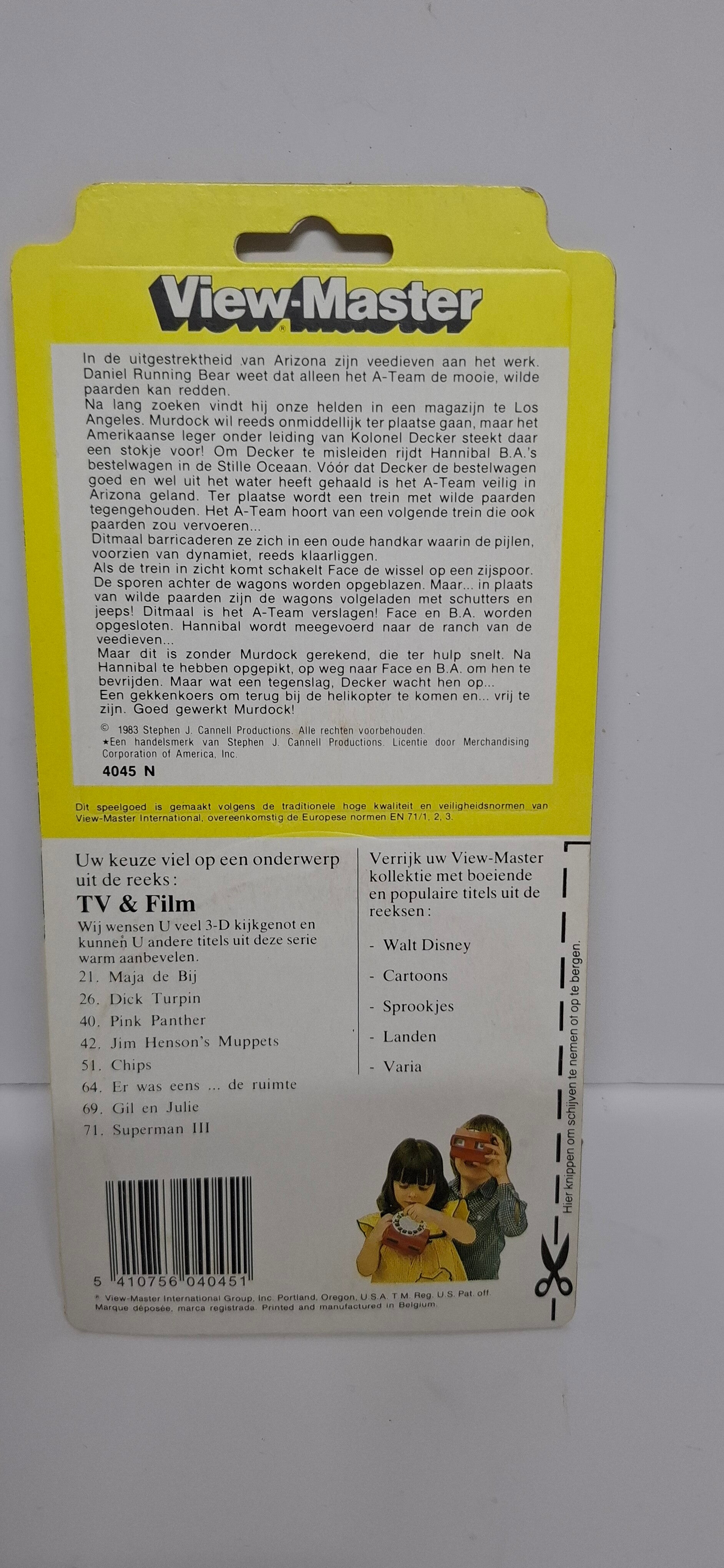 Dit is een vintage View-Master gesealde ongeopende 3D set van "The A-Team", uitgebracht in 1983. Deze specifieke uitvoering, herkenbaar aan het nummer 77 op de verpakking, is een Nederlands/Franstalige editie ("3 Schijven: 21 Beelden").