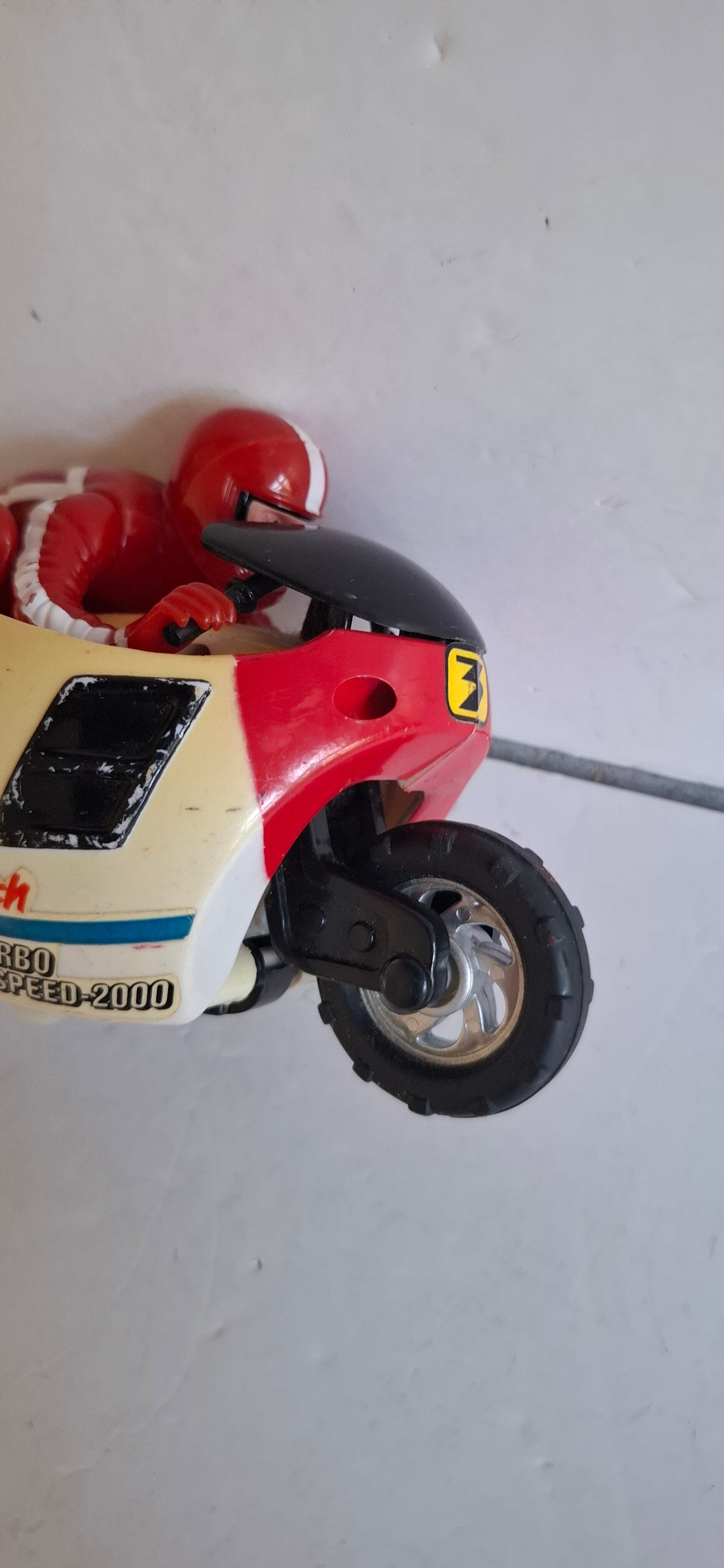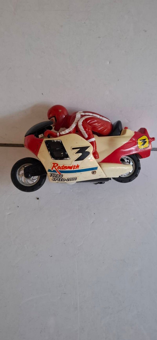 vintage Redsmith Turbo Speed-2000 motorfiets, geproduceerd rond 1992. Het betreft een batterijgevoed verzamelobject met een "Bump & Go" mechanisme, wat betekent dat de motor automatisch van richting verandert als hij ergens tegenaan rijdt.